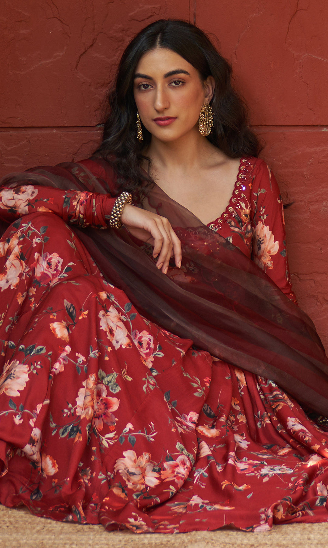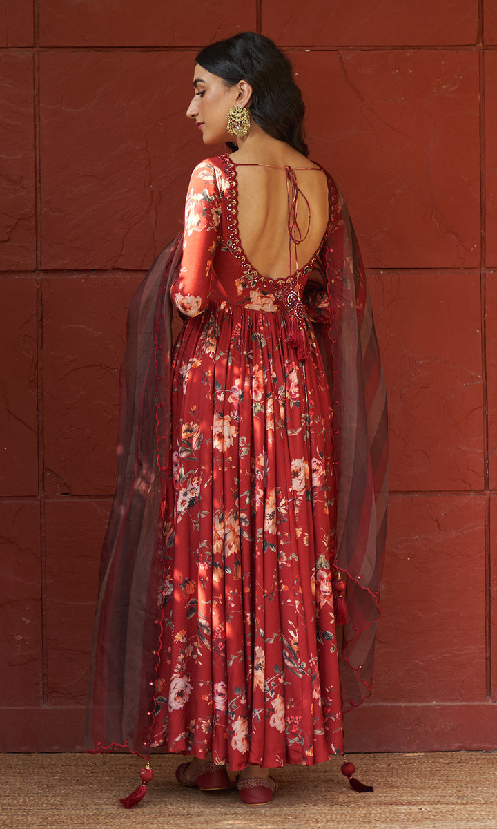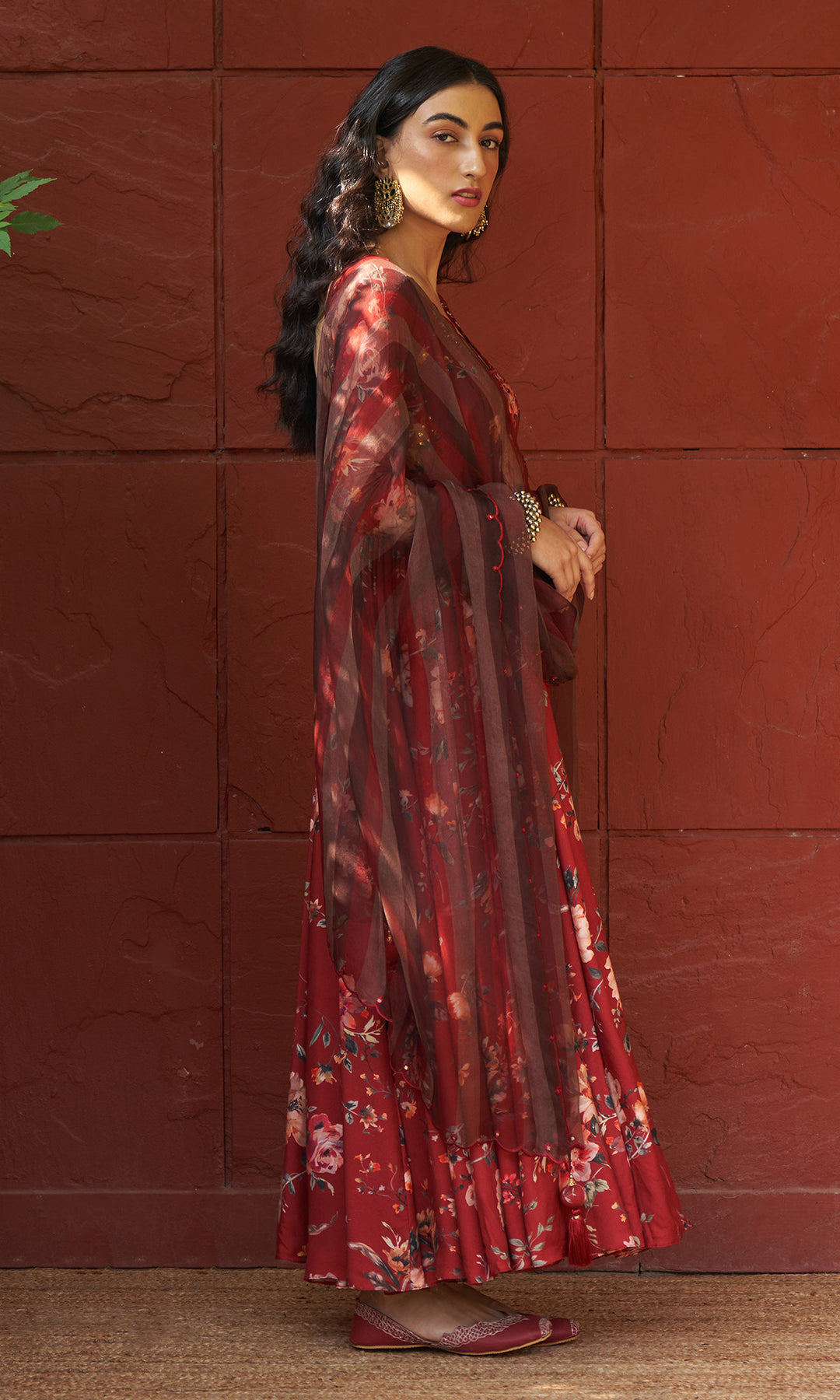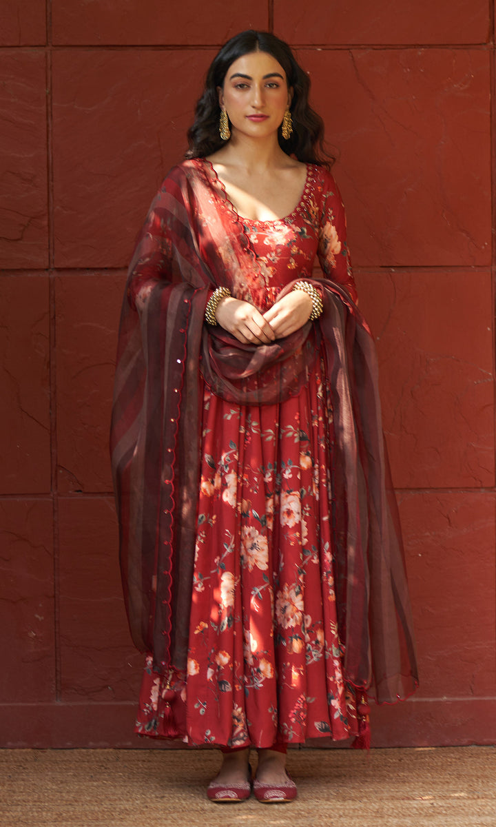 Bagh - Red Floral Printed Anarkali Set -set of 3