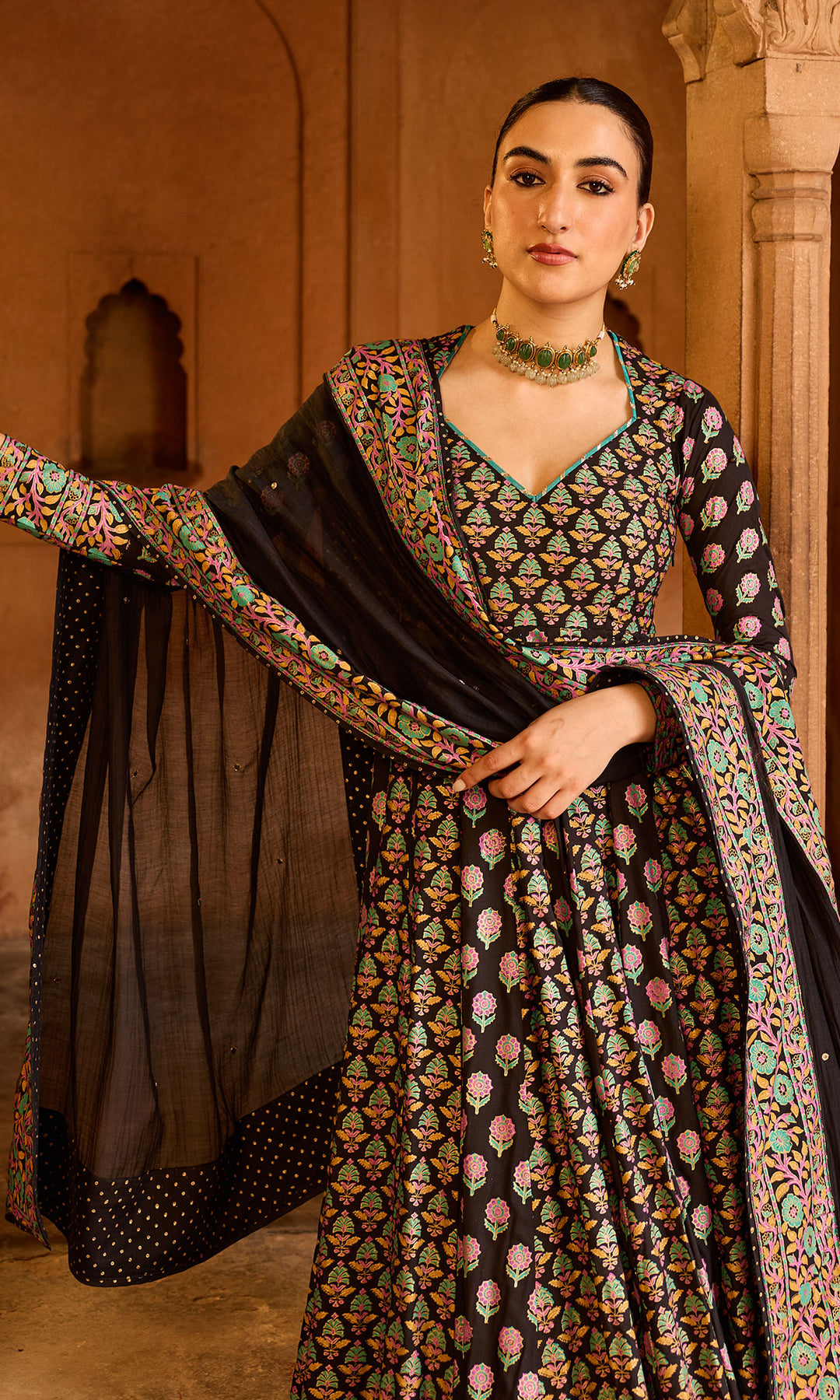 Boond 3.0 black block printed anarkali with palazzo and dupatta (Set of 3)