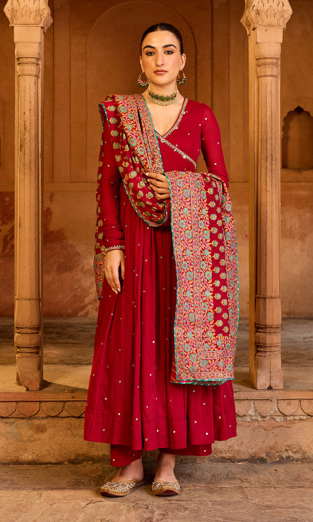 Boond 3.0 red solid angrakha anarkali with palazzo and dupatta (set of 3)