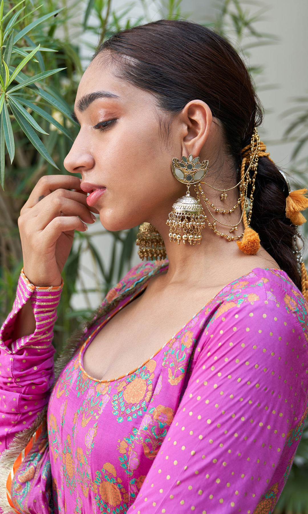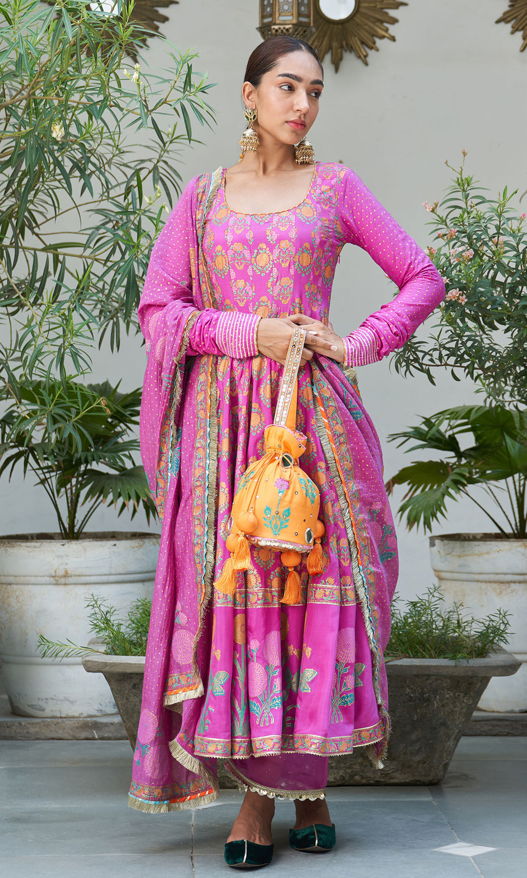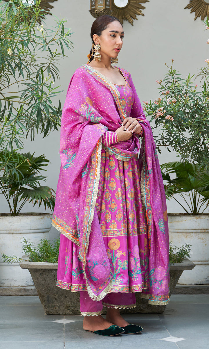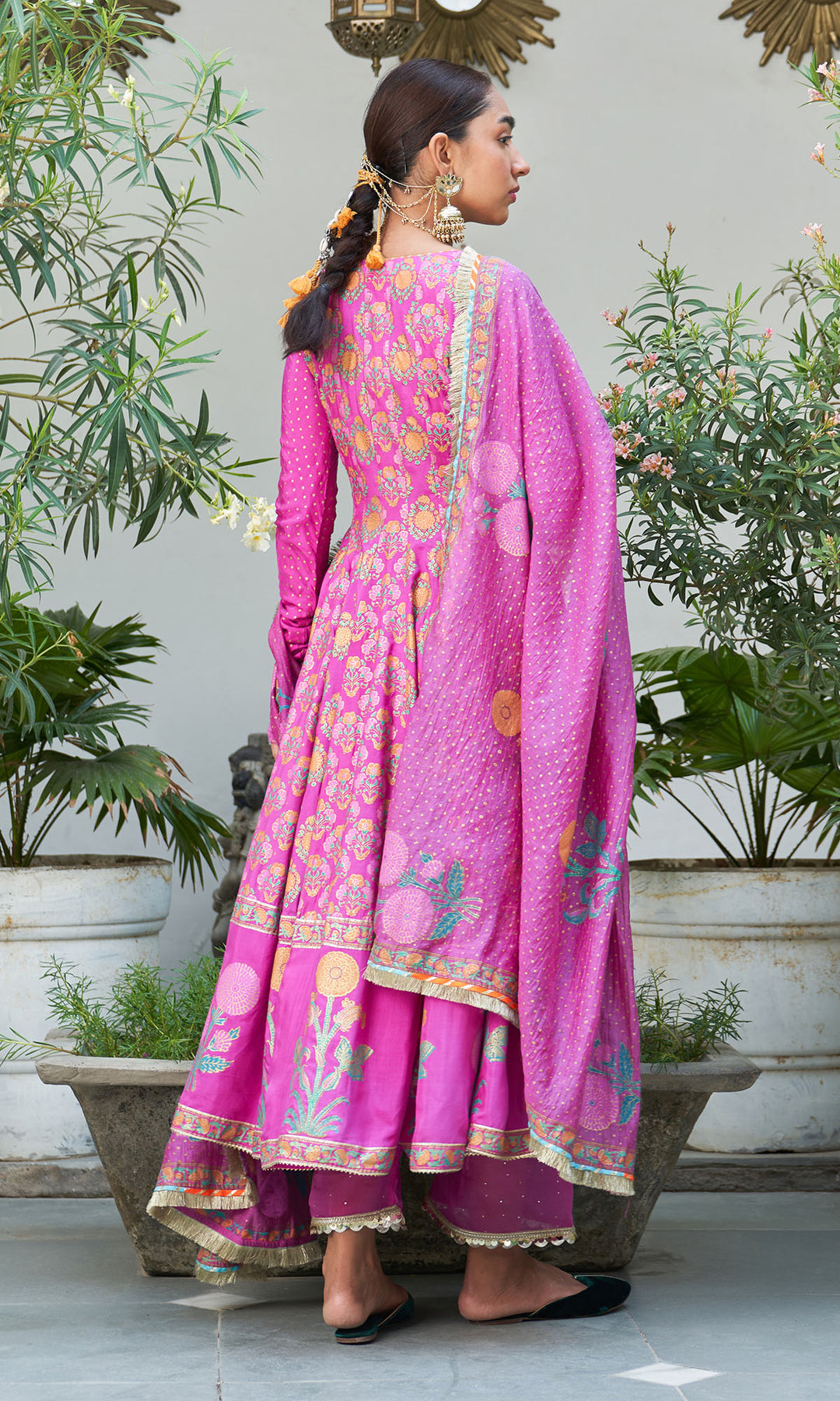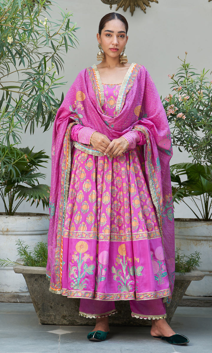 Boond Vol. 2 Pink Block Printed Anarkali With Solid Palazzo And  Mughal Boota Dupatta Set Of 3