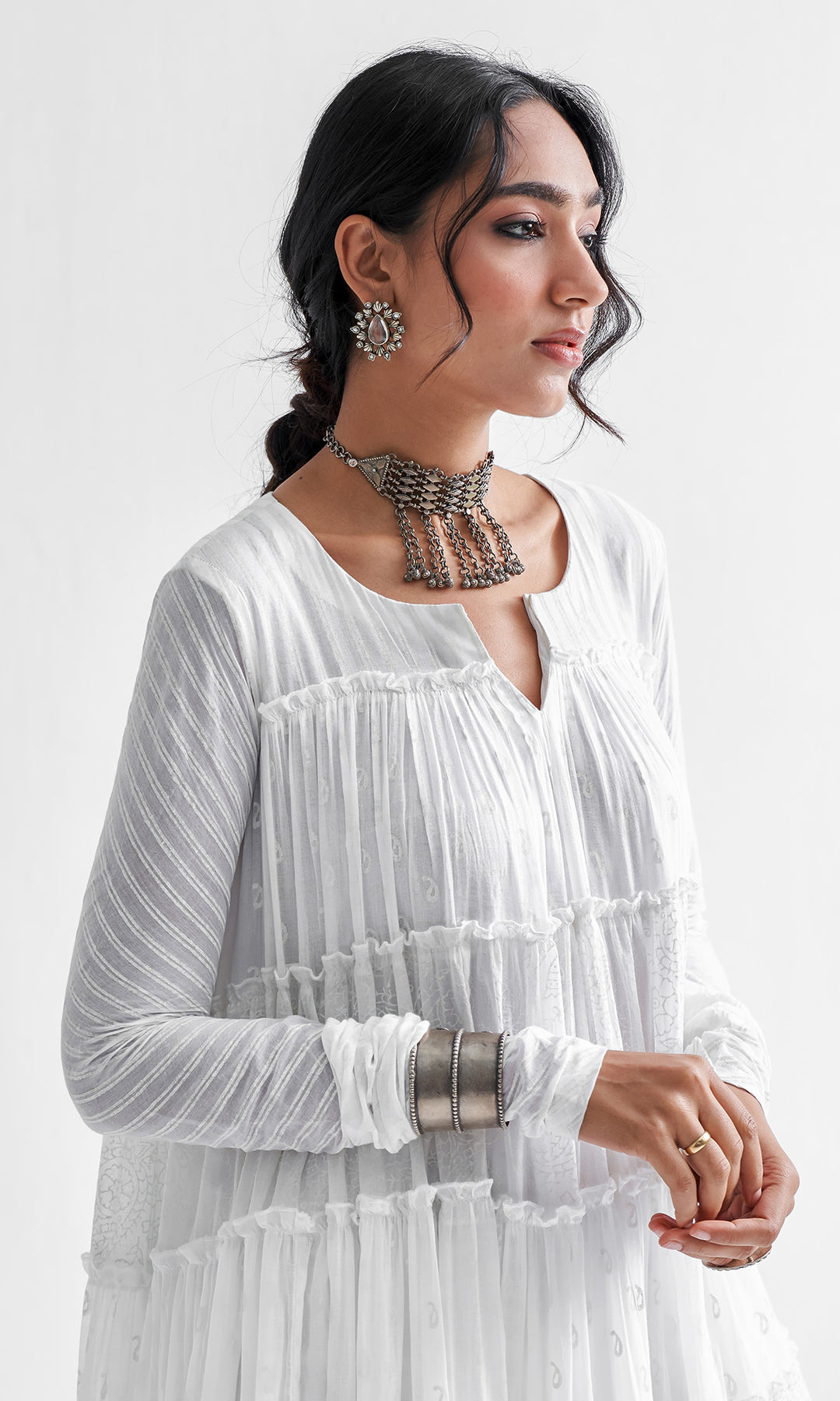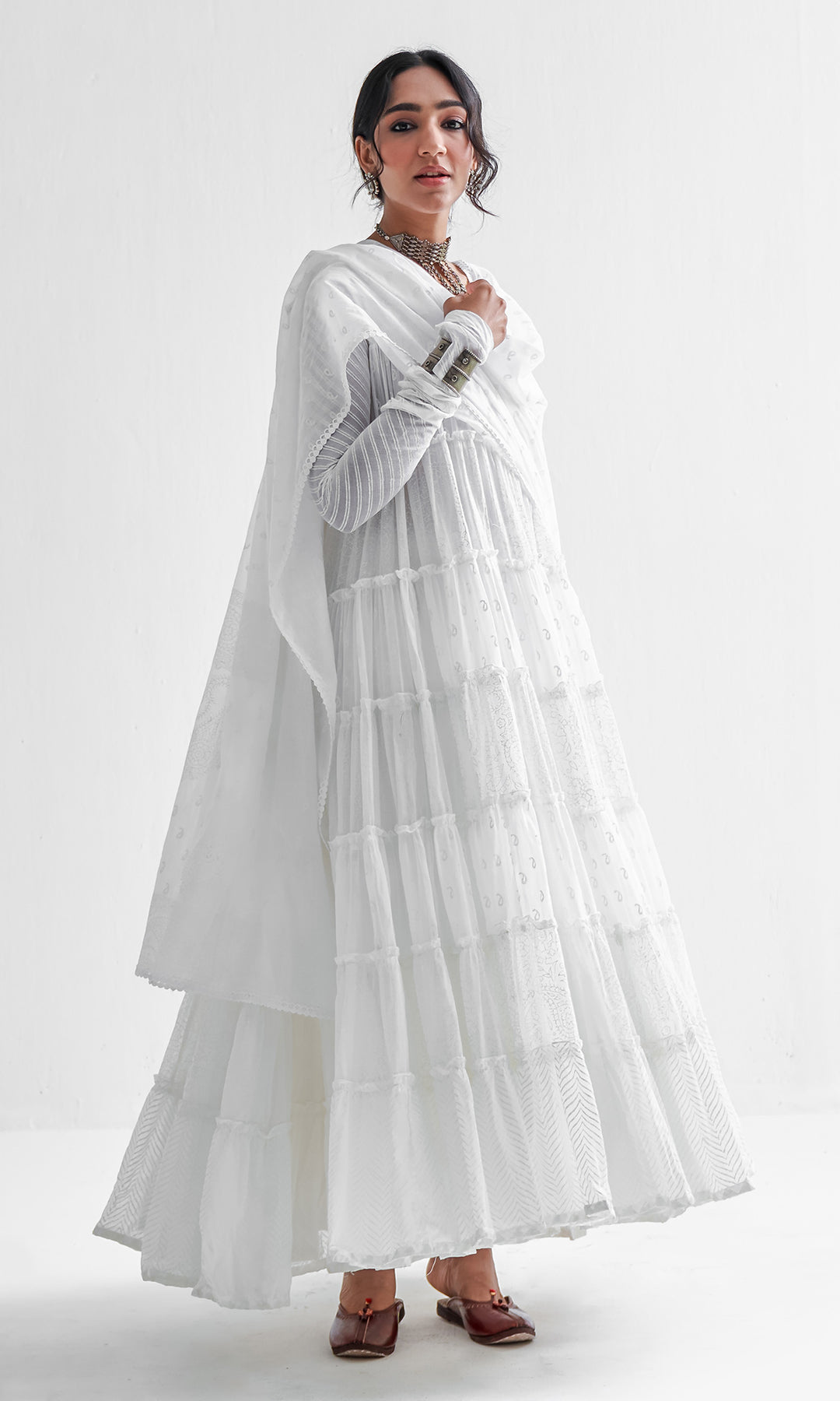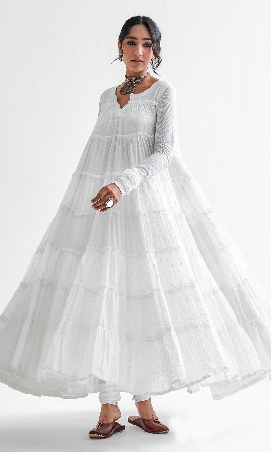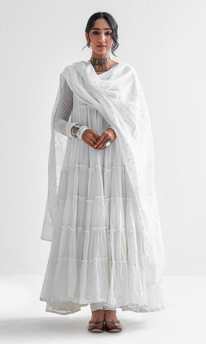 Firdaus Khari White Block Printed Tiered Anarkali - Set of 3