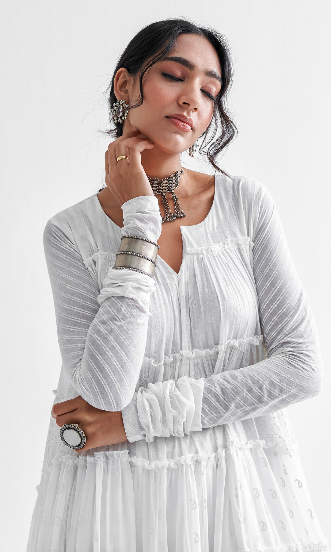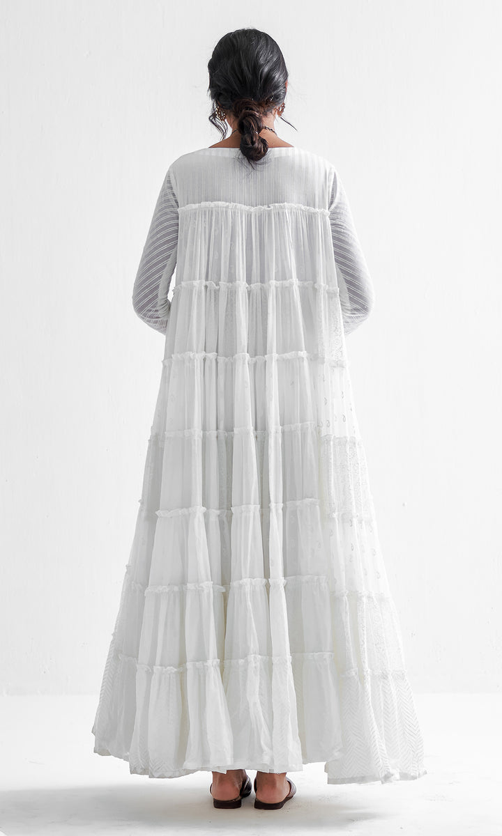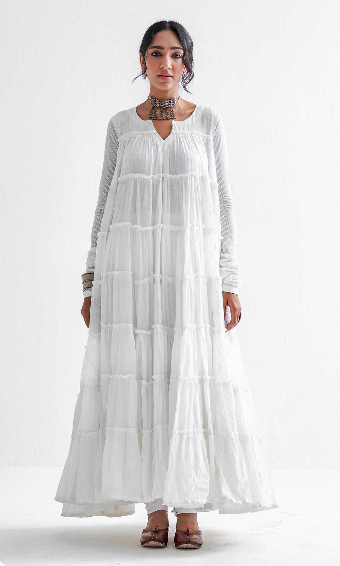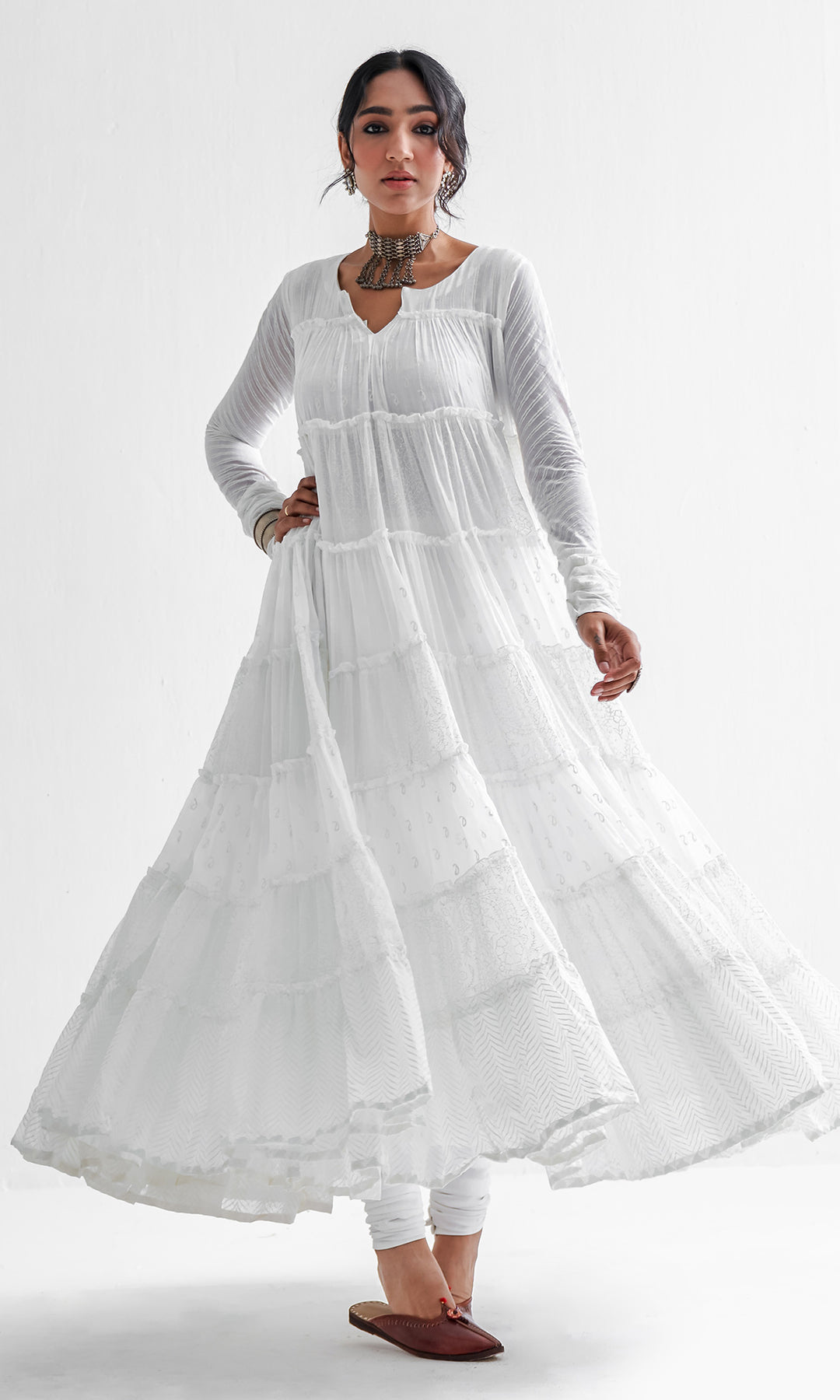Firdaus Khari White Block Printed Tiered Anarkali - Set of 3