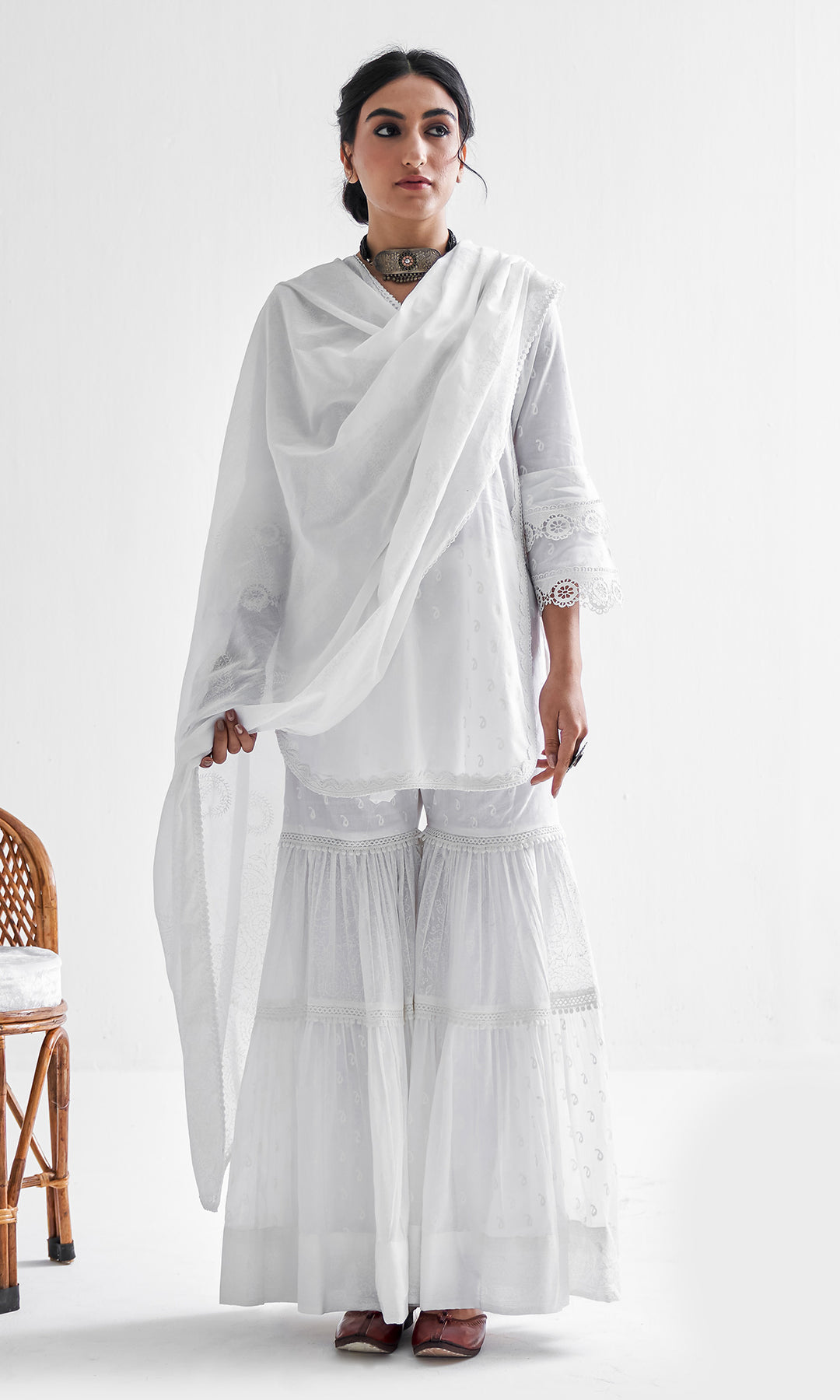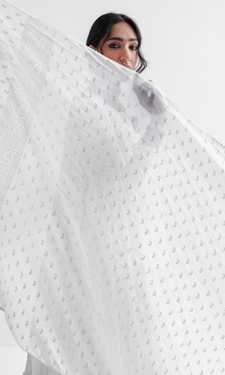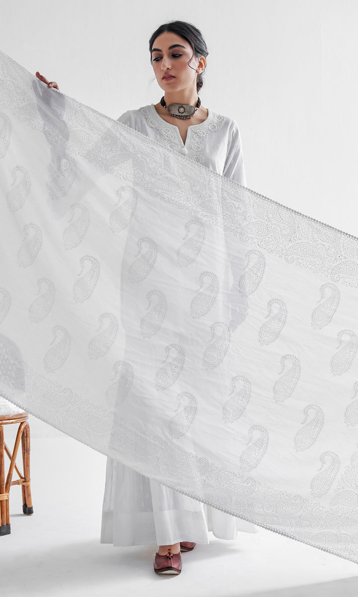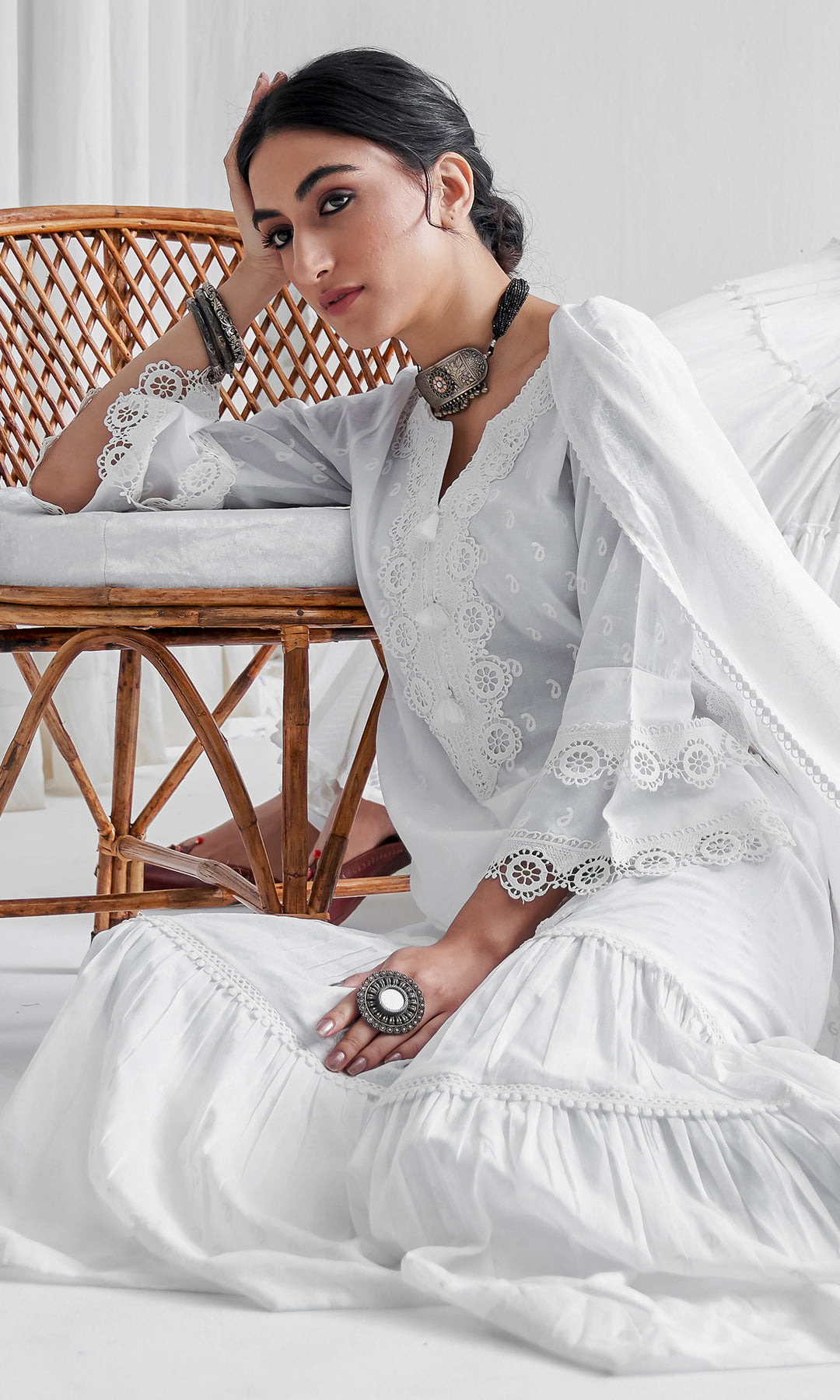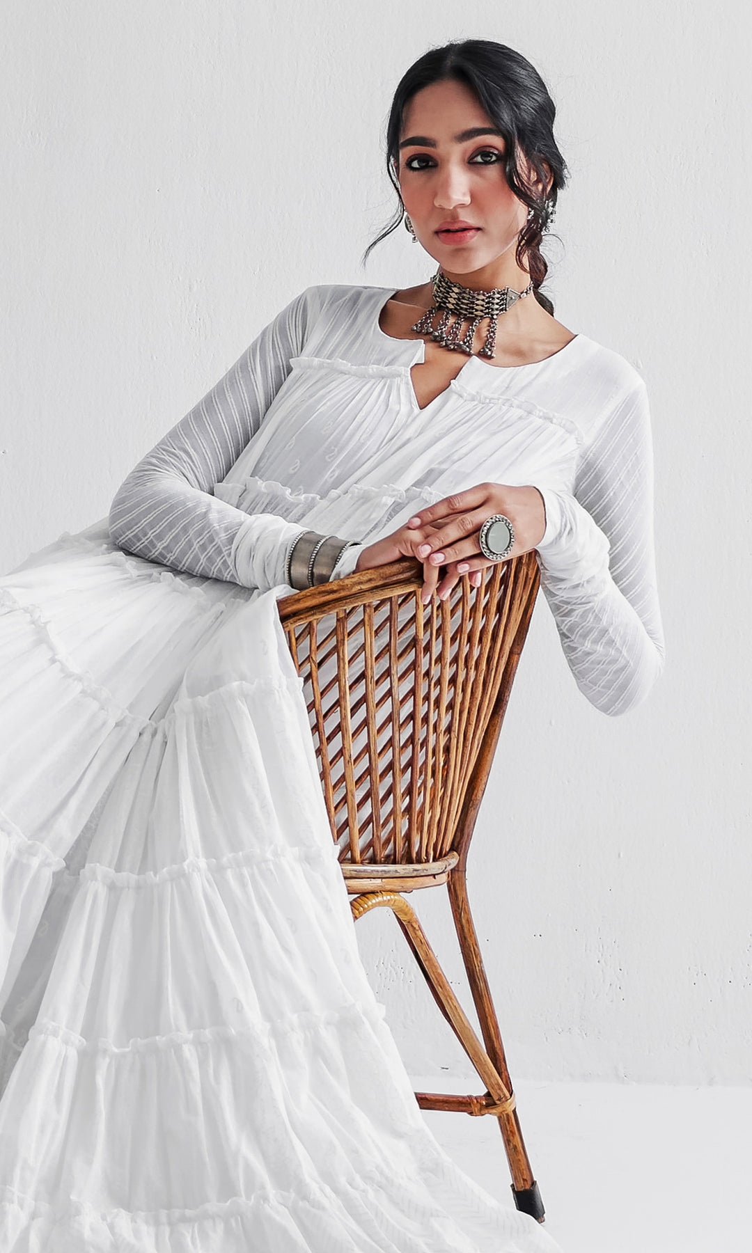 Firdaus Khari White Block Printed Tiered Anarkali - Set of 3