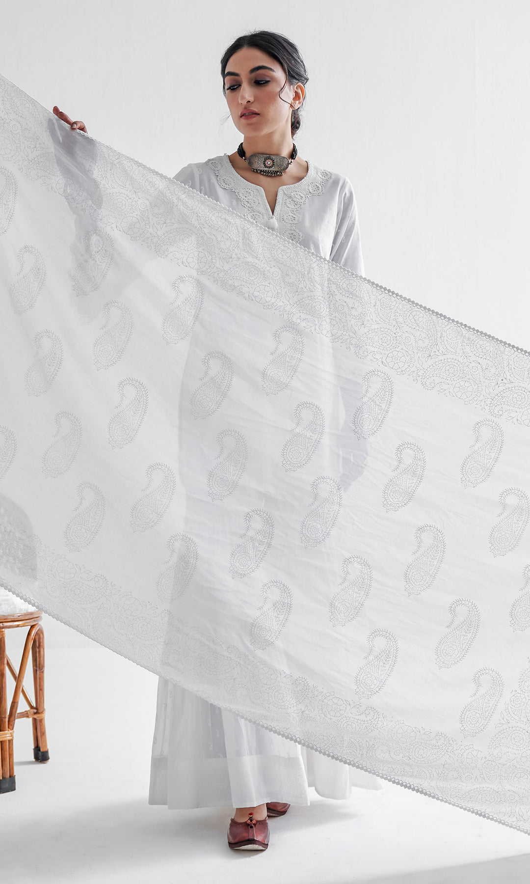 This set includes khari block printed tiered anarkali, churidar and dupatta. Anarkali is in tiers and has churidar sleeves. It comes with churidar. Dupatta has lace detailing on all four sides.