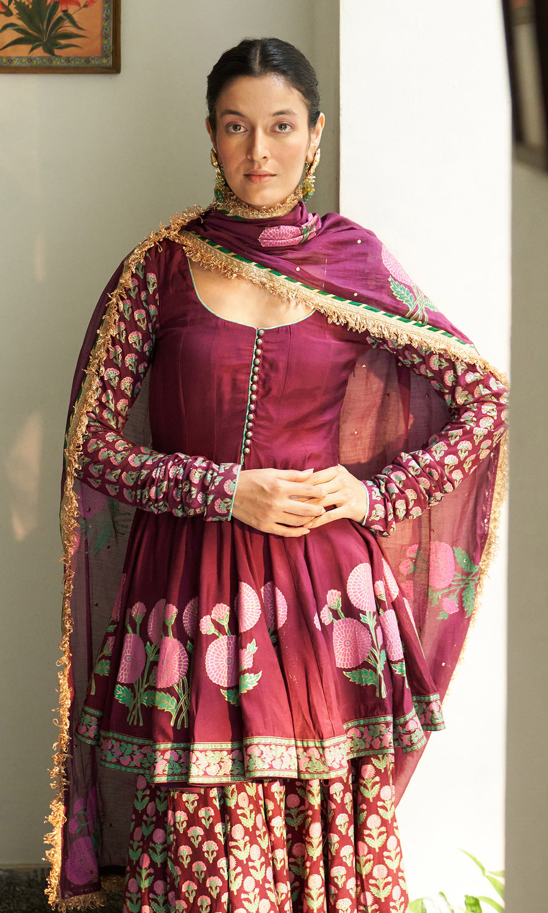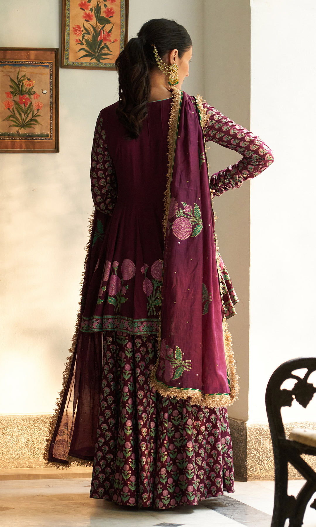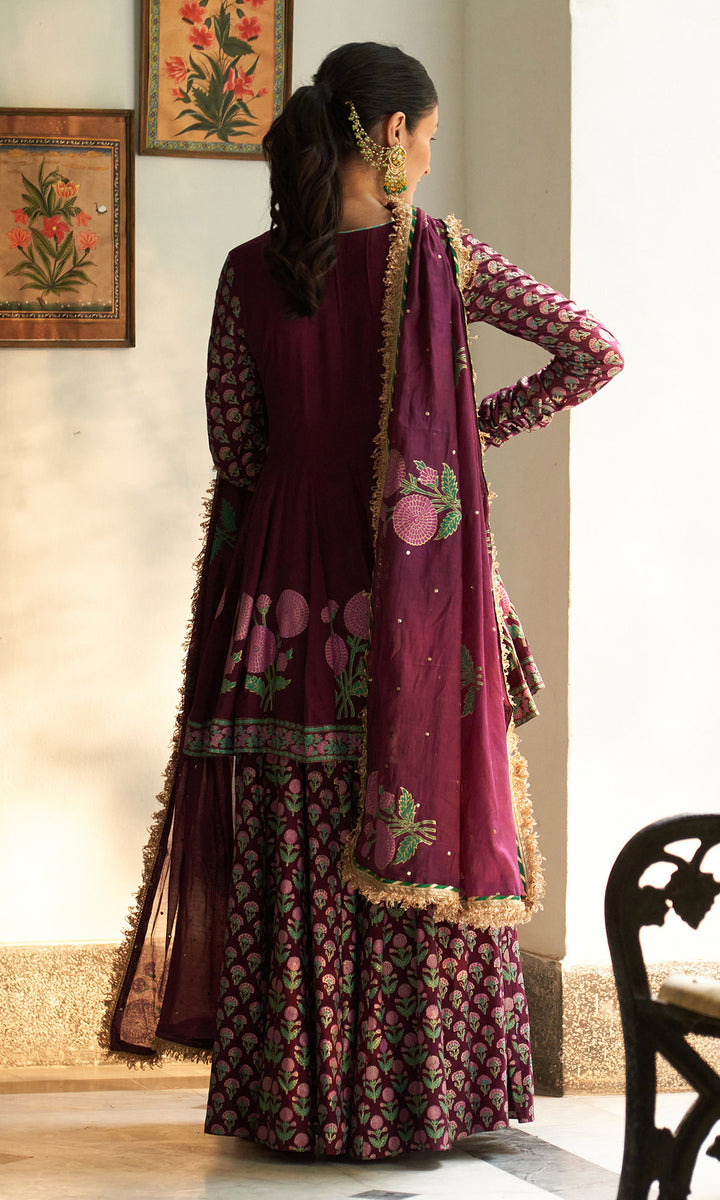 Ghazal Block Printed Wine Short Anarkali with Sharara and Mukaish Dupatta set of 3