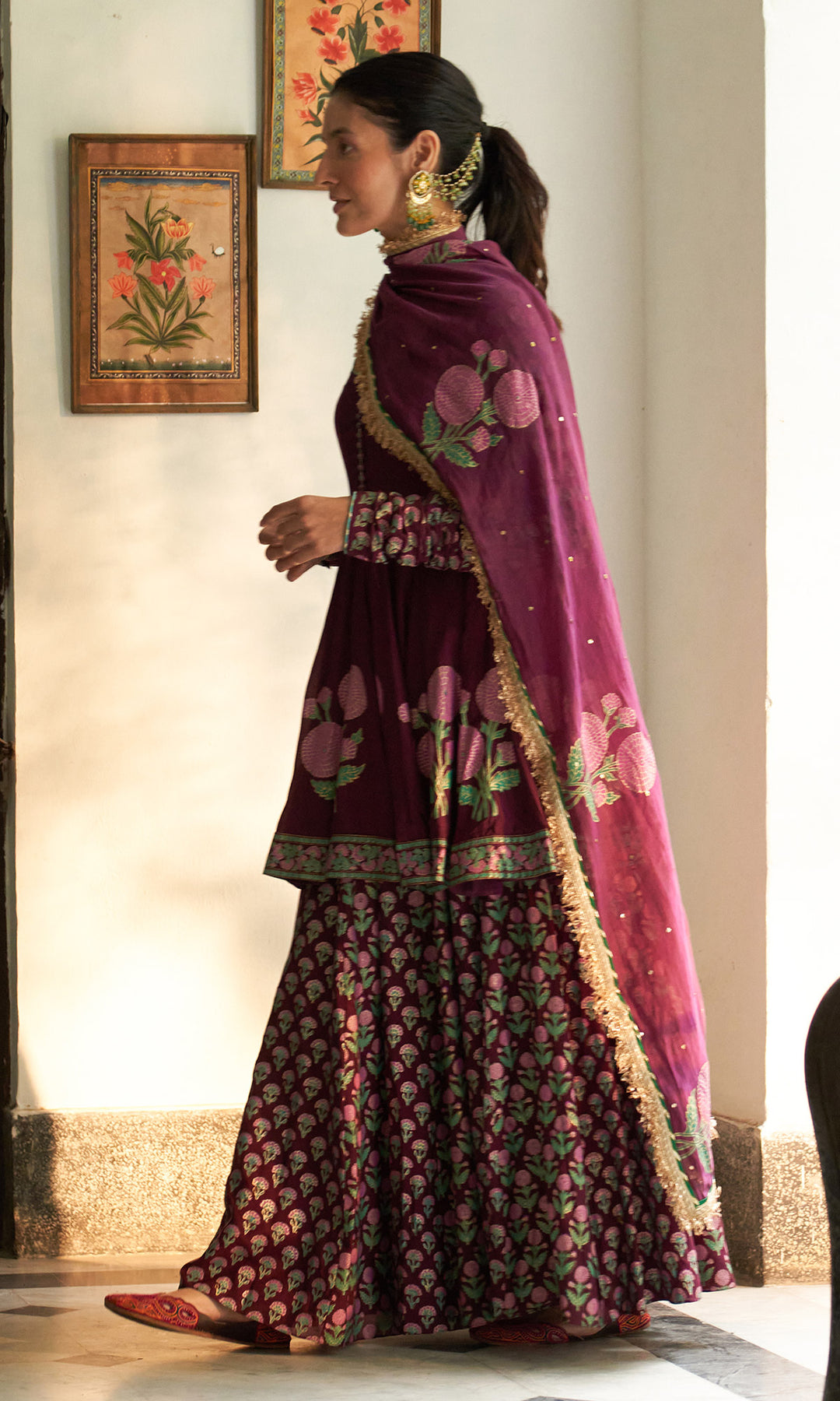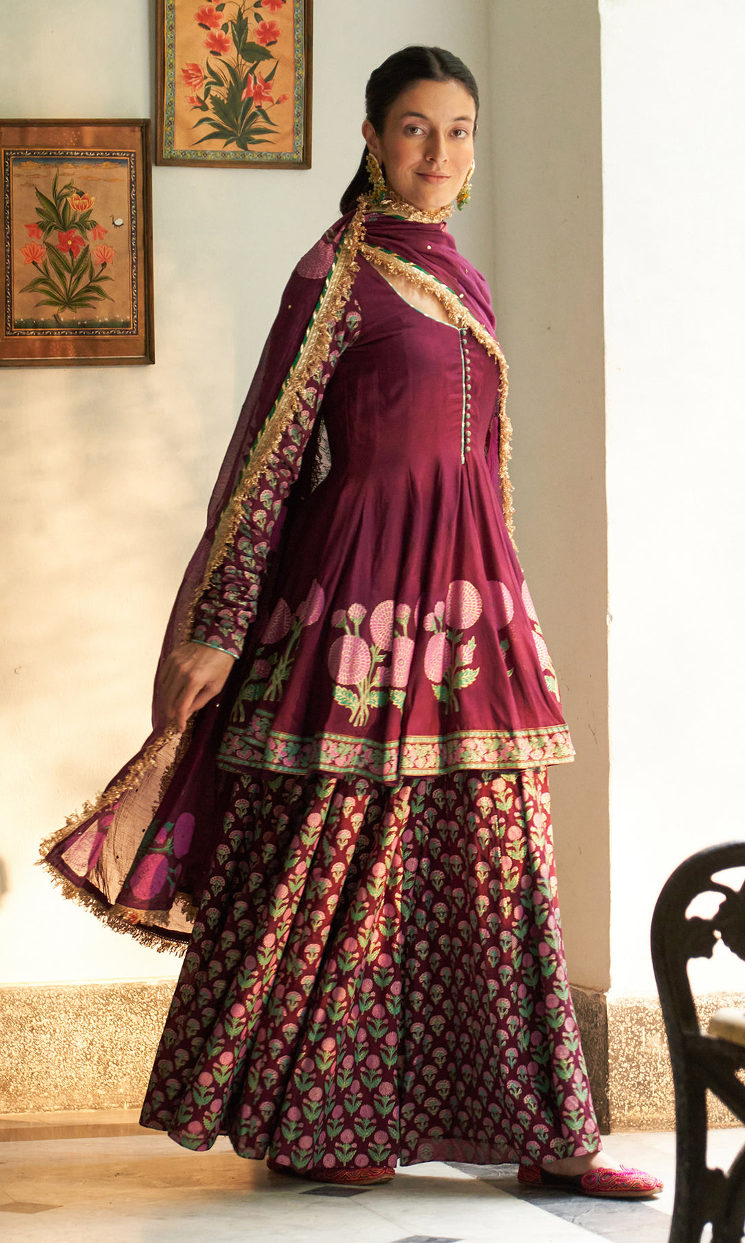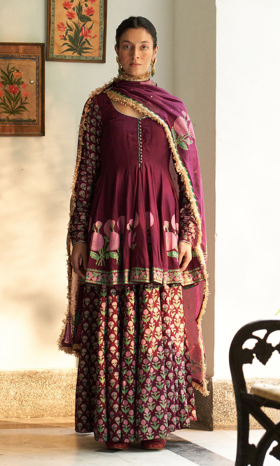 Ghazal Block Printed Wine Short Anarkali with Sharara and Mukaish Dupatta set of 3