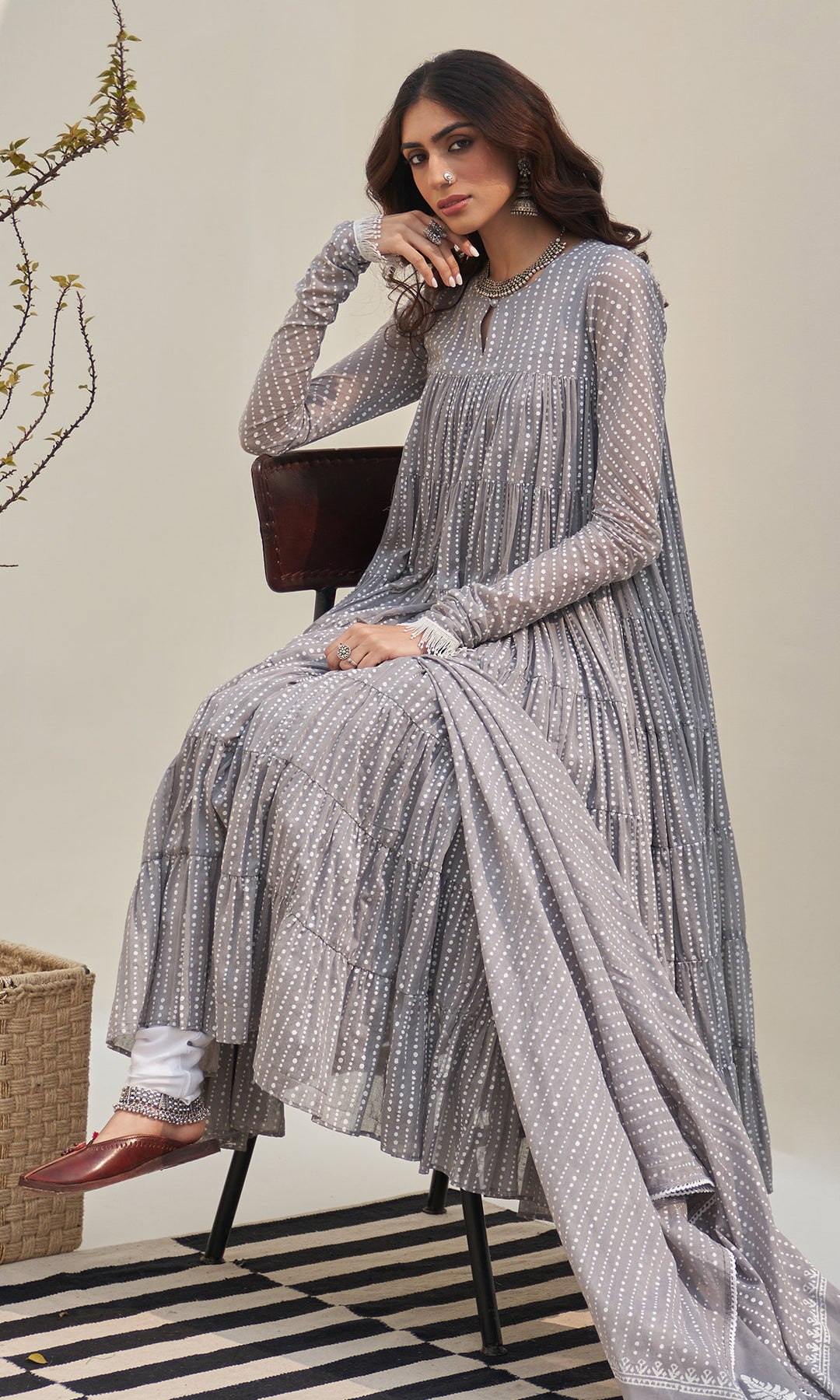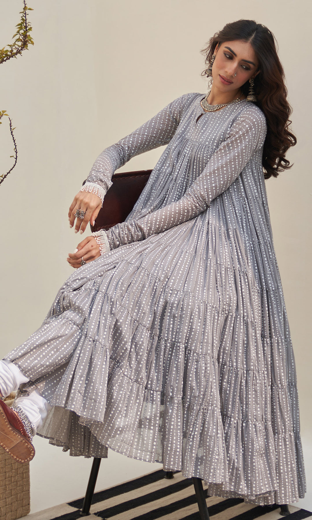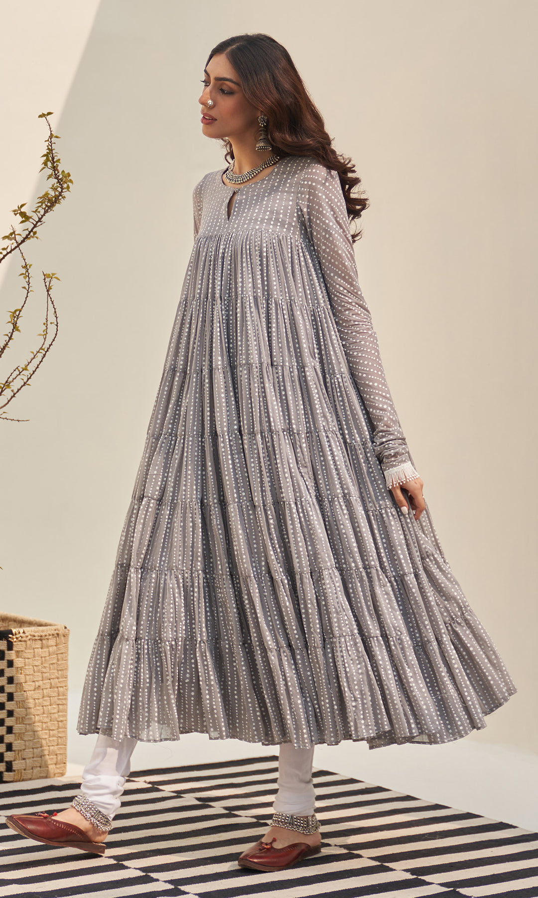 This set includes block printed tiered anarkali , chooridar and dupatta. It comes with rayon chooridar and block printed dupatta finished with lace.