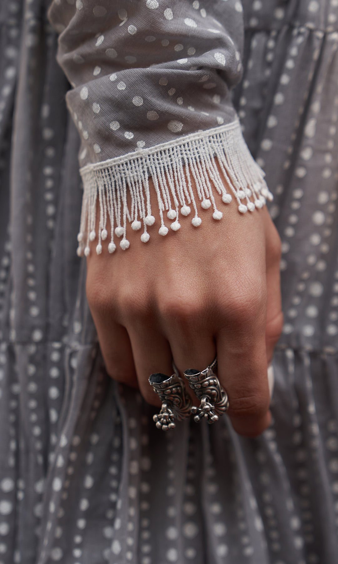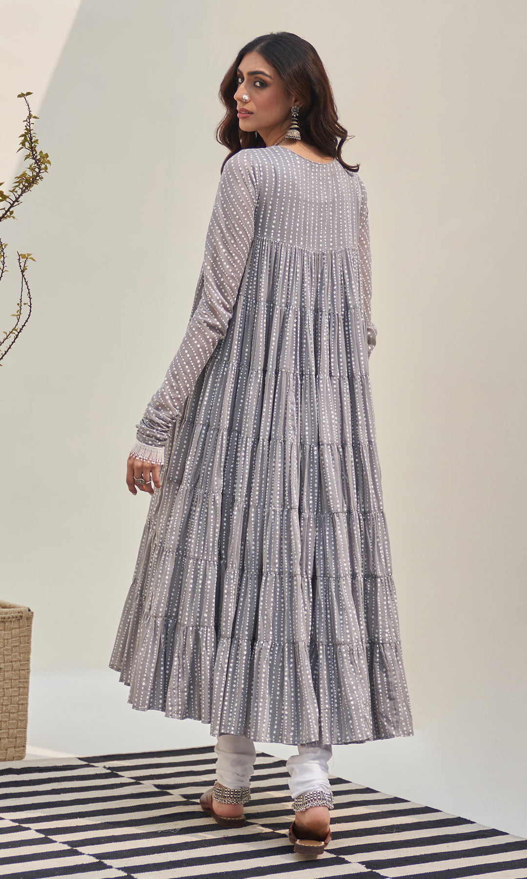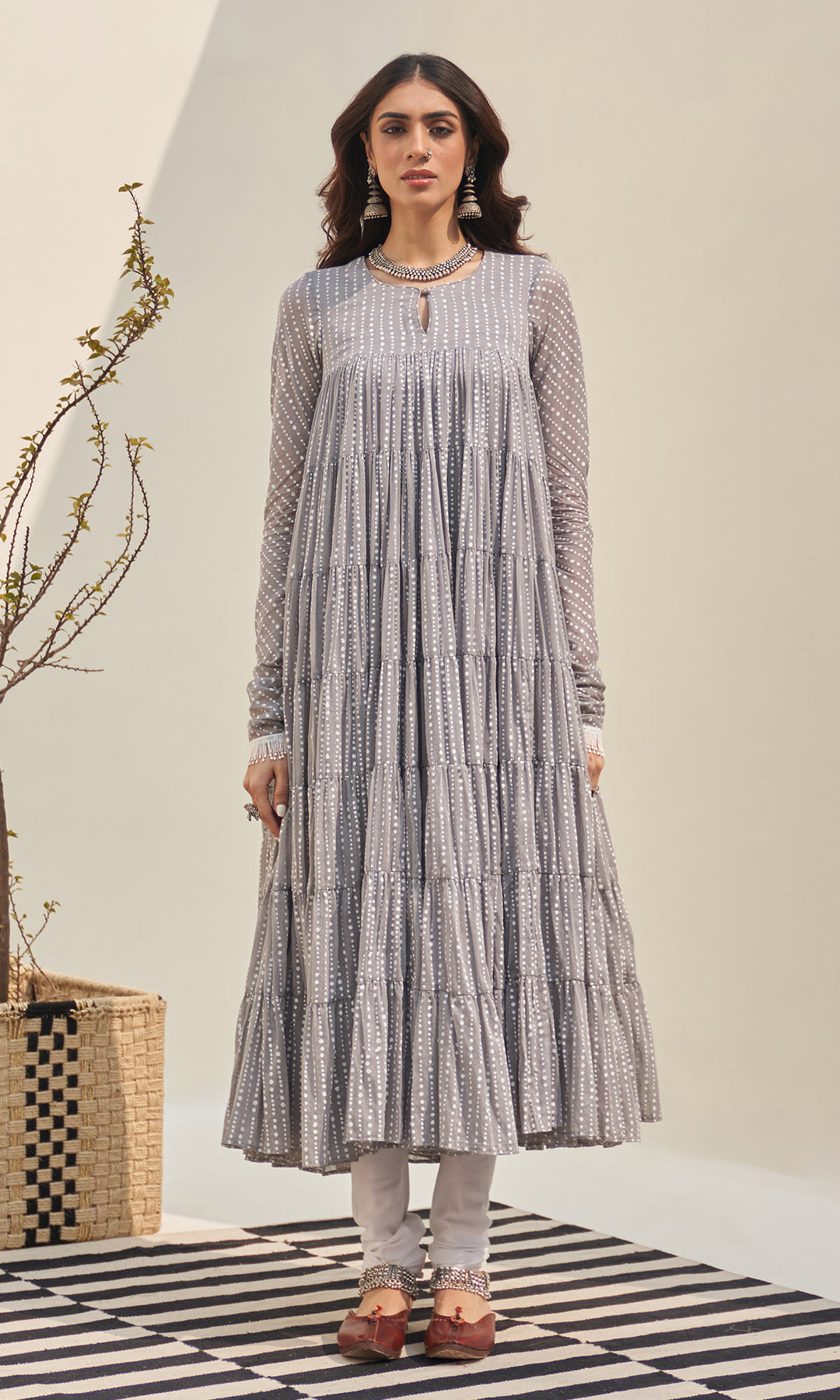 This set includes block printed tiered anarkali , chooridar and dupatta. It comes with rayon chooridar and block printed dupatta finished with lace.