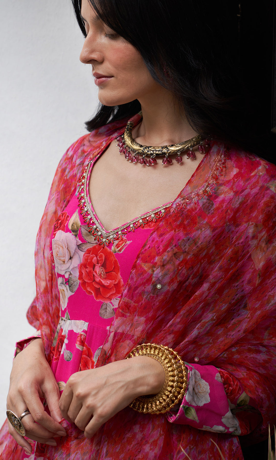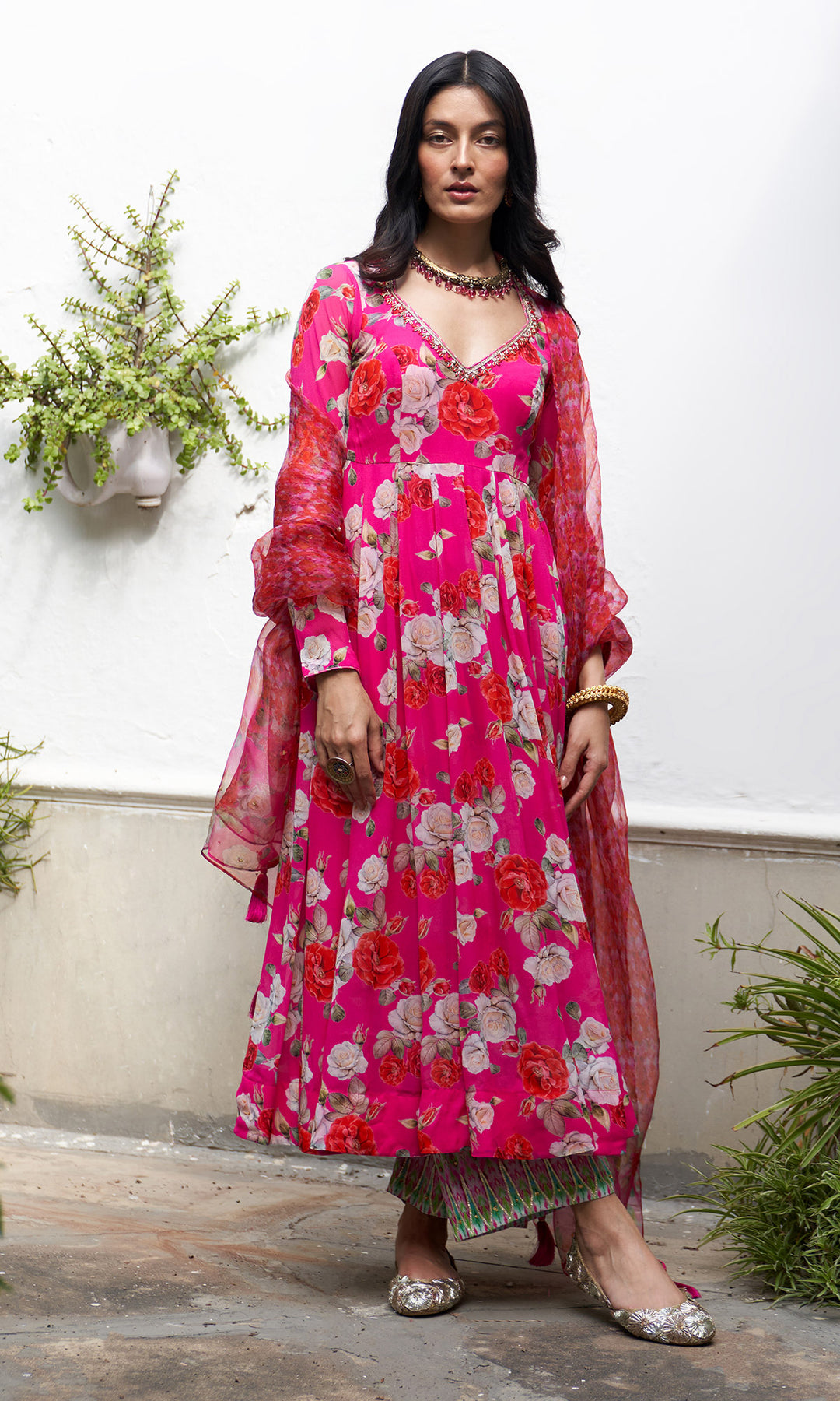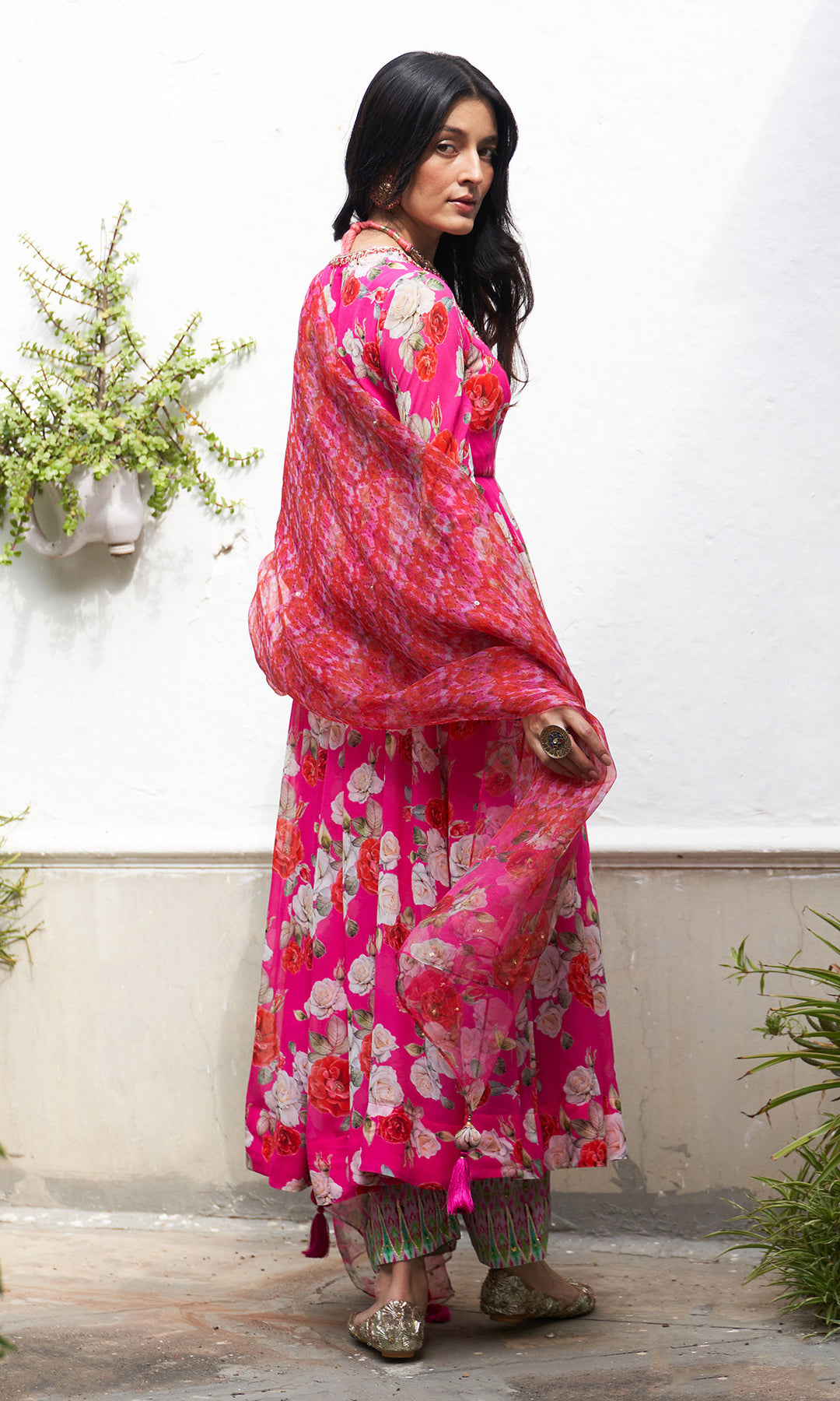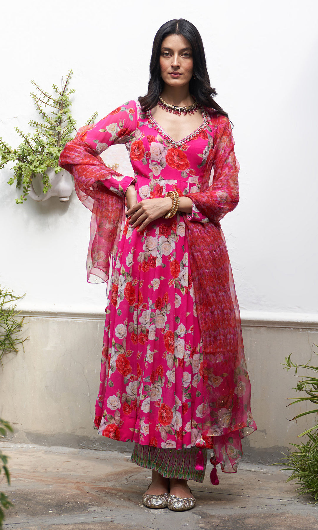 This set includes Pink floral anarkali with palazzo and Organza dupatta. Anarkali is detailed with hand embroidery and gota piping on neck and sleeves.Pink floral palazzo is detailed with delicate sequins work and gota work on ikat border.Organza dupatta is finished with sequins embroidery ,gota piping and tassels