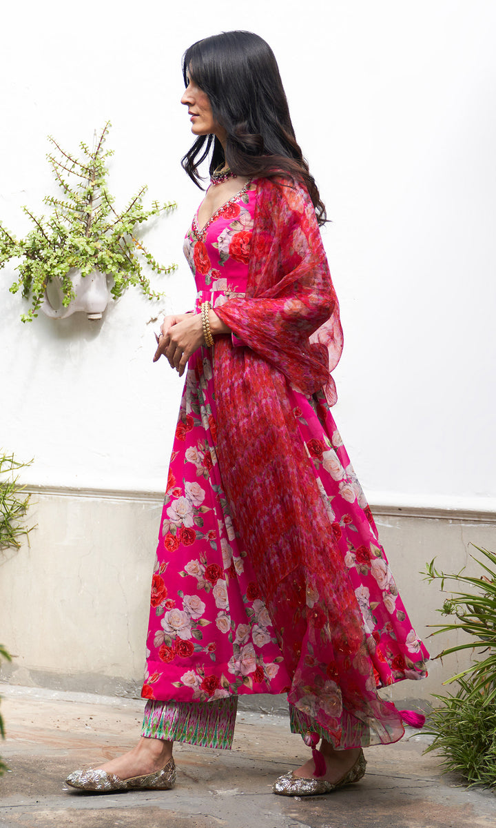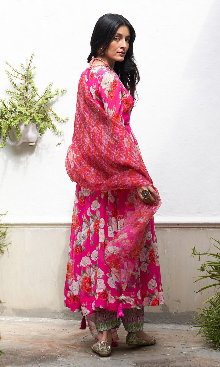 Gulafsha Pink Floral Anarkali With Ikat Border Palazzo And Organza Dupatta( Set Of 3)