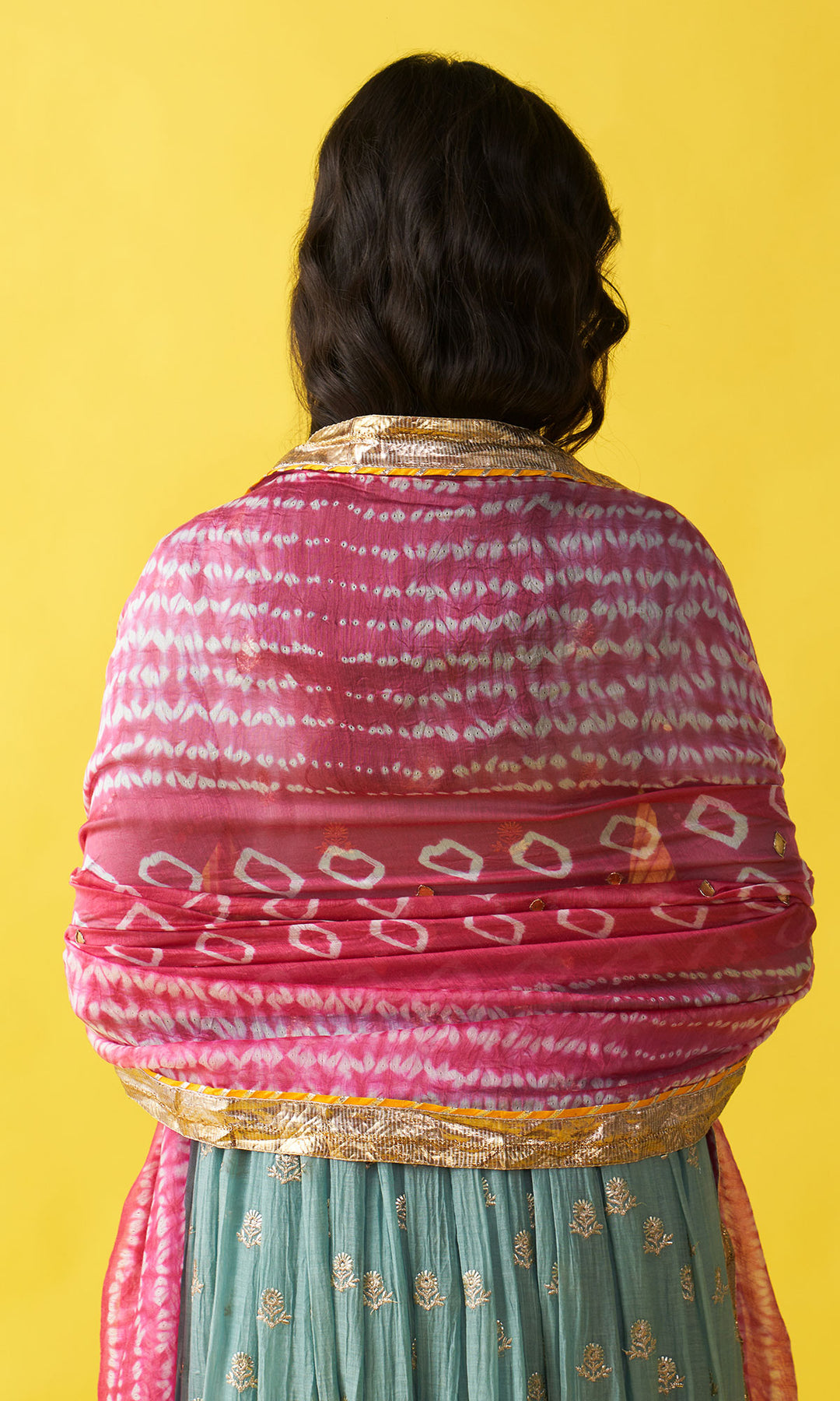 This set includes angrakha anarkali with palazzo and shibori dupatta . Anarkali is detailed with hand embroidery and tassels. Palazzo is detailed with organza and hand embroidery. Shibori dupatta is detailed with gota patti work and finish with gota tassels.