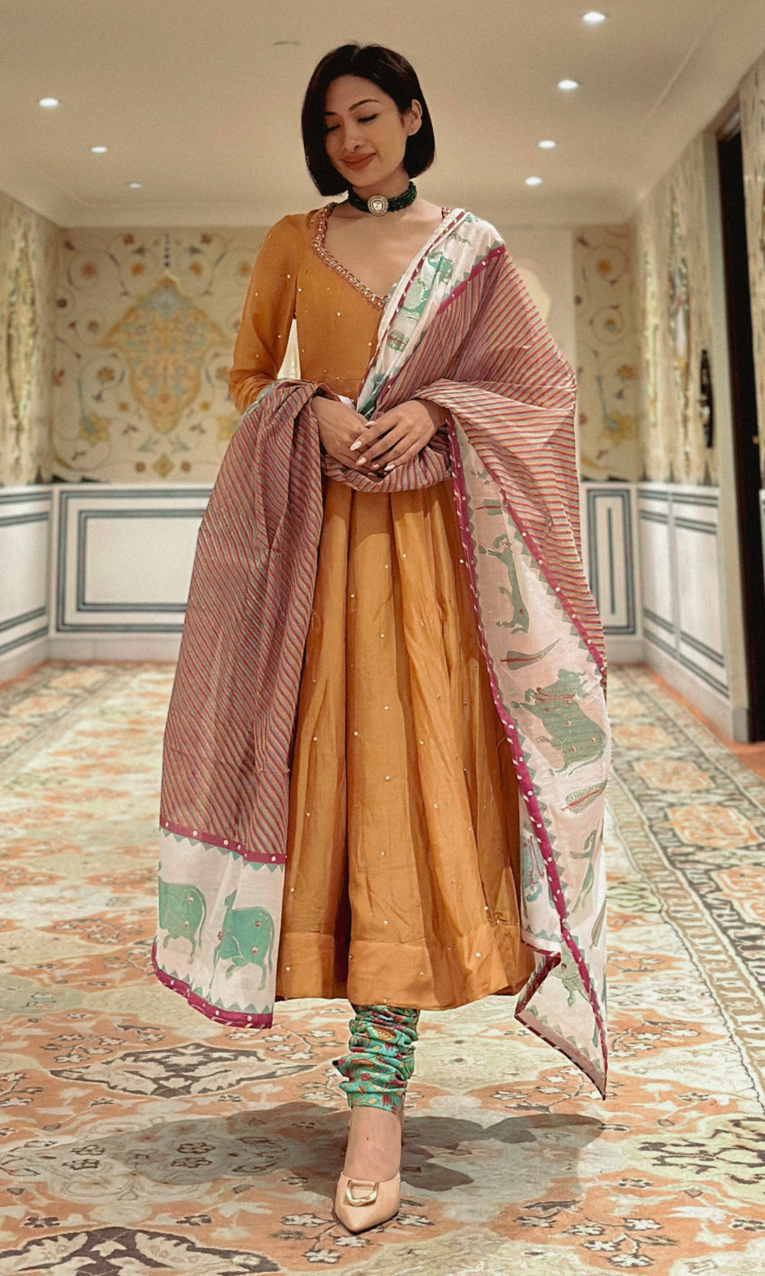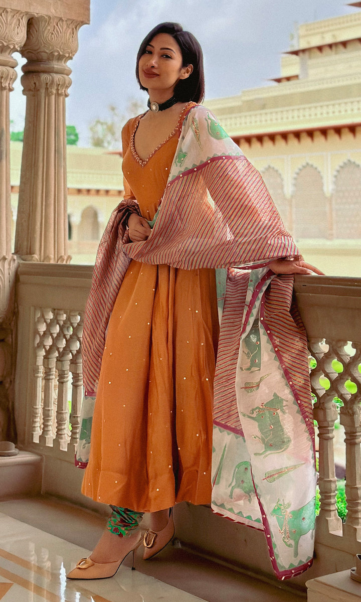 This set includes hand block printed Dupatta,solid mustard Anarkali and palazzo.Anarkali neck is detailed with hand work. Sleeves are adorned with lace. It comes with hand block printed chooridar.Dupatta is detailed with hand block print, hand work and lace.