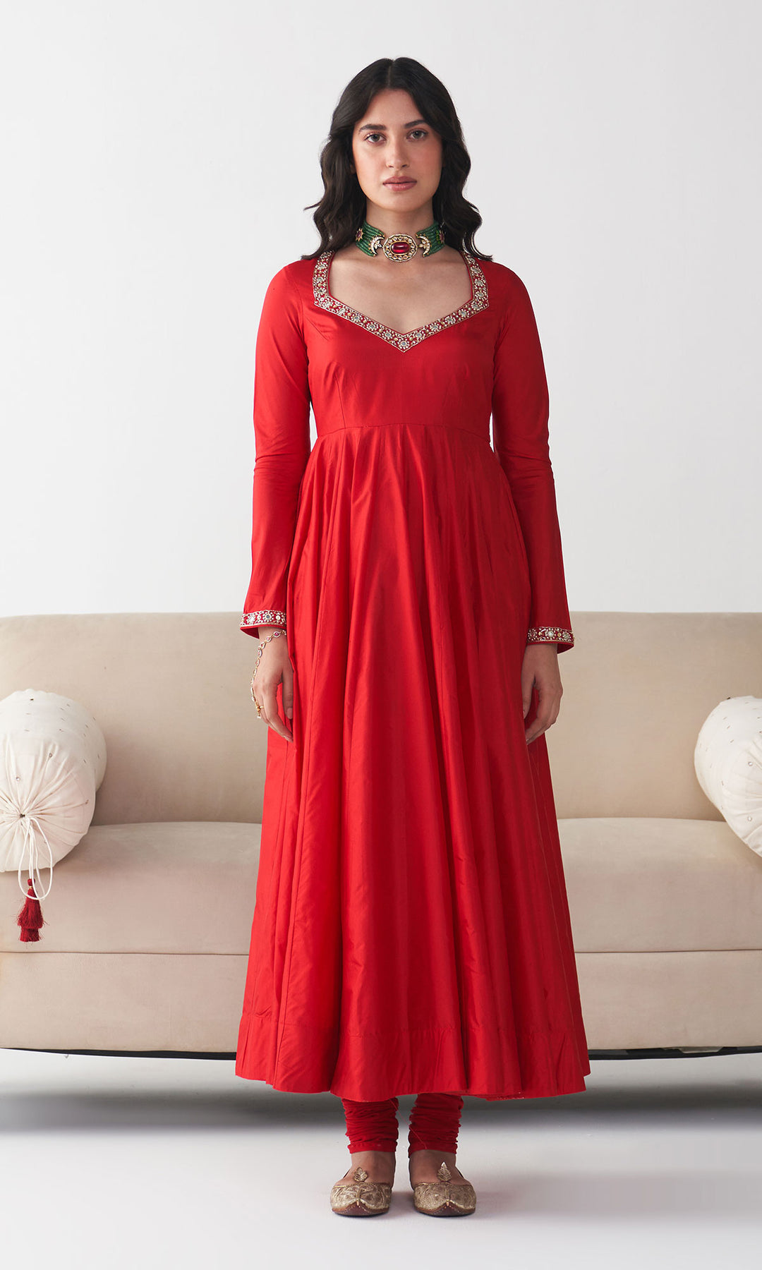 This set includes red silk anarkali with chooridar and hand embroidered dupatta is finish with backing brocade with gota and jhaller