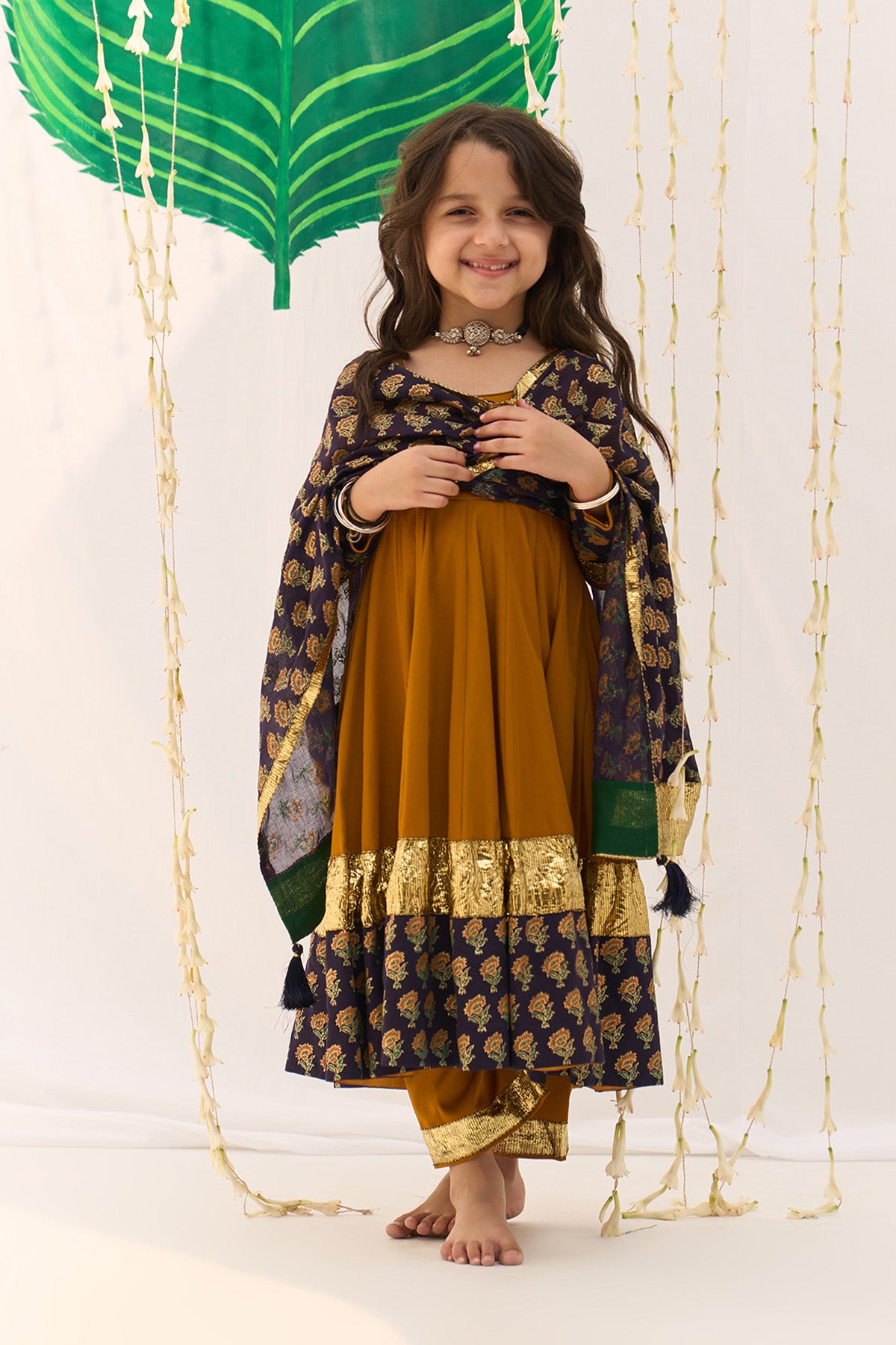 A graceful mustard anarkali highlighted with elegant gota work and a beautifully block