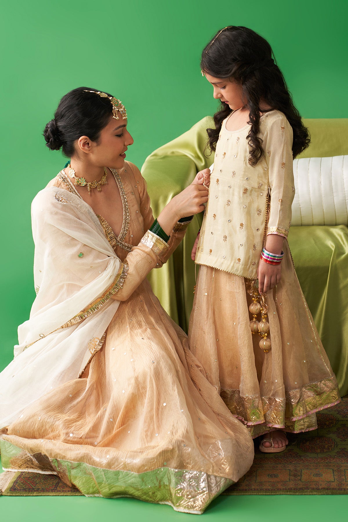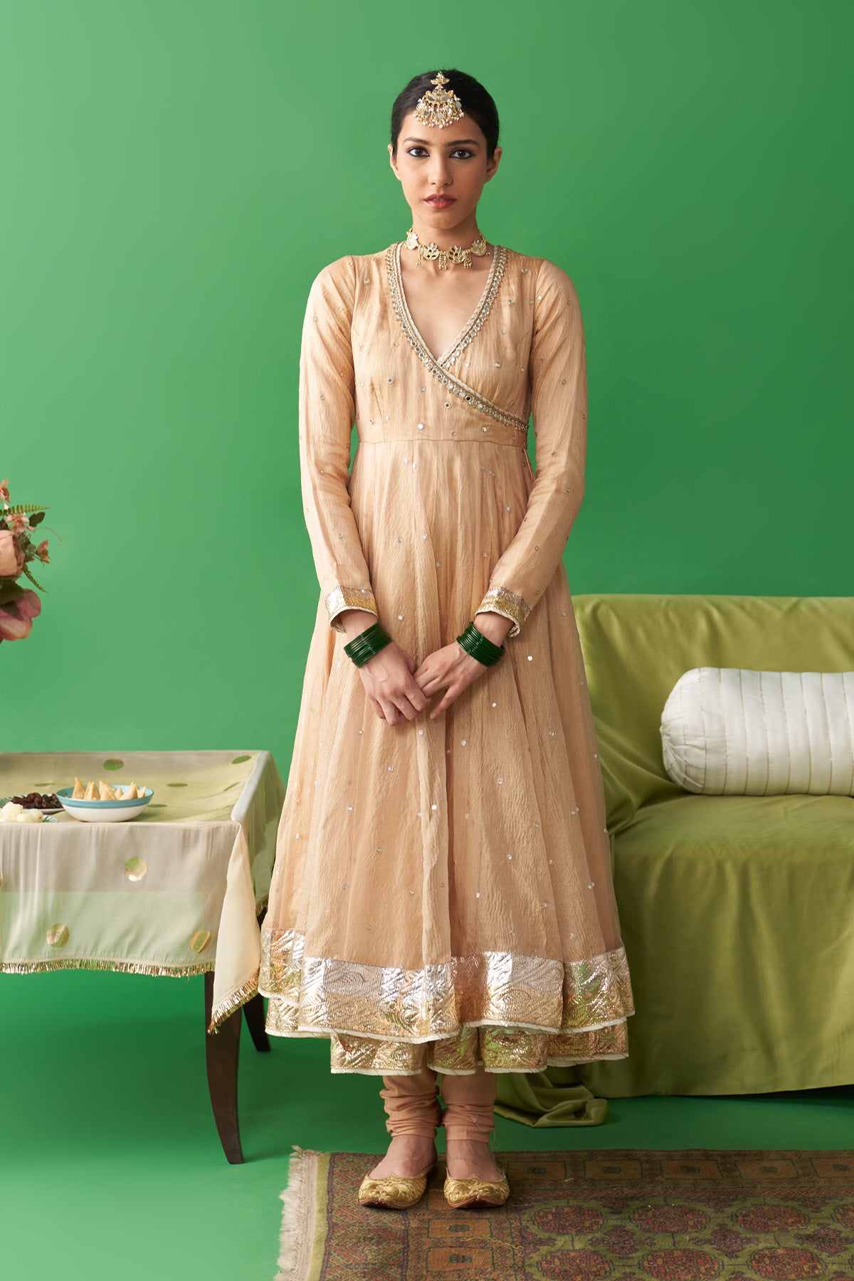This set includes hand embroideredanarkali with chooridar and dupatta. Anarkali is detailed with handembroidery , gota lace and sidetassels .Foil printed chand dupatta is