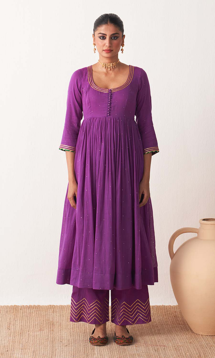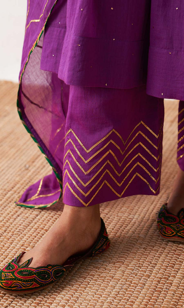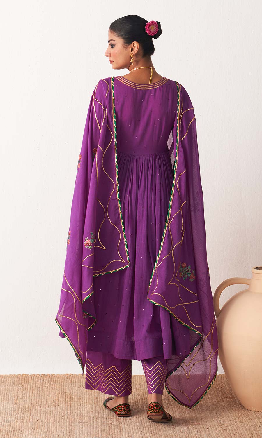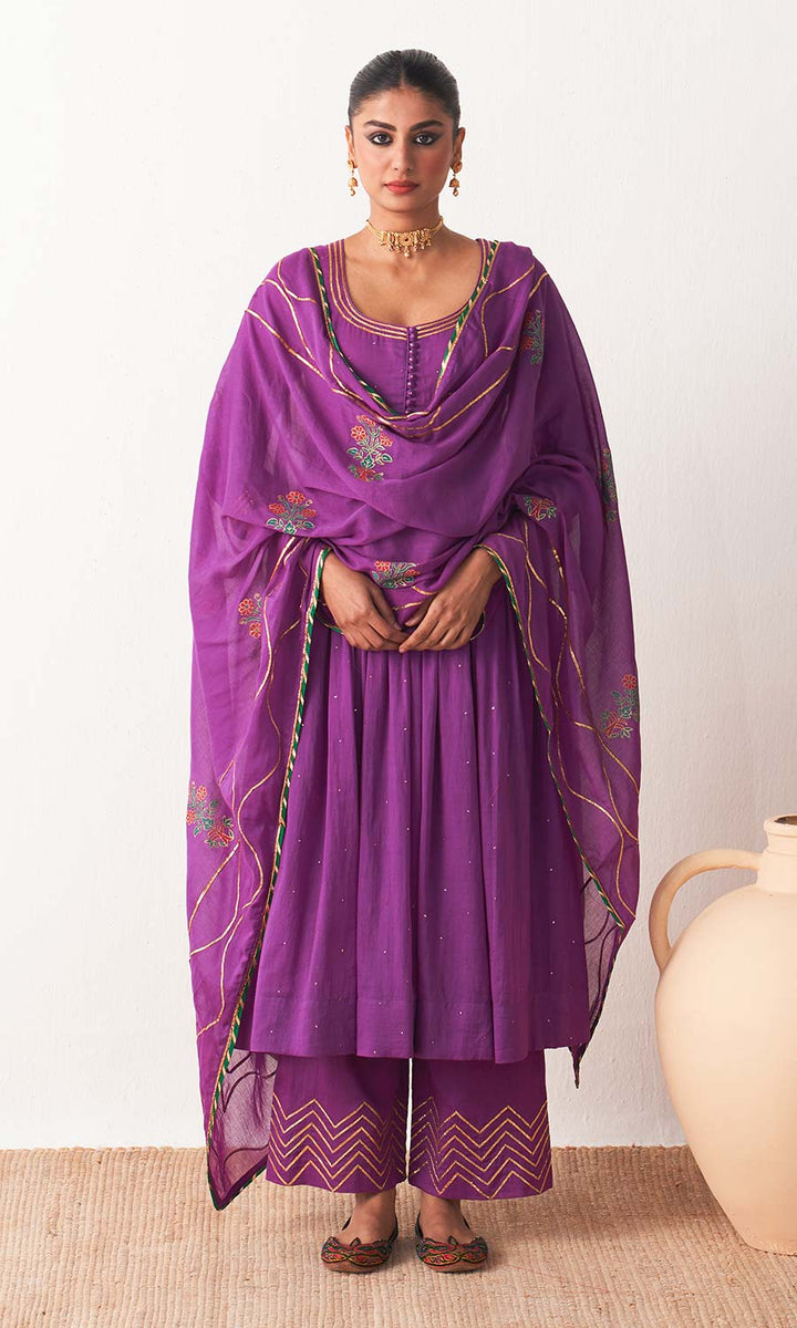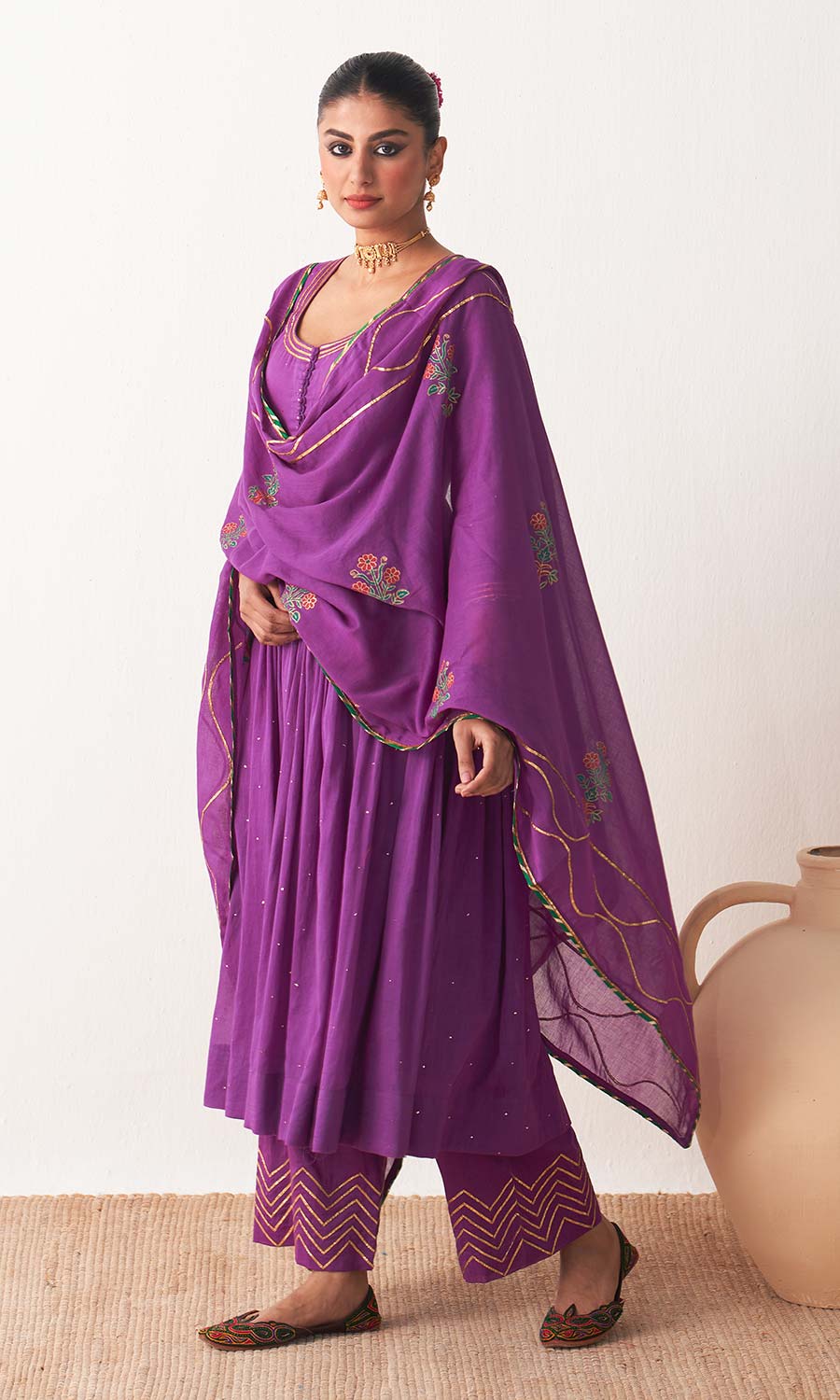 This Three Piece Set Include Anarkali, Palazzo and Dupatta. Anarkali with Luppi Button Detailings and Gota Detailed Palazzo. Floral Hand Block Print Dupatta with Gota LaceFinishings.