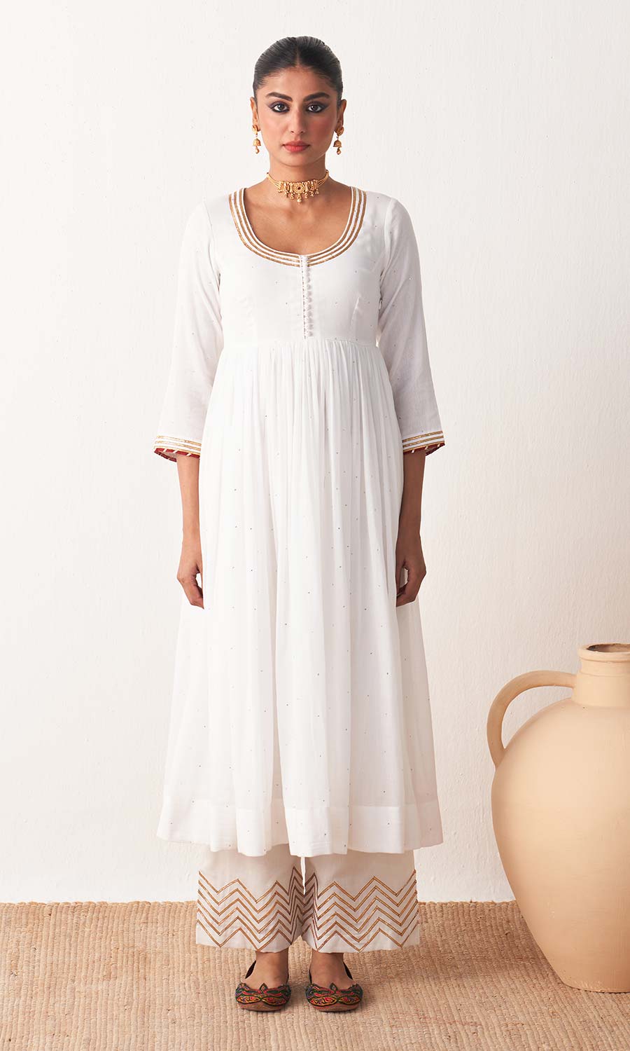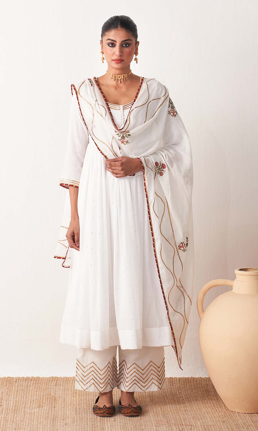 This Three Piece Set Include Anarkali, Palazzo and Dupatta. Anarkali with Luppi Button Detailings and Gota Detailed Palazzo. Floral Hand Block Print Dupatta with Gota LaceFinishings.