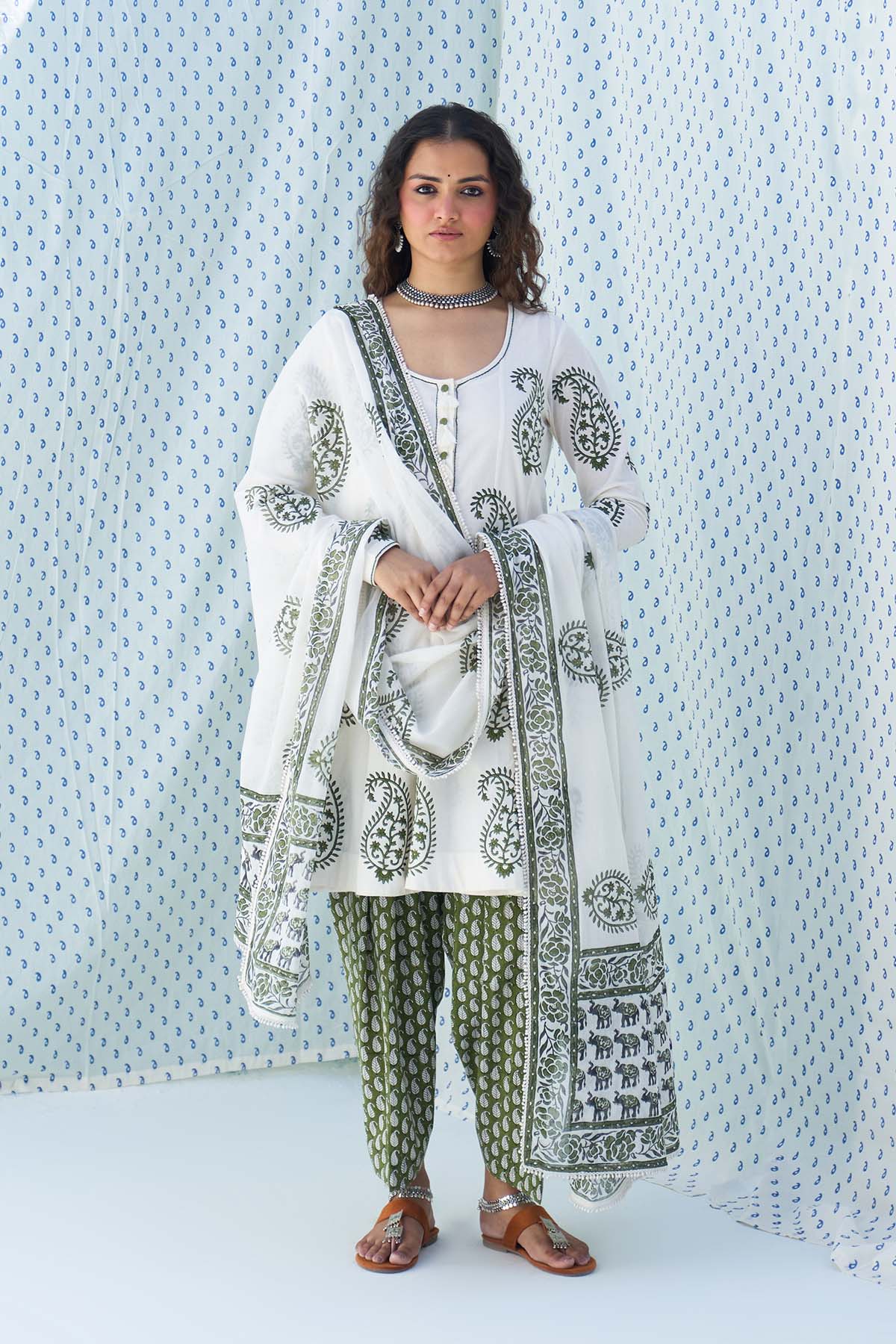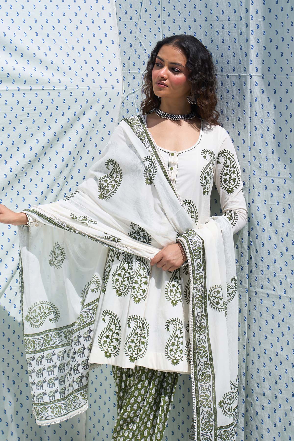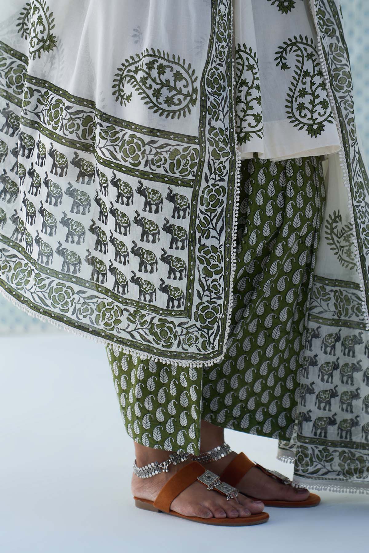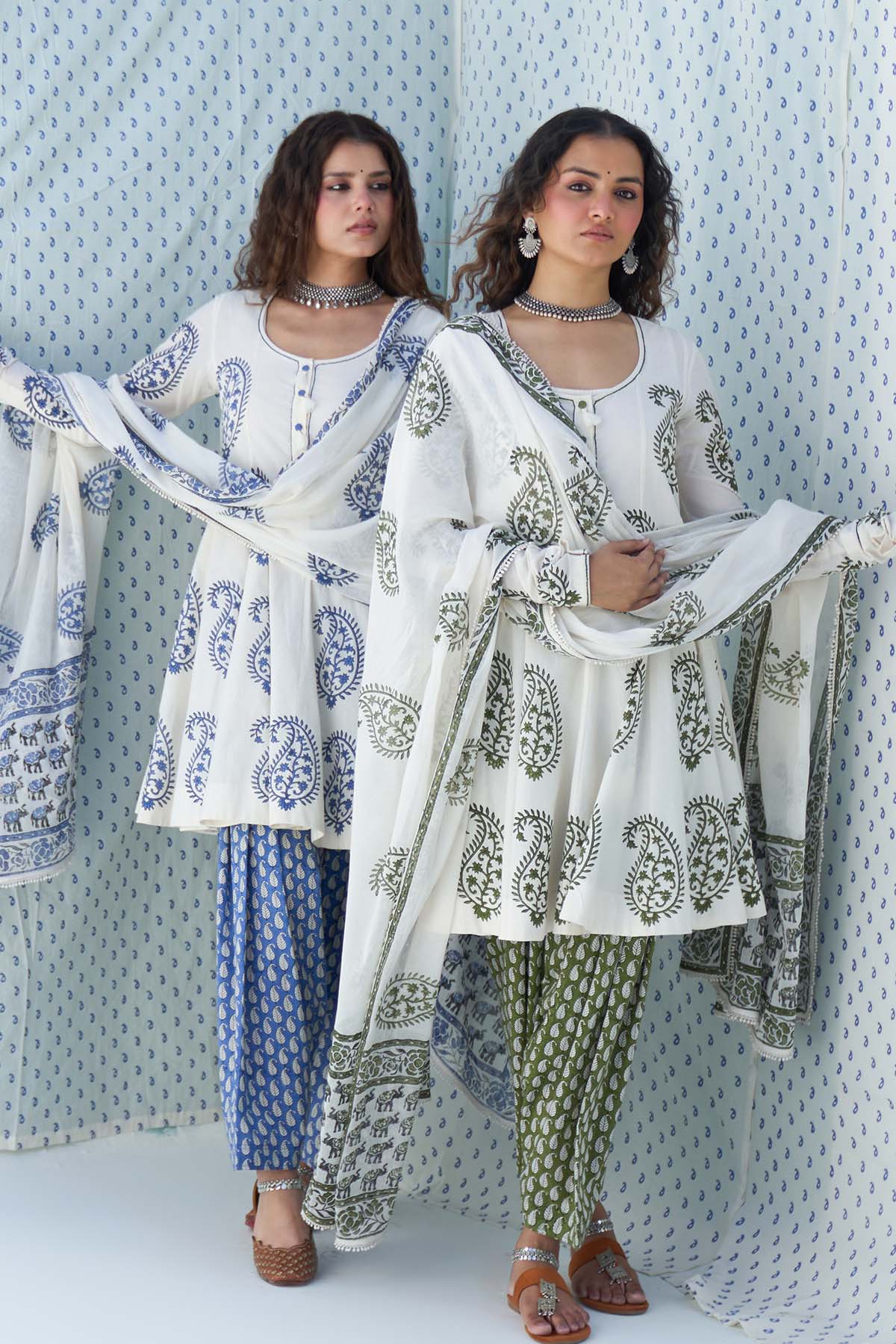 This Set Includes A Hand Block Printed Short Anarkali Paired With Salwar And Dupatta Is Finished With Elegant Lace Detailing.