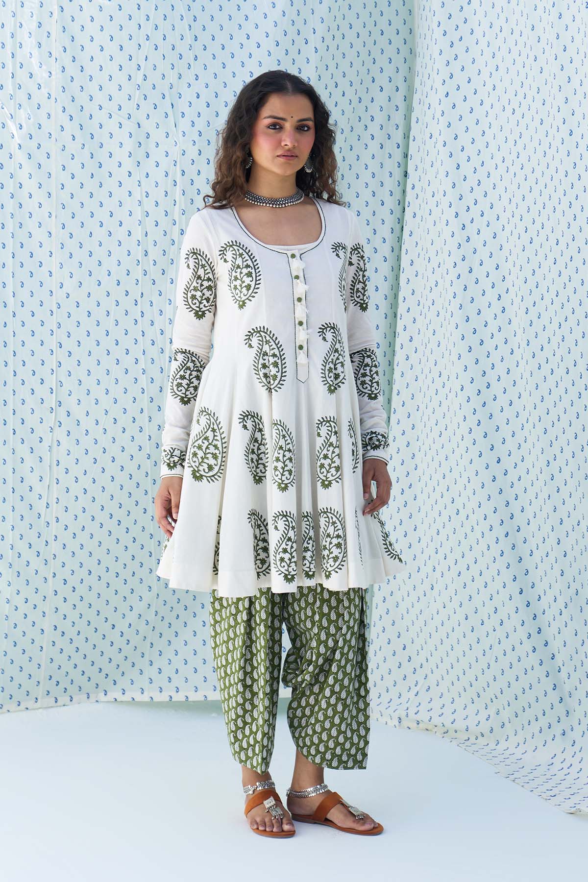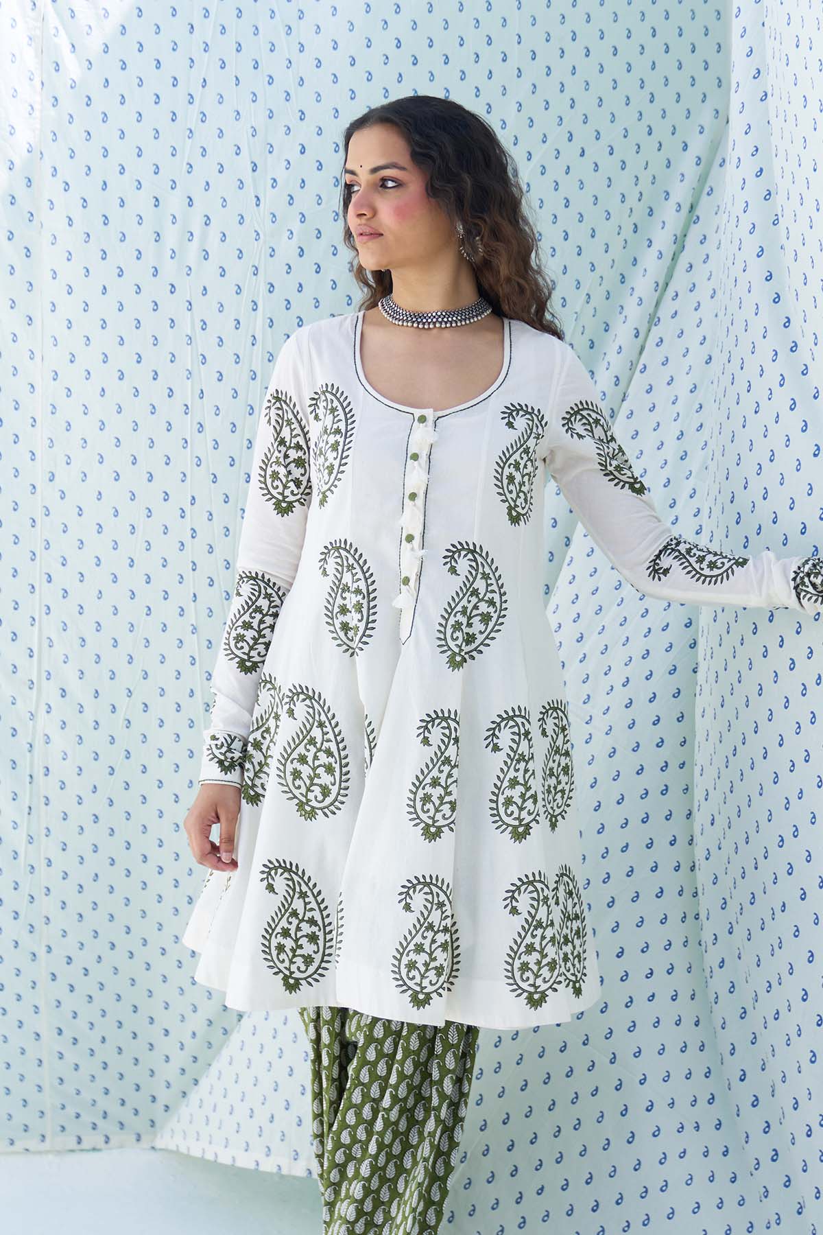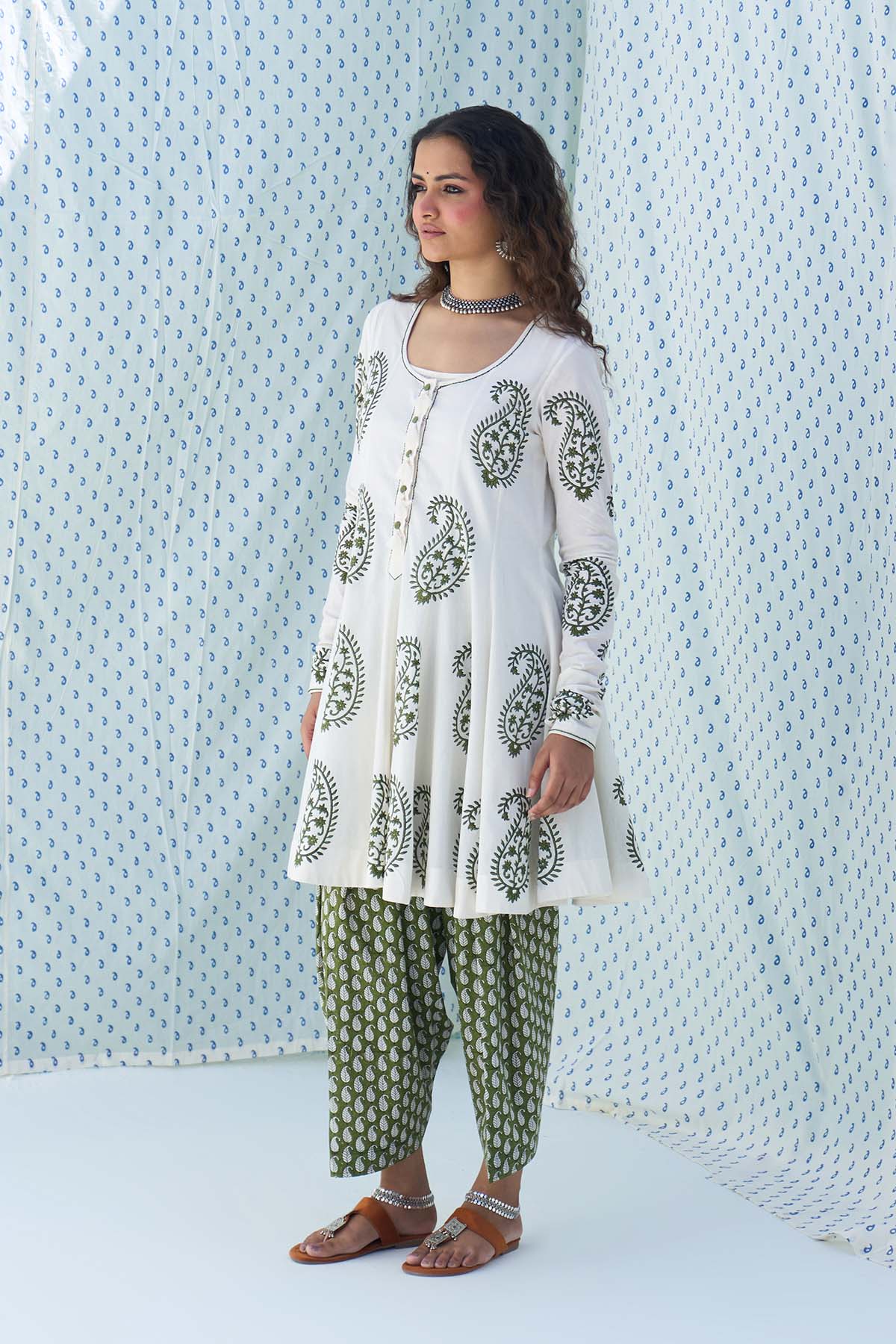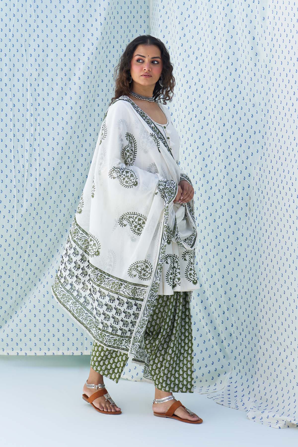 This Set Includes A Hand Block Printed Short Anarkali Paired With Salwar And Dupatta Is Finished With Elegant Lace Detailing.