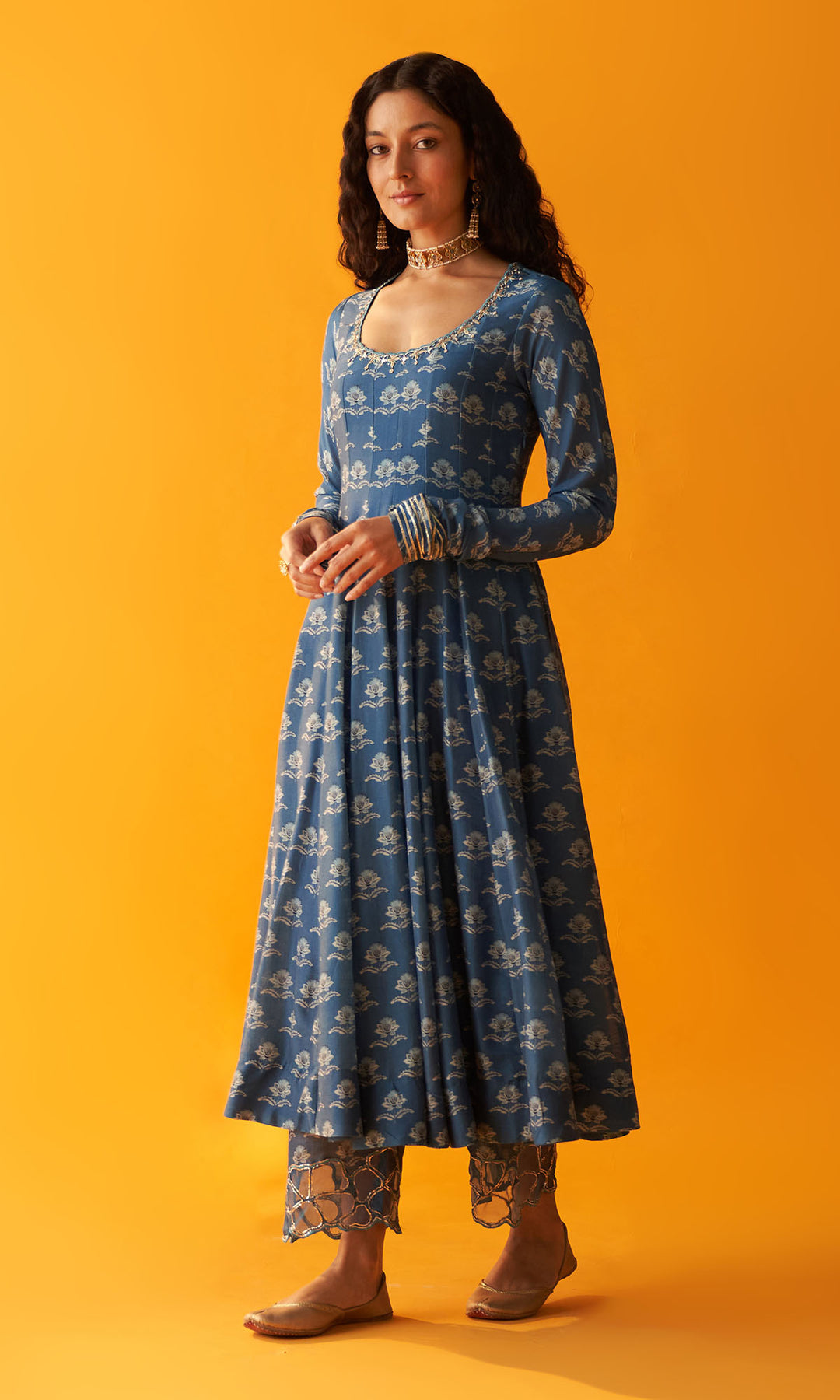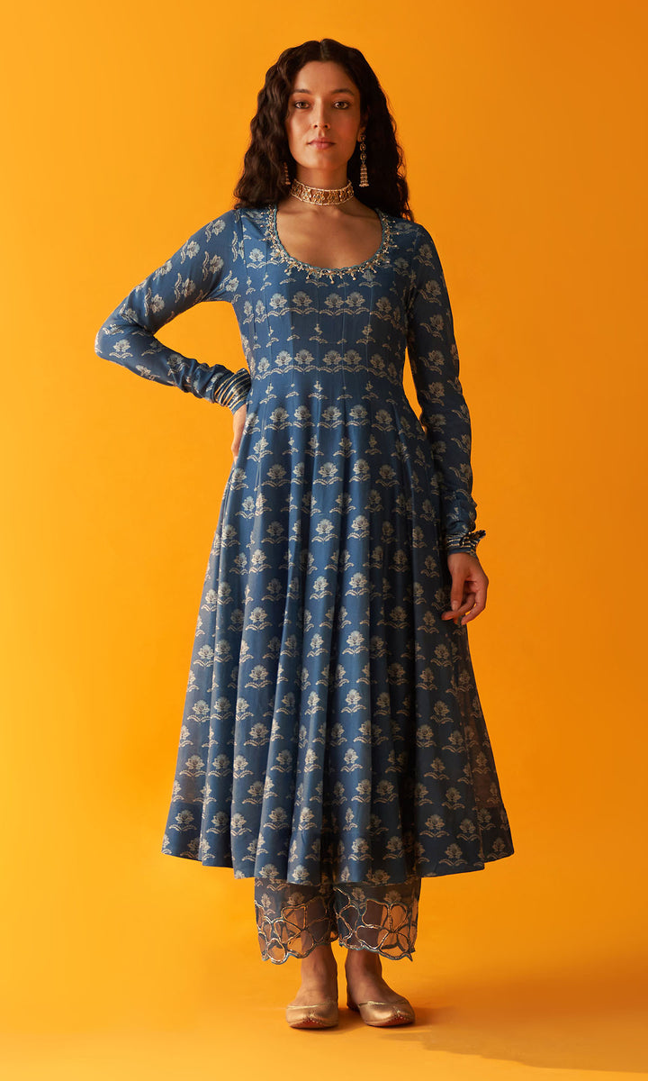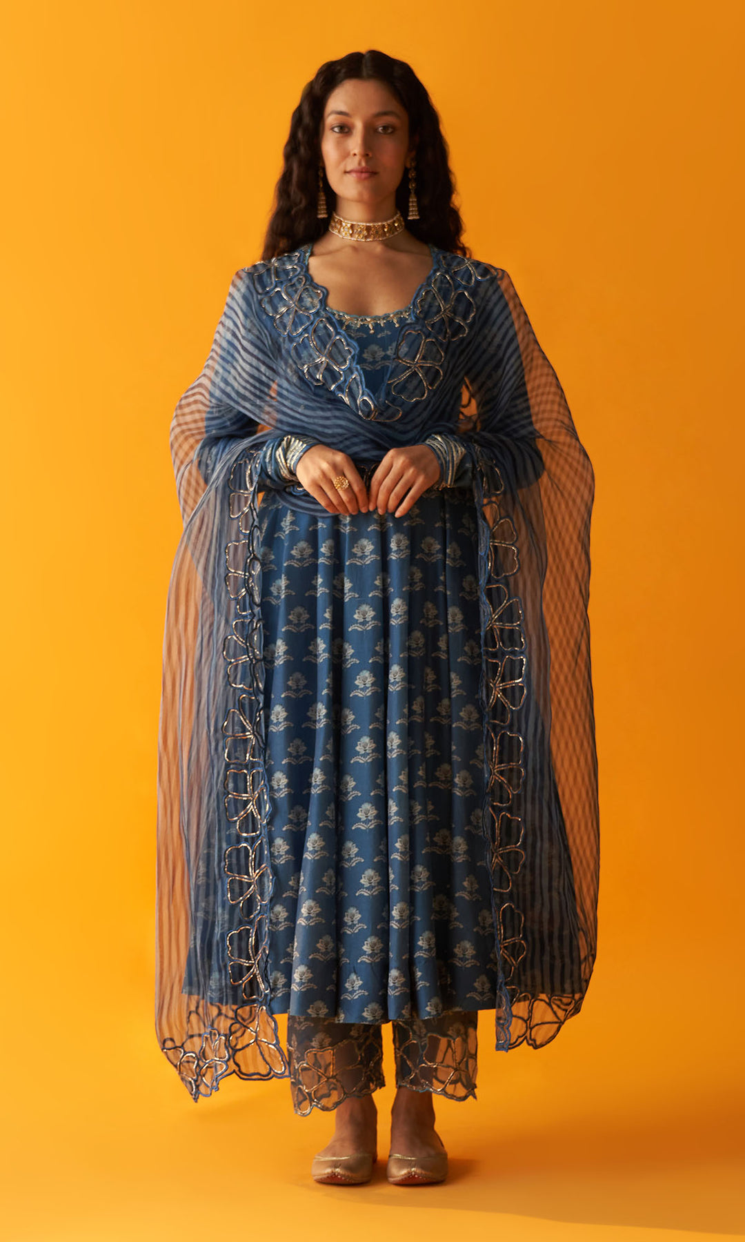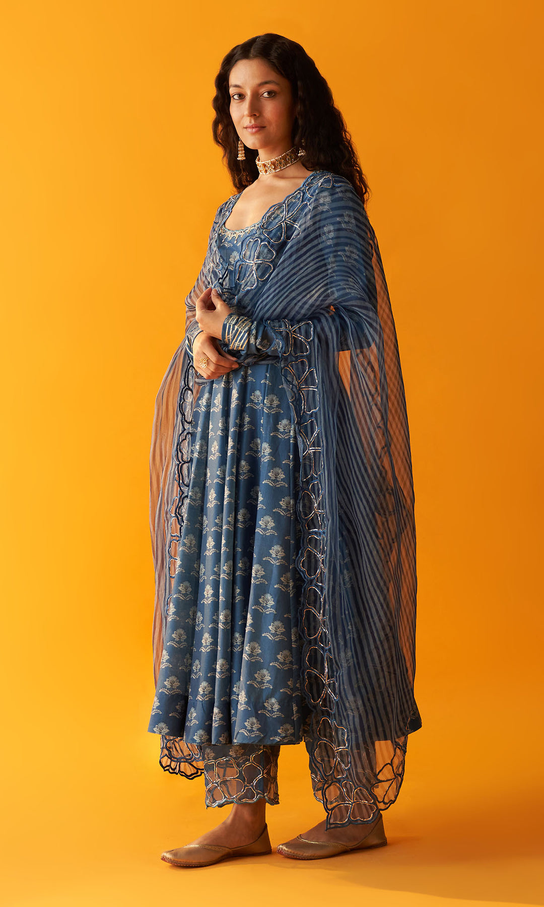 This set includes floral printed Anarkali with palazzo and organza dupatta. Anakali is detailed with hand embroidery and chooridar sleeves .It comes with embroidered palazzo. Dupatta is detailed with hand and machine embroidery.