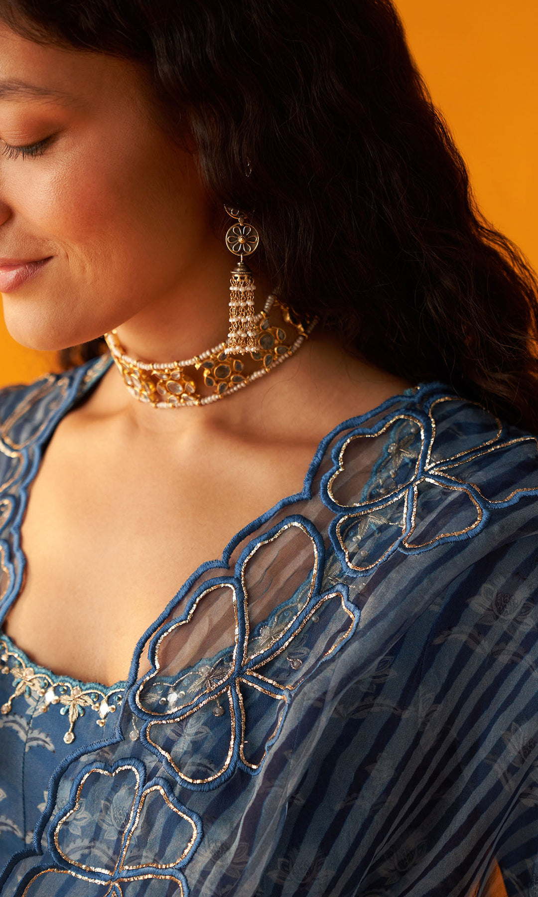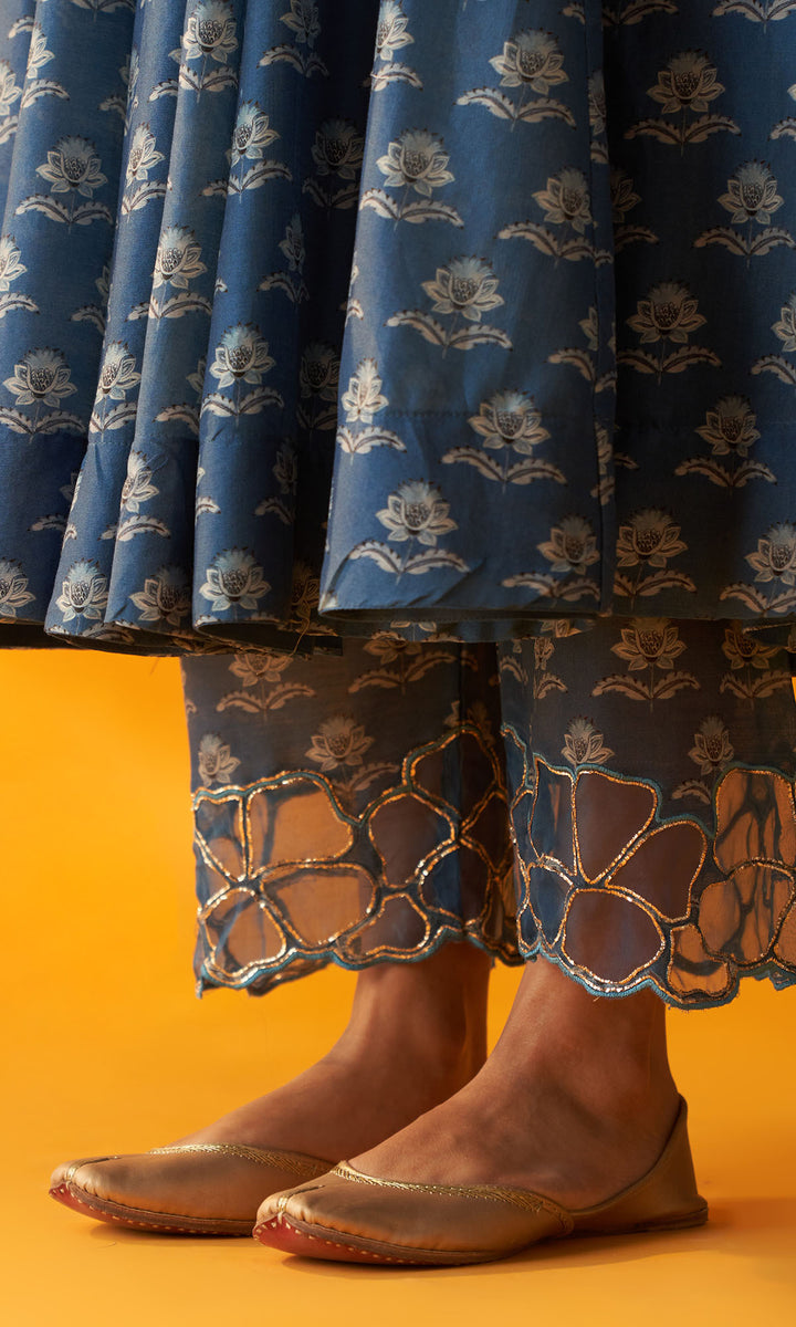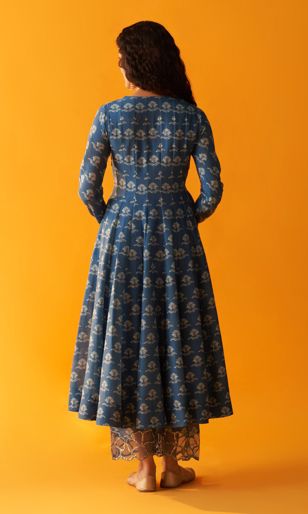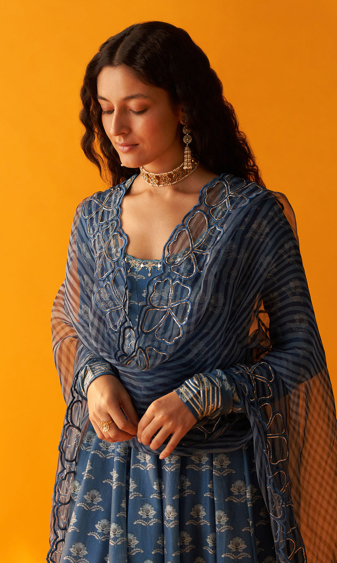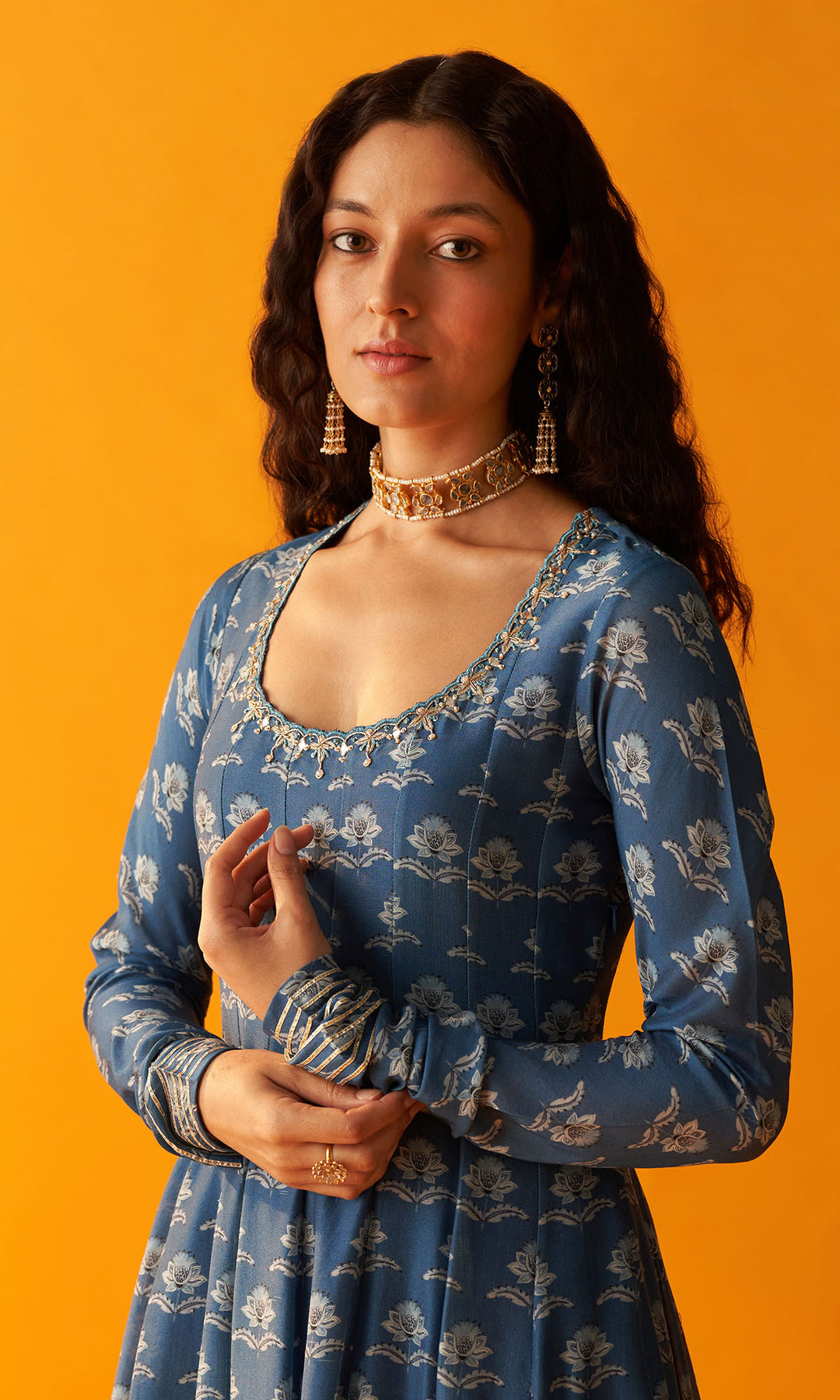 This set includes floral printed Anarkali with palazzo and organza dupatta. Anakali is detailed with hand embroidery and chooridar sleeves .It comes with embroidered palazzo. Dupatta is detailed with hand and machine embroidery.