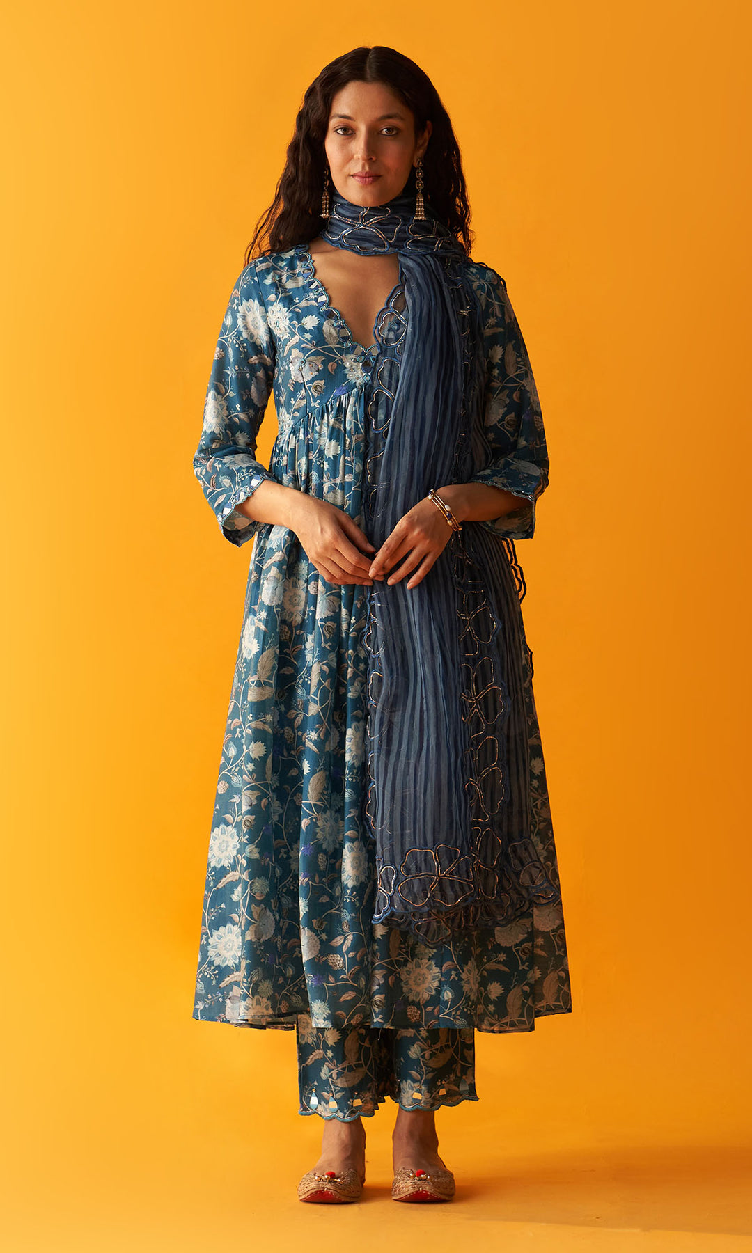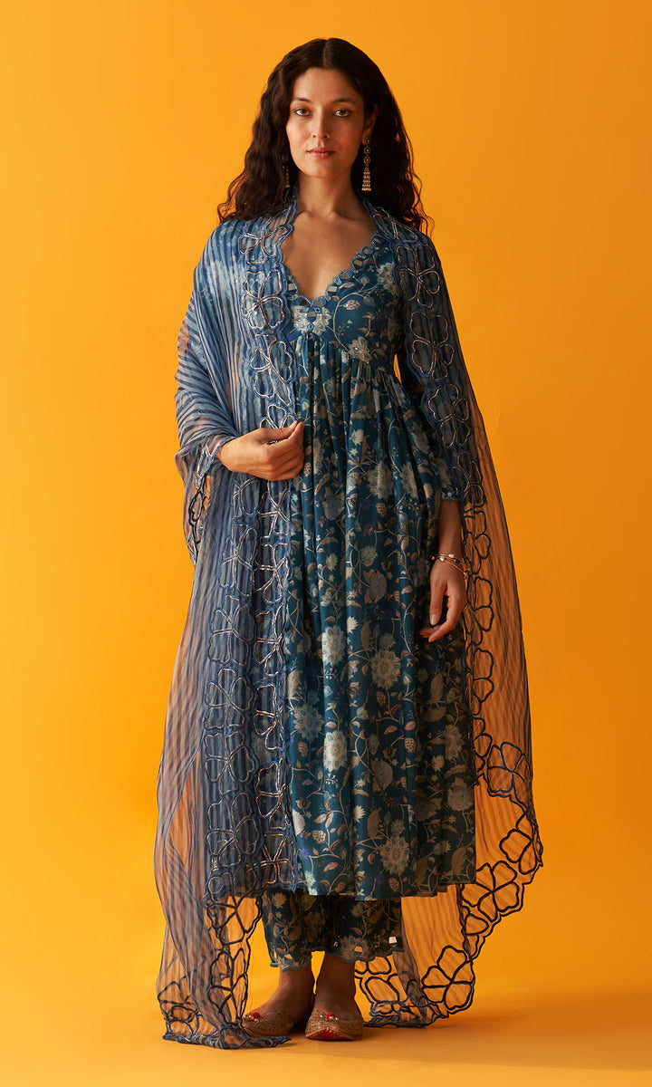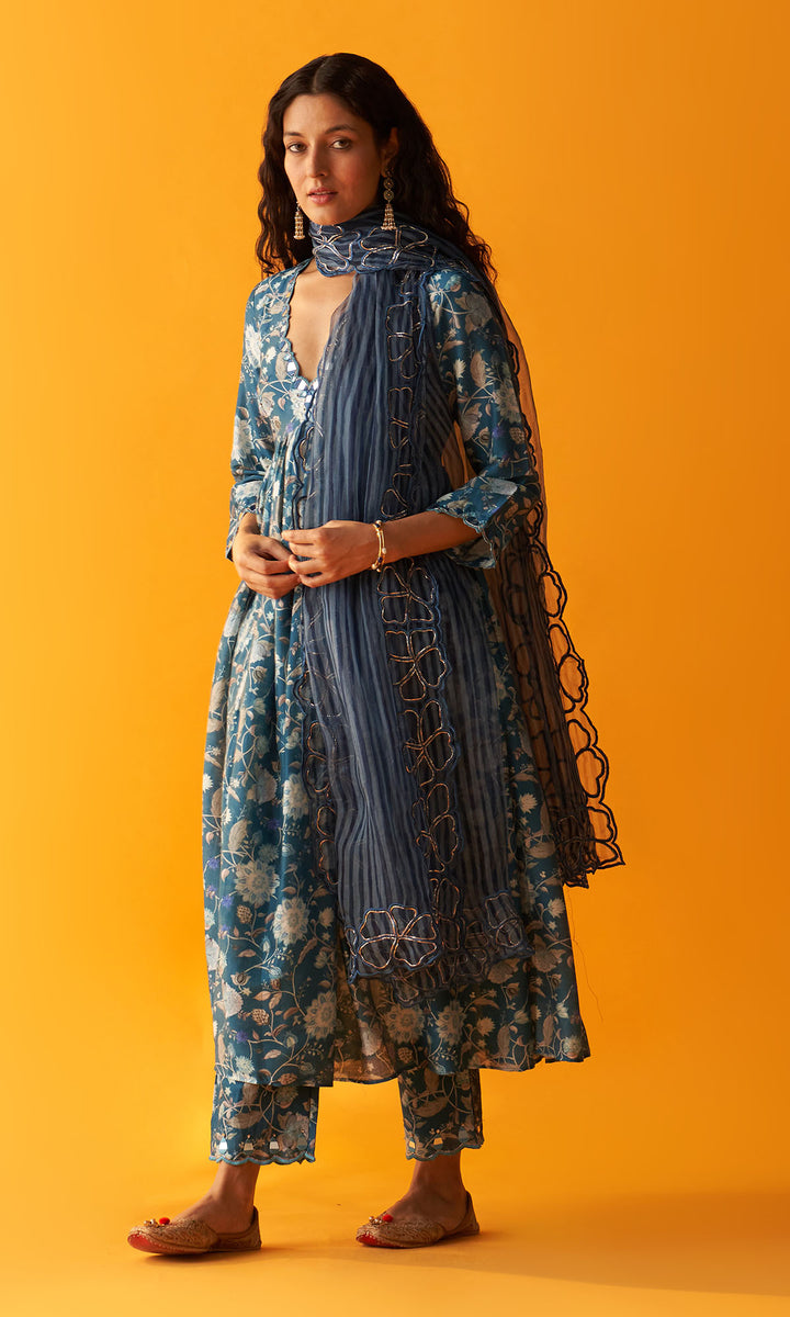 Noorie Blue Mirror work anarkali with palazzo and dupatta (set of 3)