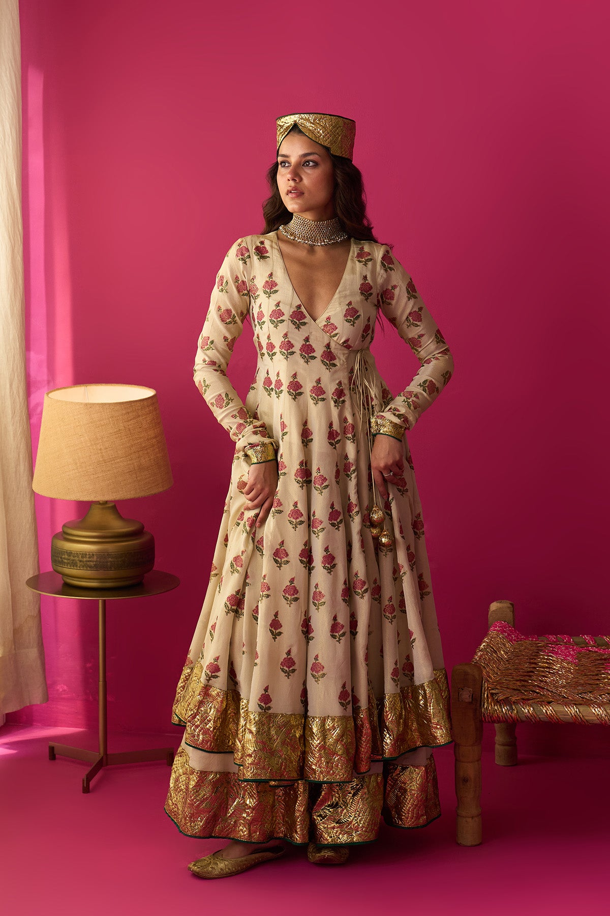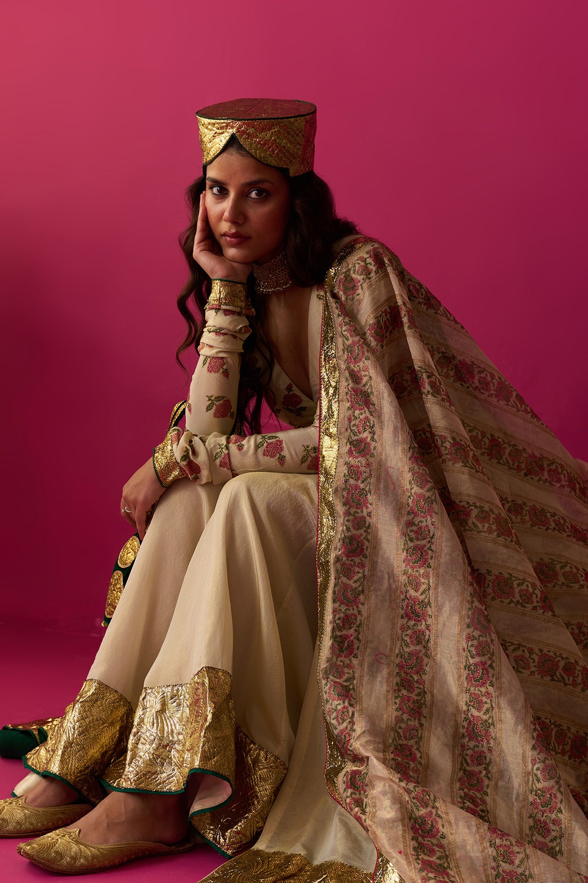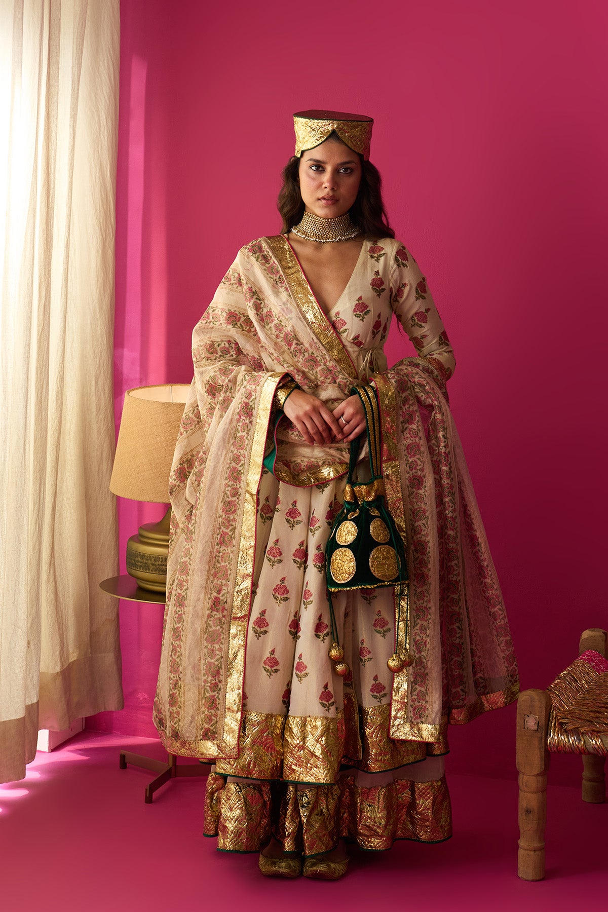 Nur Ivory block printed angrakha with sharara and dupatta (set of 3)