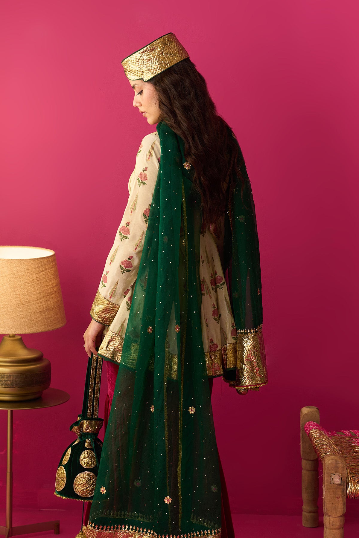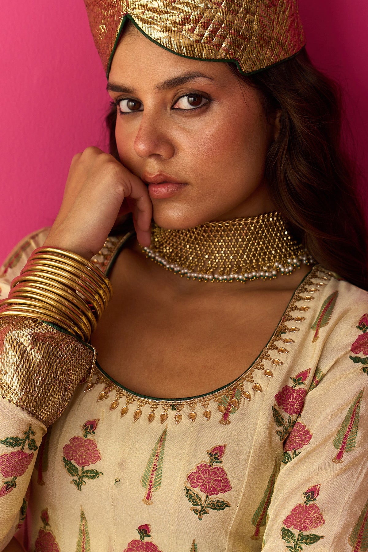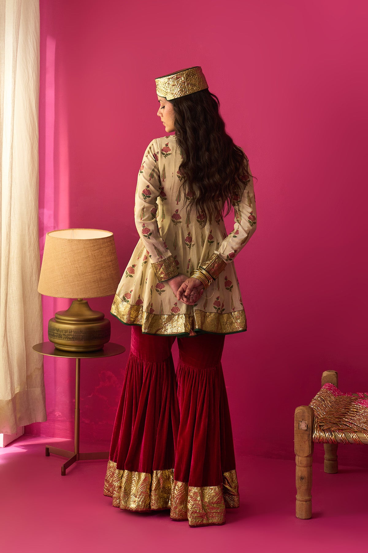 This set includes block printed short anarkali with garara and duptta . Anarkali and dupatta is detailed with hand embroidery and finished with gota lace.Garara is