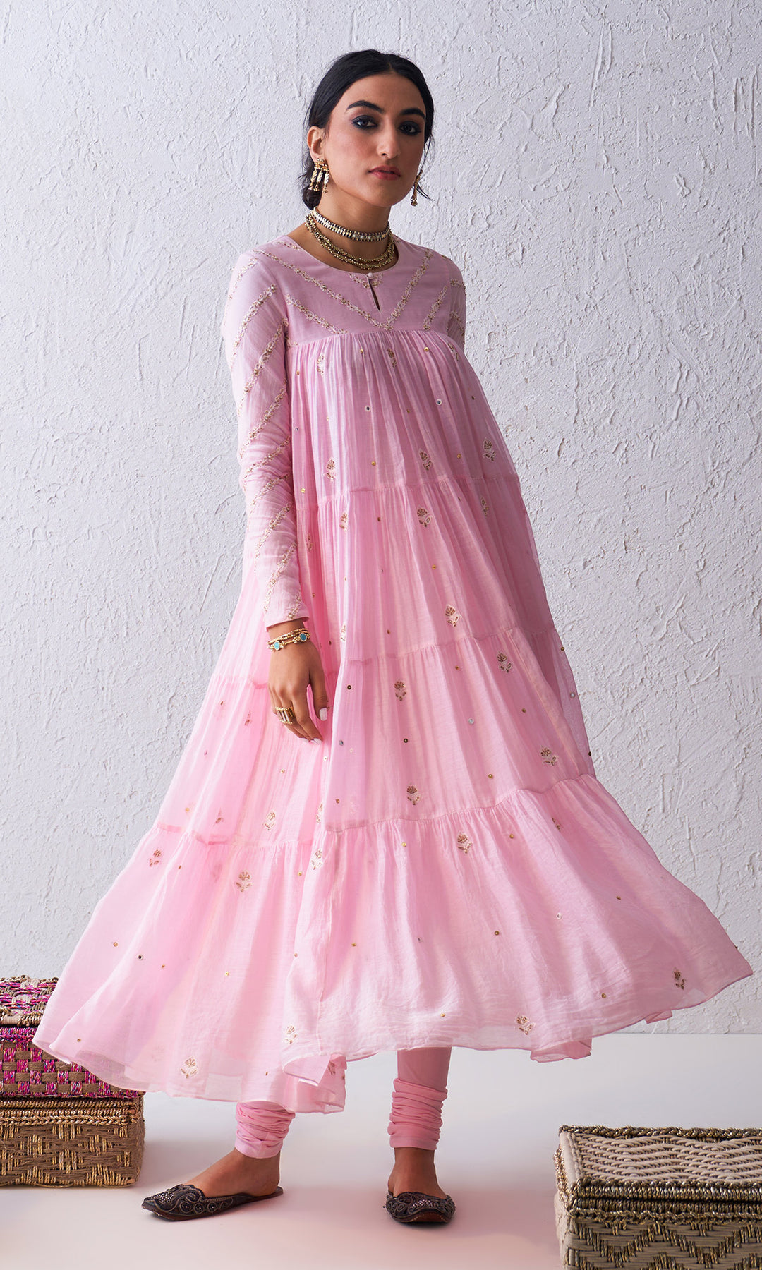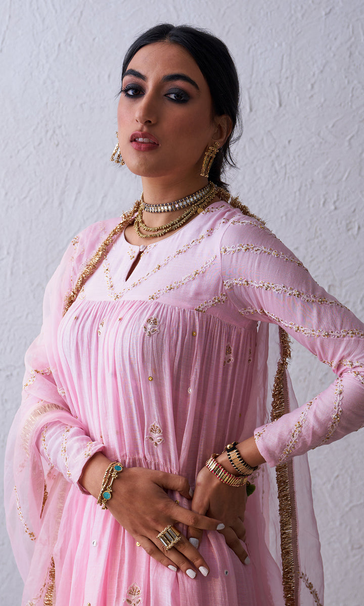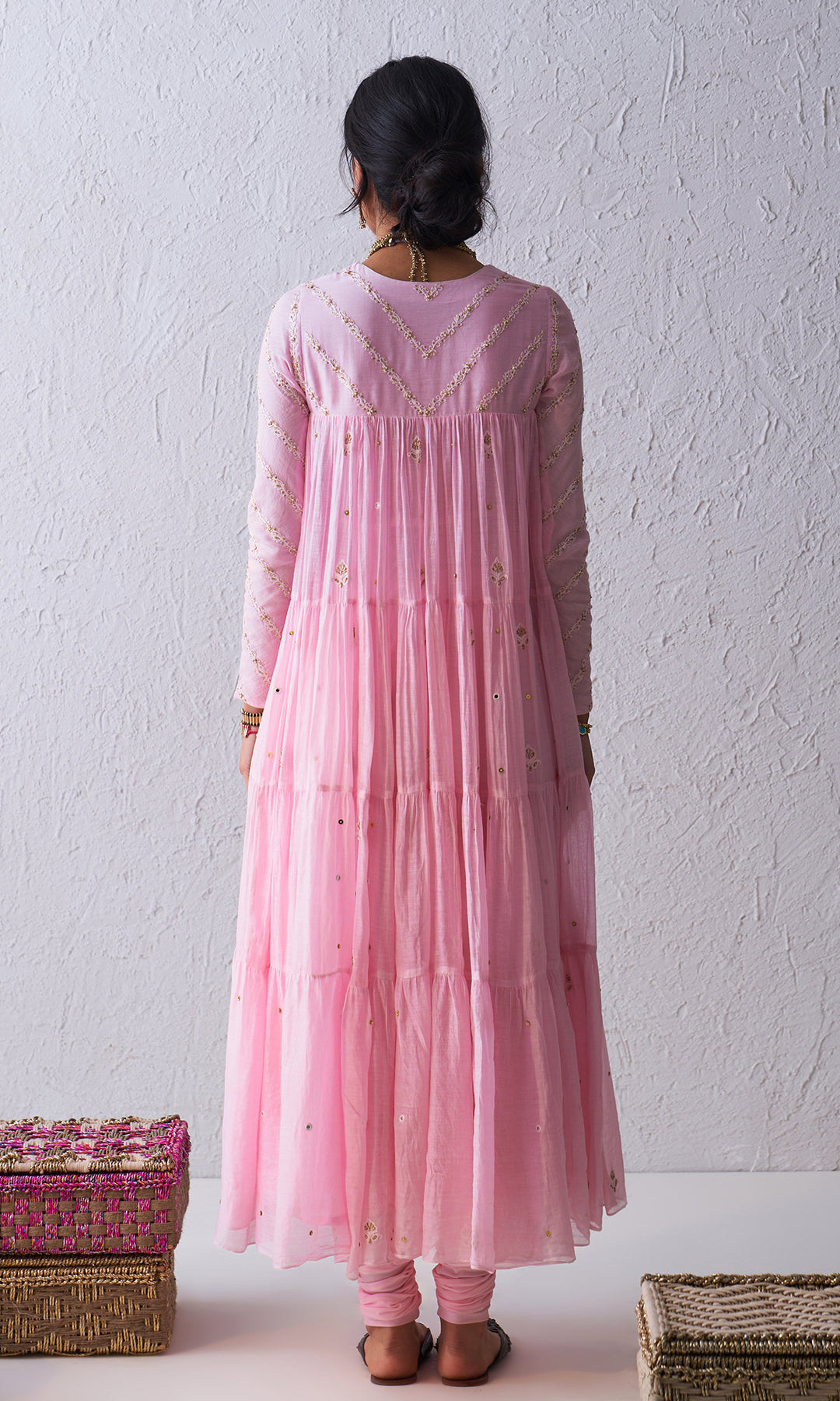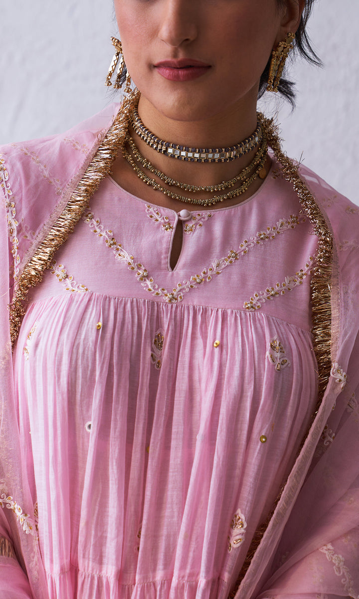 Qabila Pink Embroidered Tiered Anarkali Set - Set Of 3
