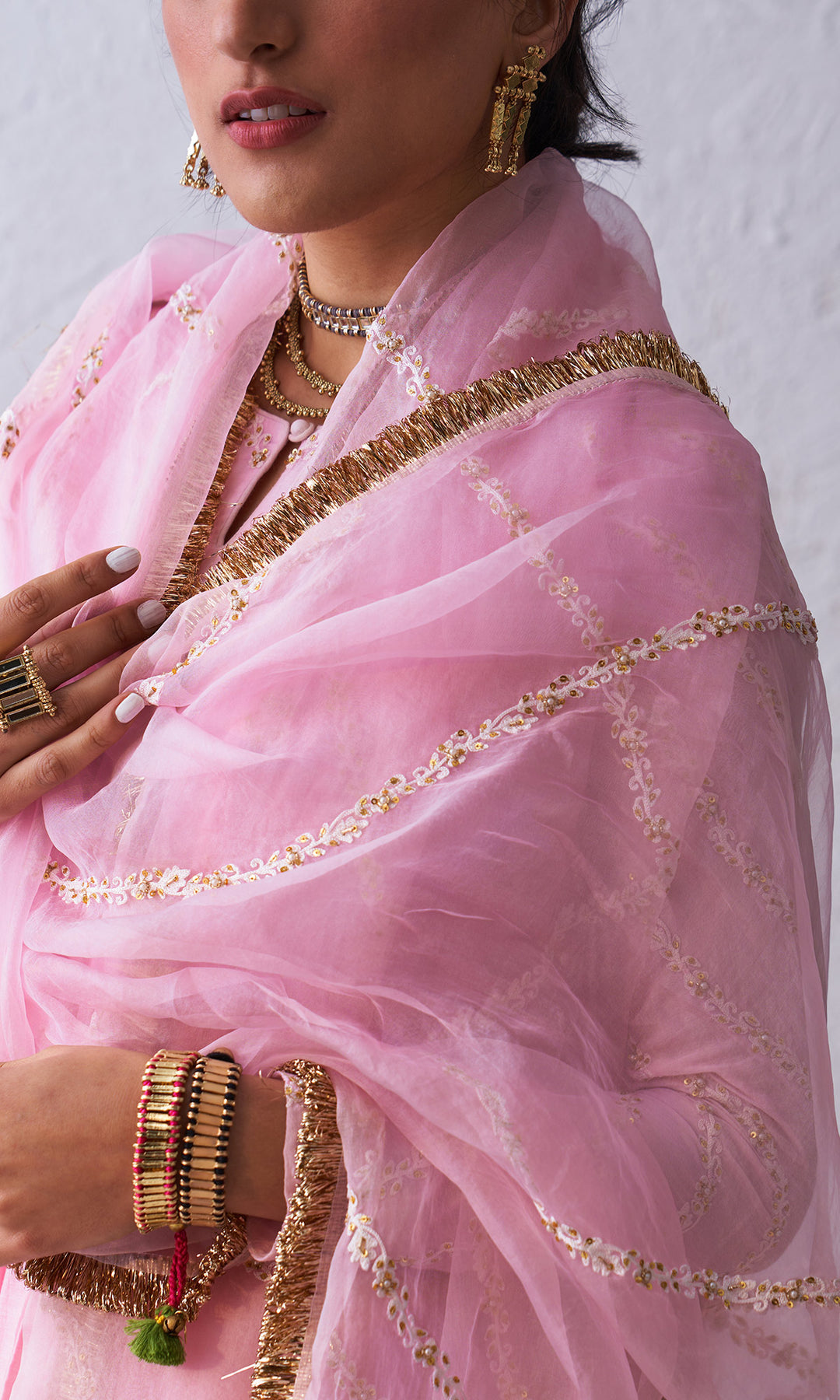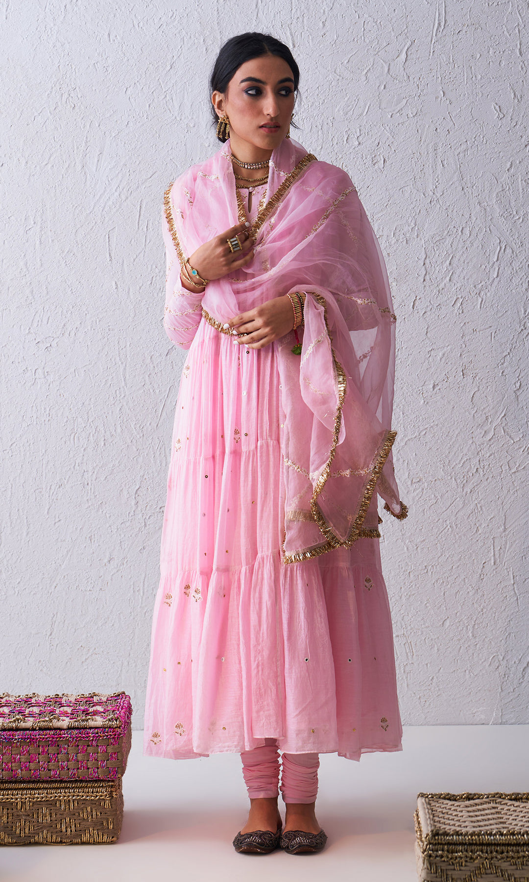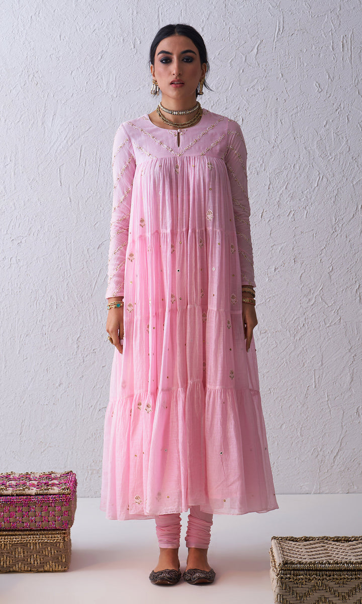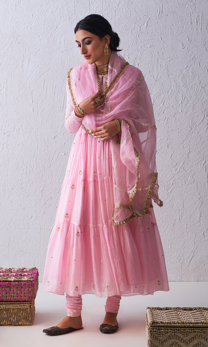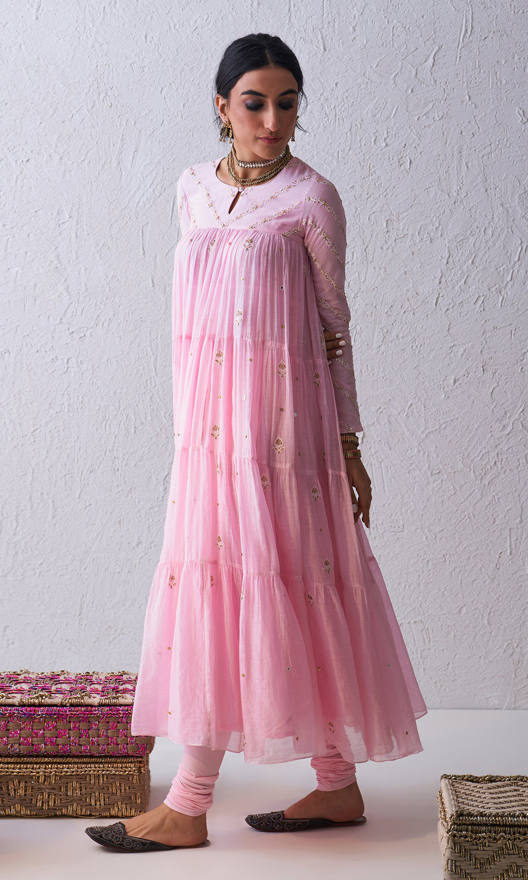 Qabila Pink Embroidered Tiered Anarkali Set - Set Of 3