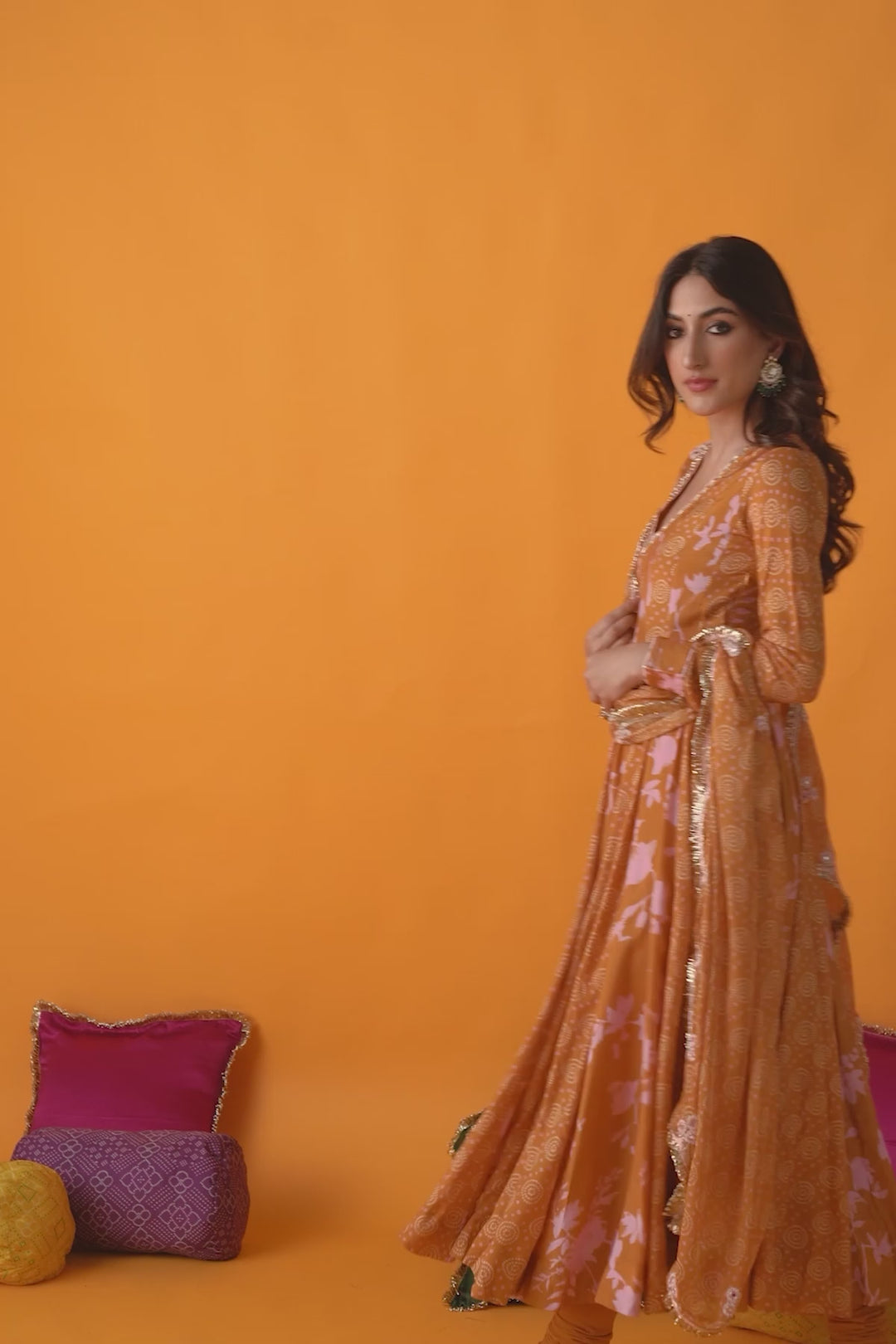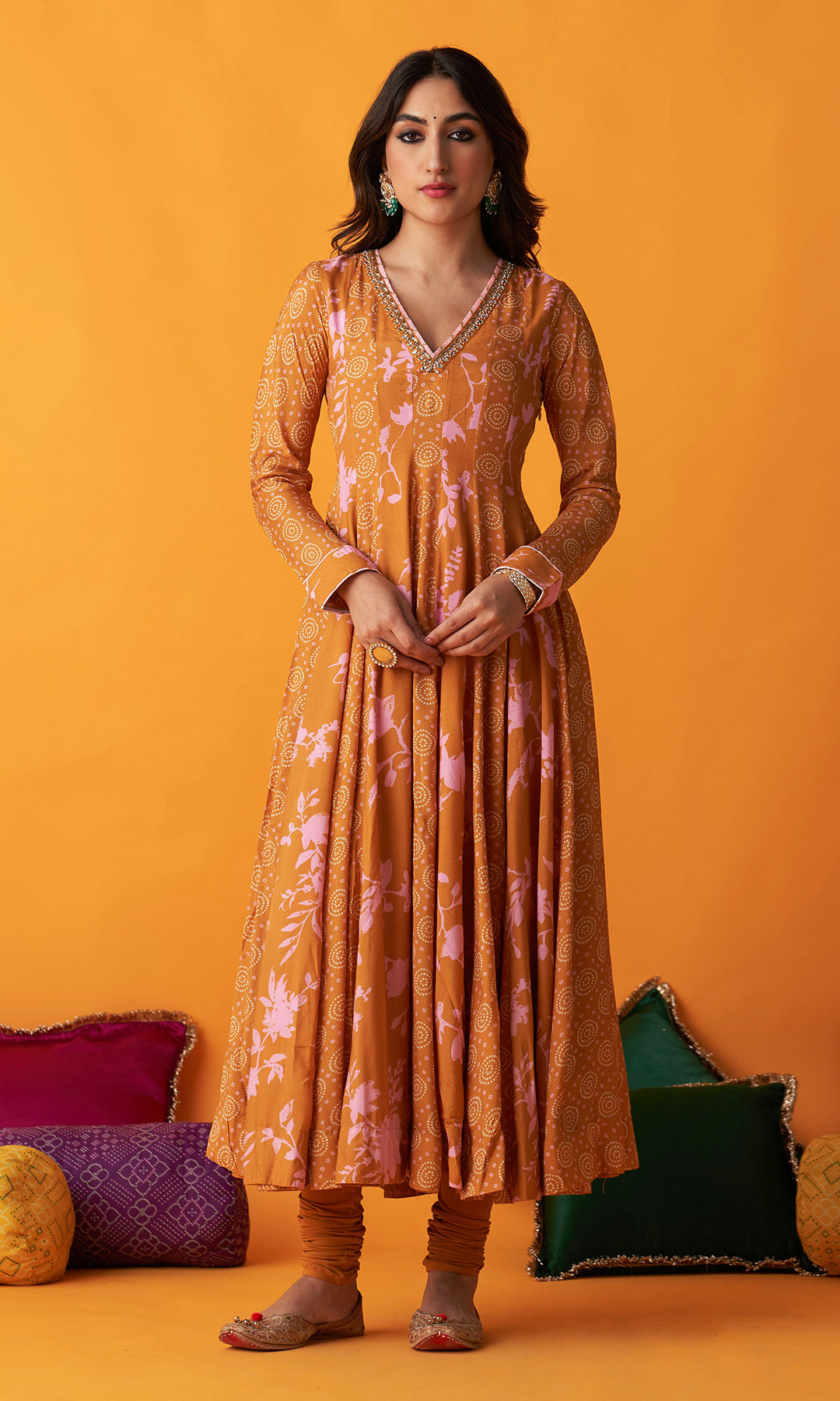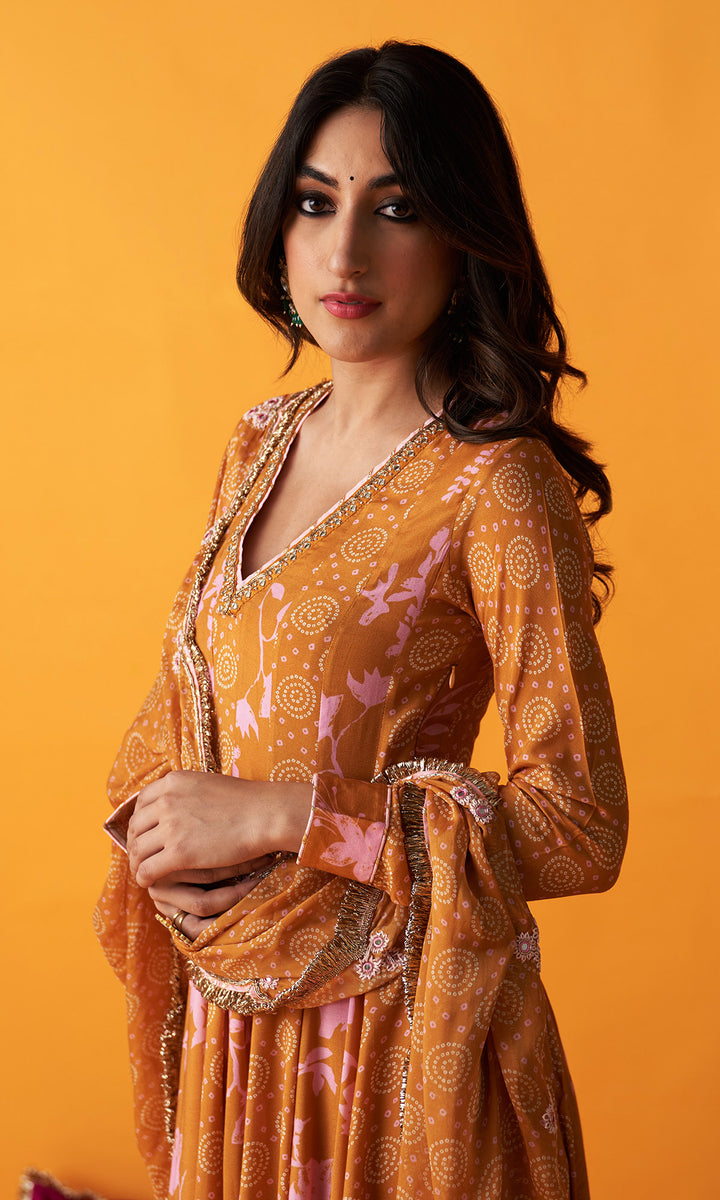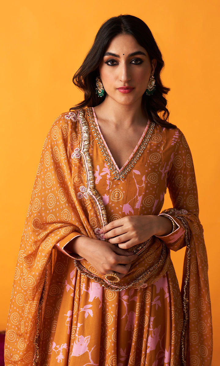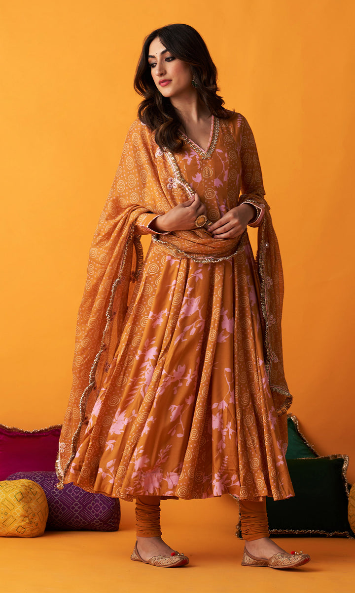 This set includes anarkali, chooridar and dupatta. Anarkali is detailedwith hand embroidery. It comes with chooridar. Dupatta is detailed with hand embroidery and finished withgota lace and jhallar.