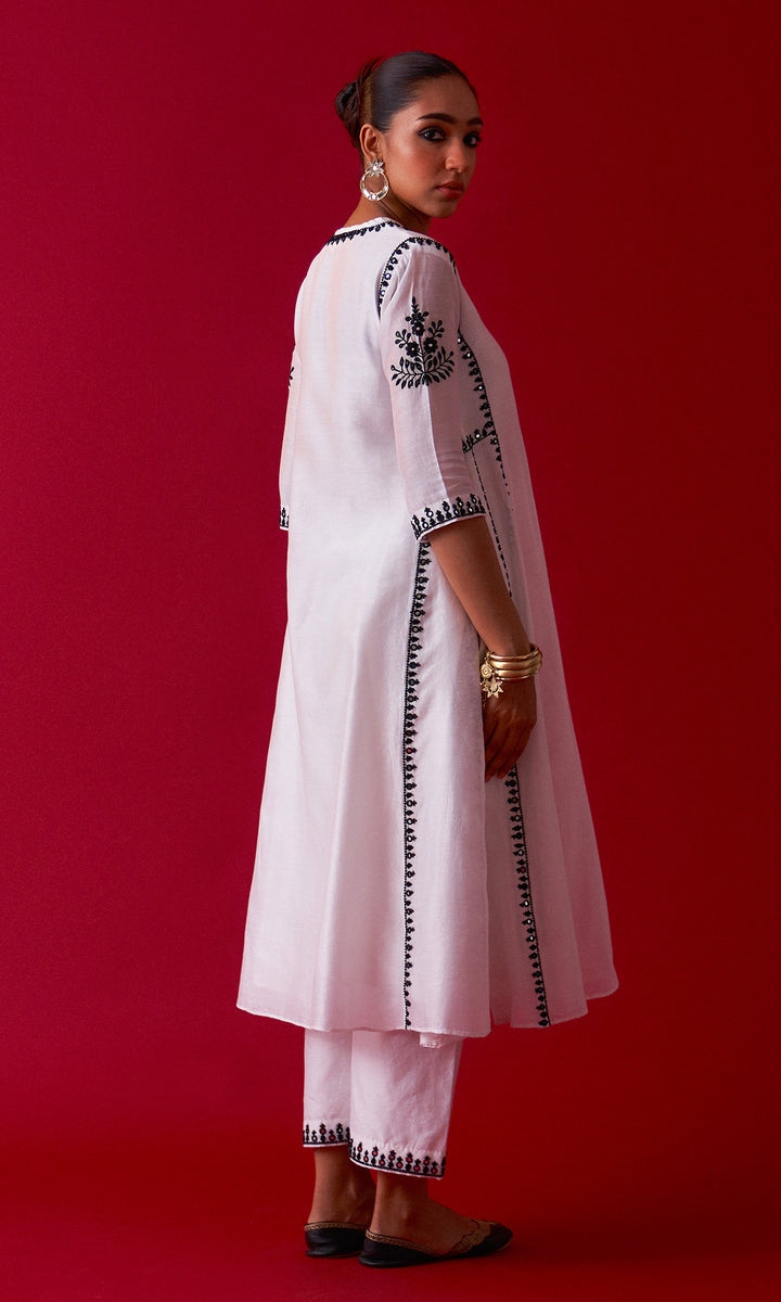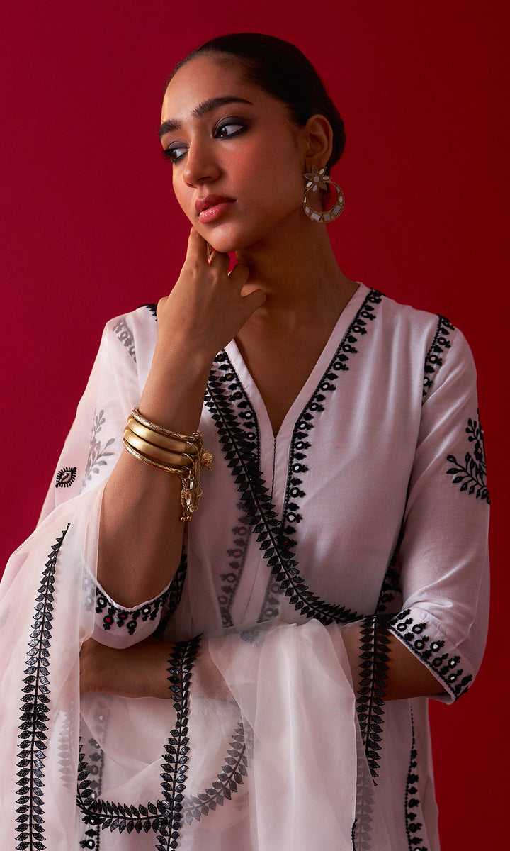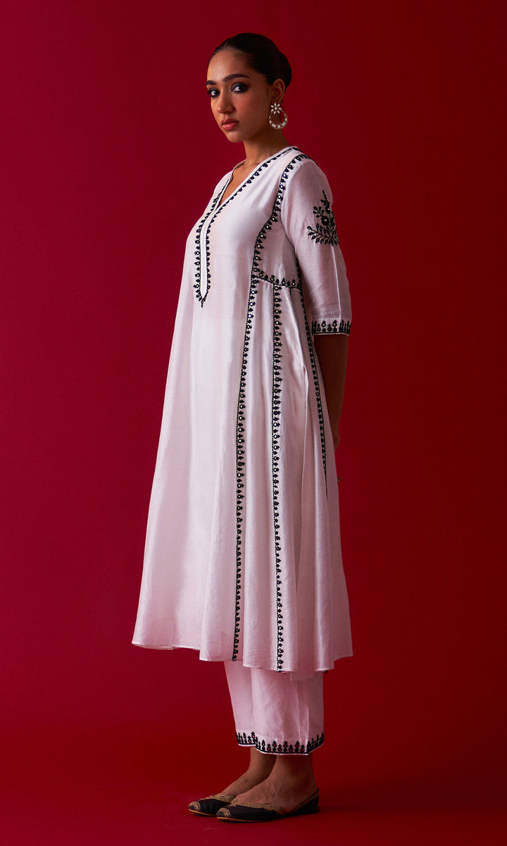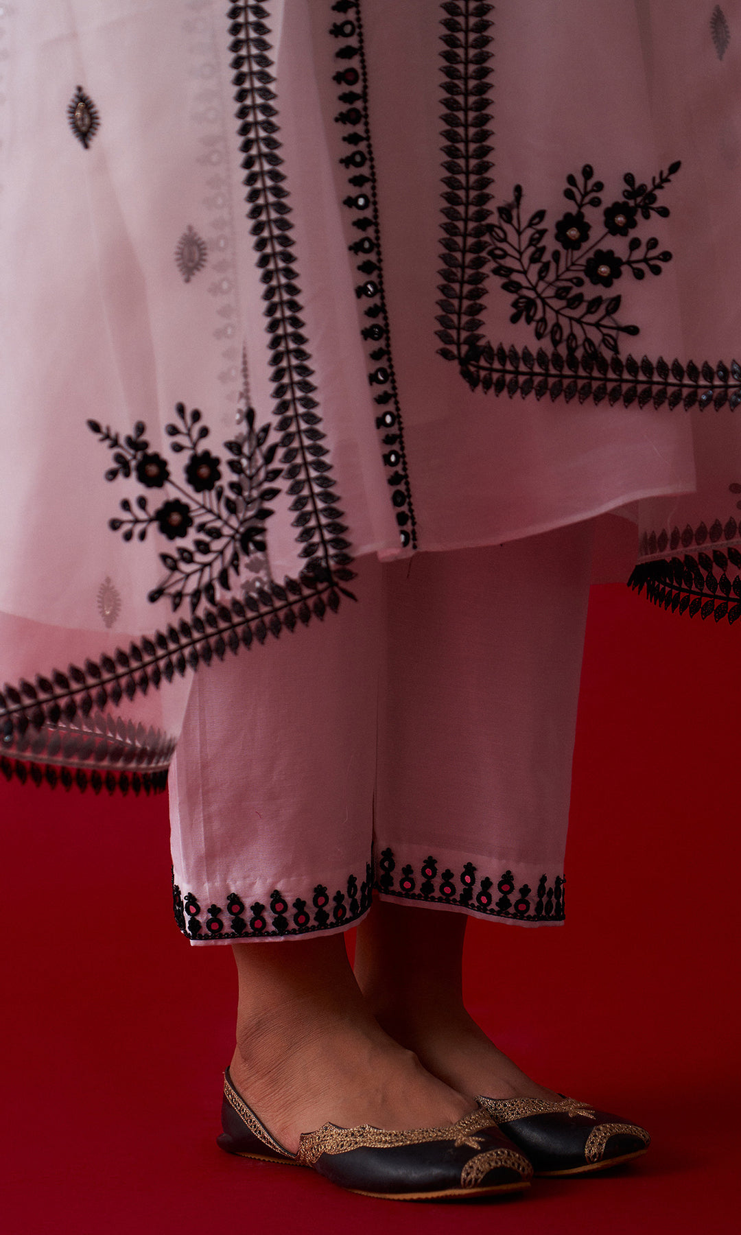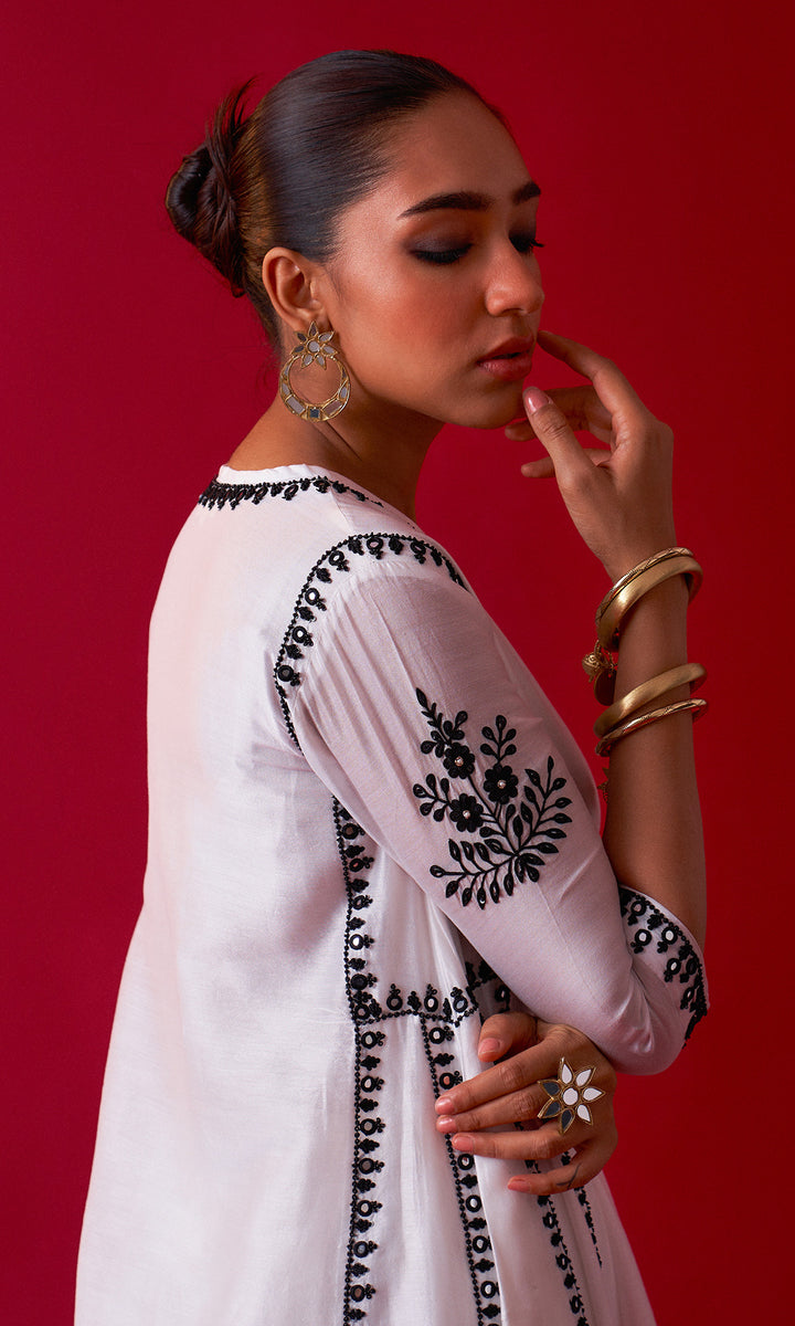 This set includes aari embroidered Choga Palazzo and Dupatta. The set is embellished with resham, sequins, beads, mirror and nakshi work. Palazzo has embroidery work at bottom. Embroidered Dupatta is embellished with lace.
