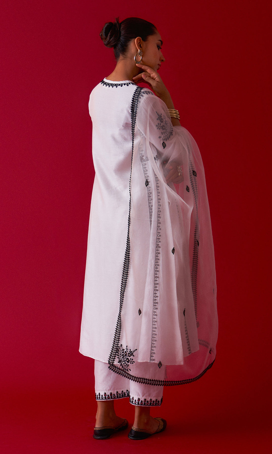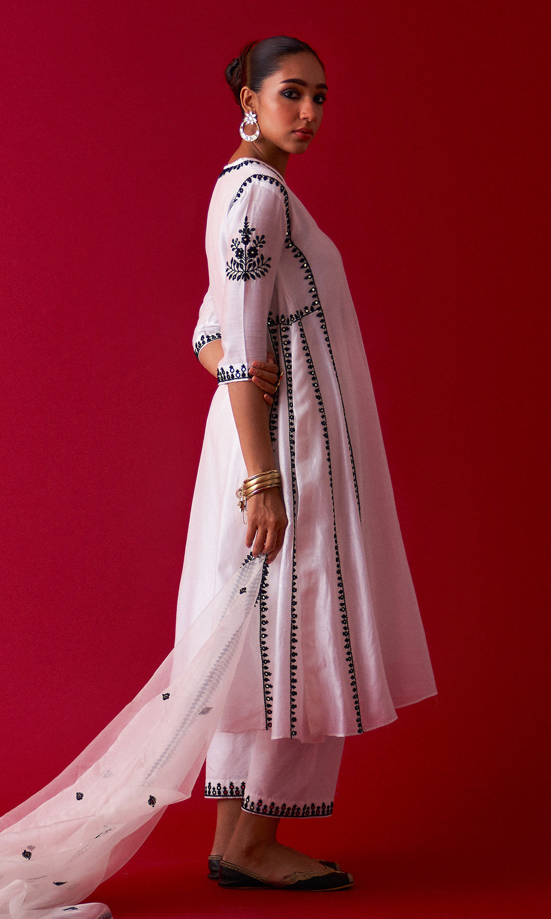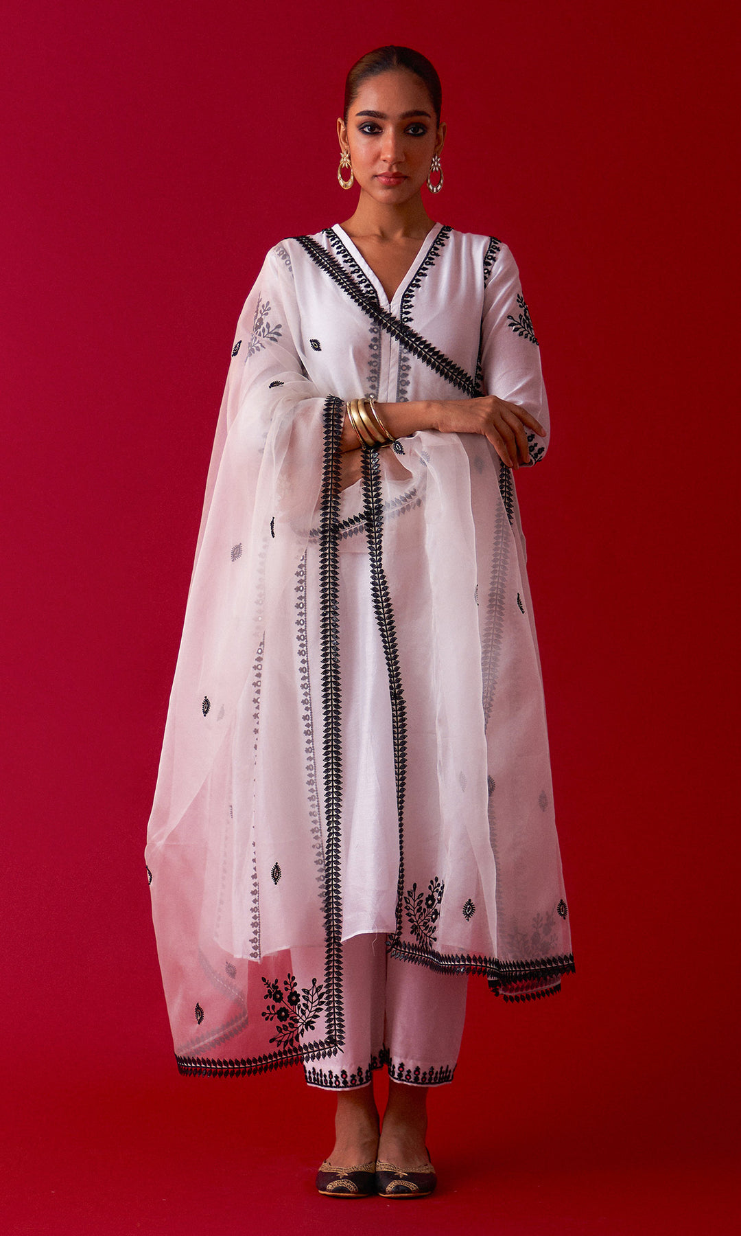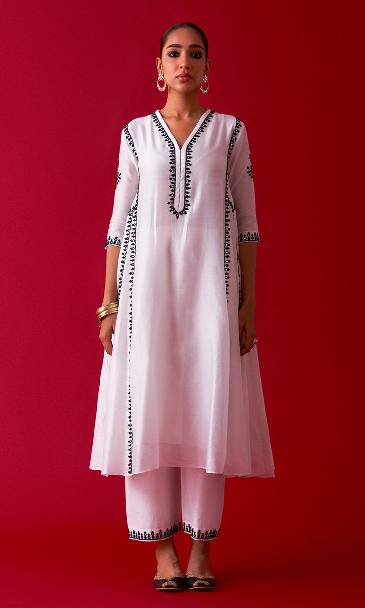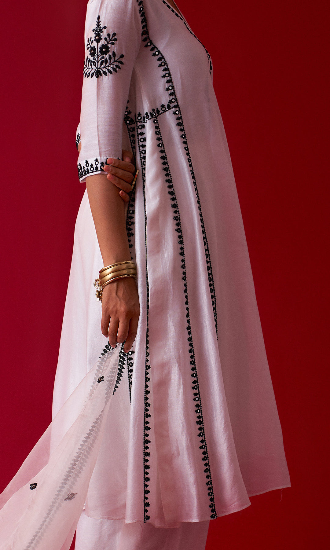 This set includes aari embroidered Choga Palazzo and Dupatta. The set is embellished with resham, sequins, beads, mirror and nakshi work. Palazzo has embroidery work at bottom. Embroidered Dupatta is embellished with lace.
