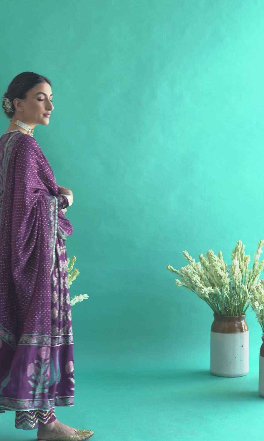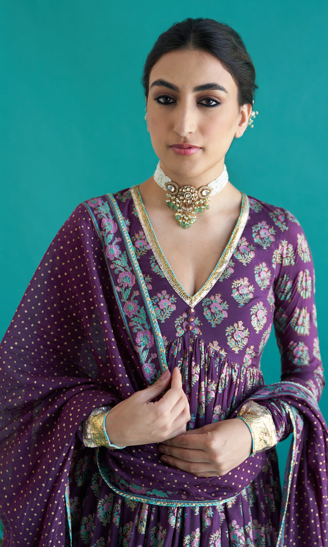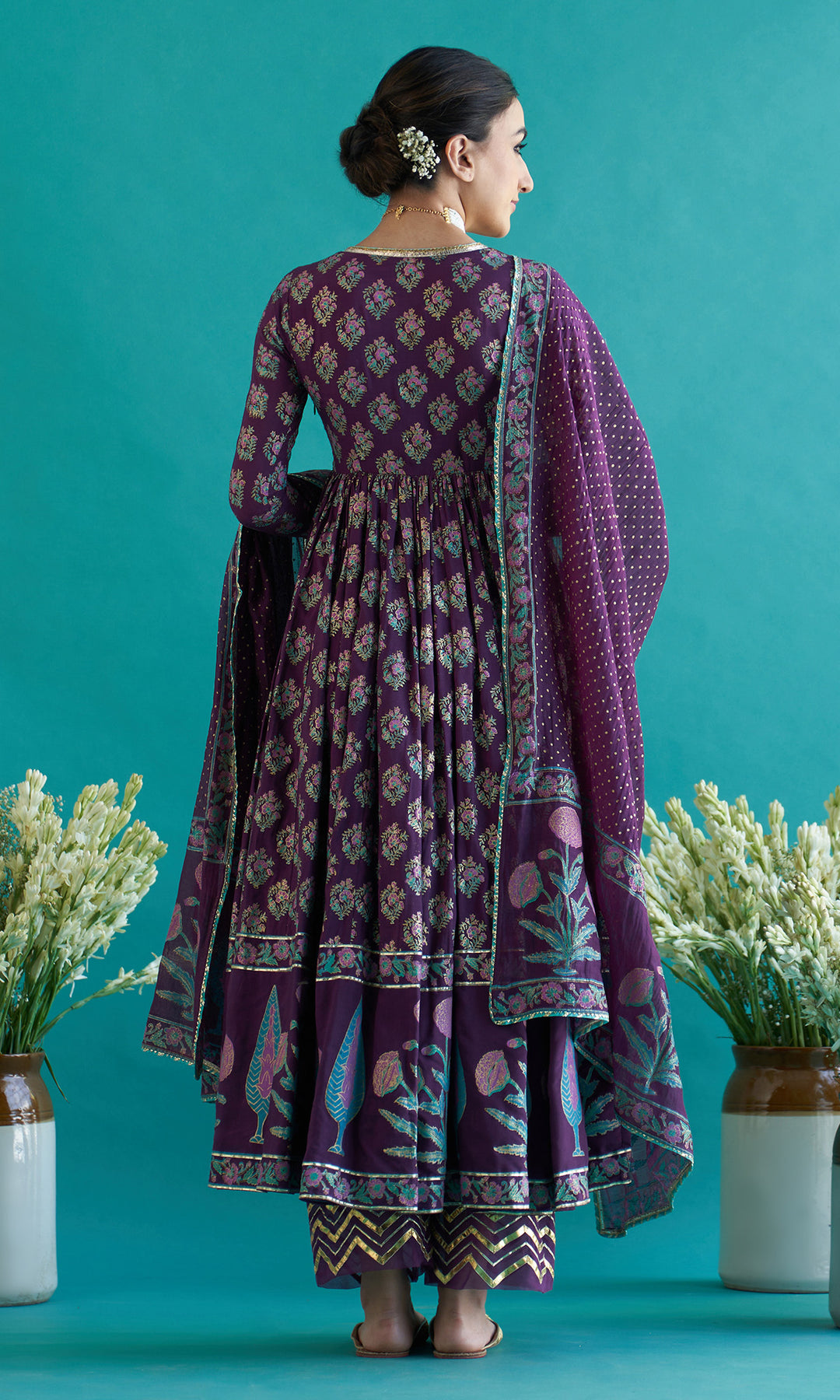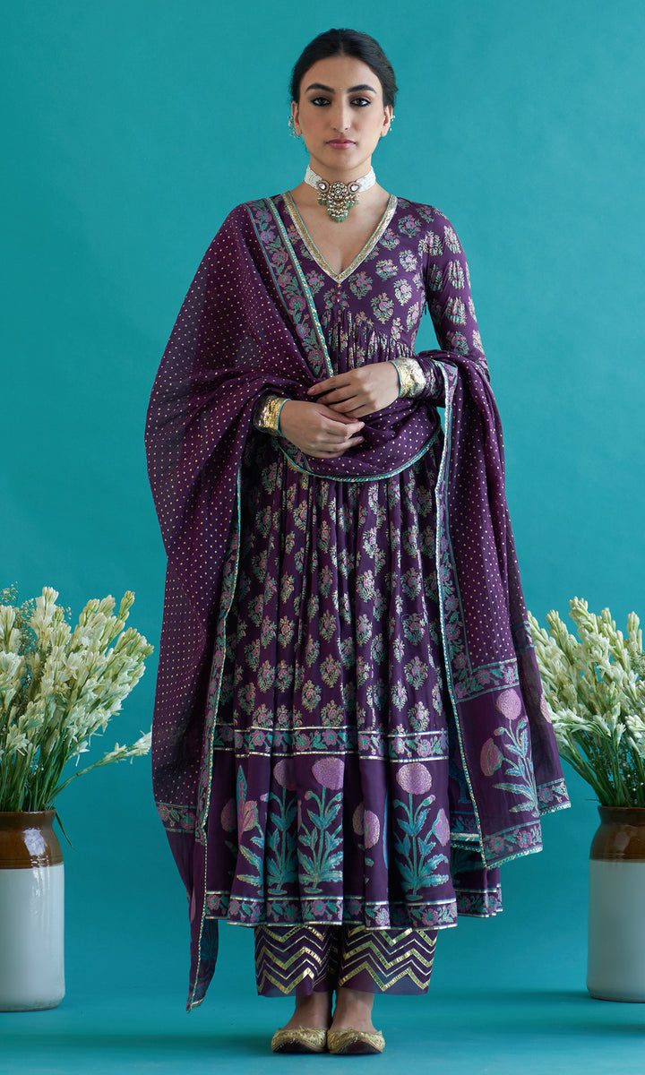 This set includes block printed anarkali, palazzo and dupatta. Kurta neck and sleeves are
