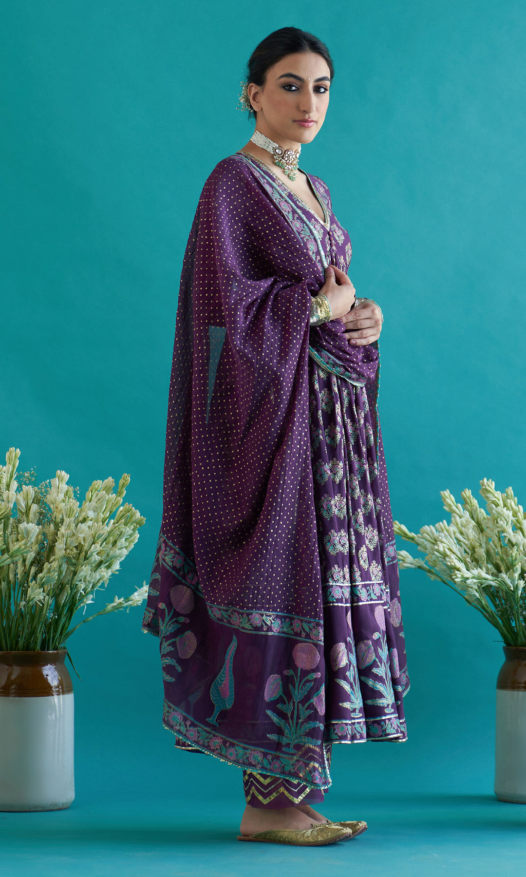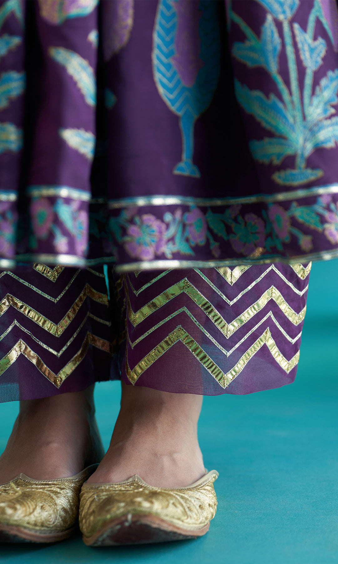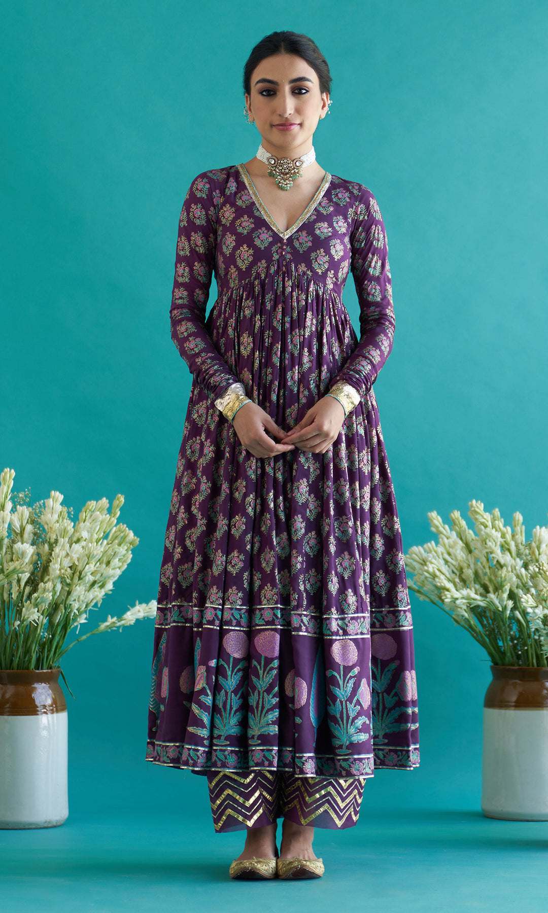 This set includes block printed anarkali, palazzo and dupatta. Kurta neck and sleeves are