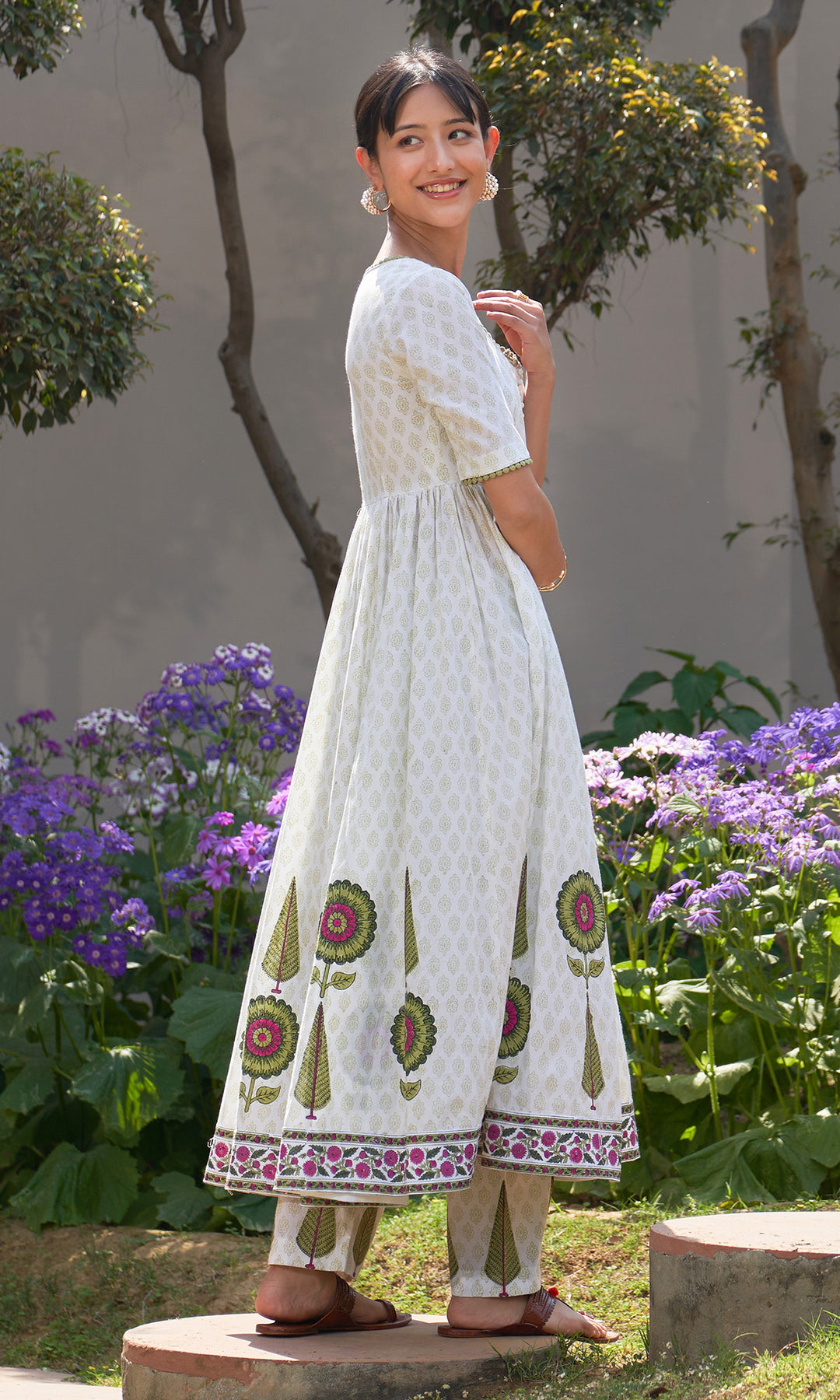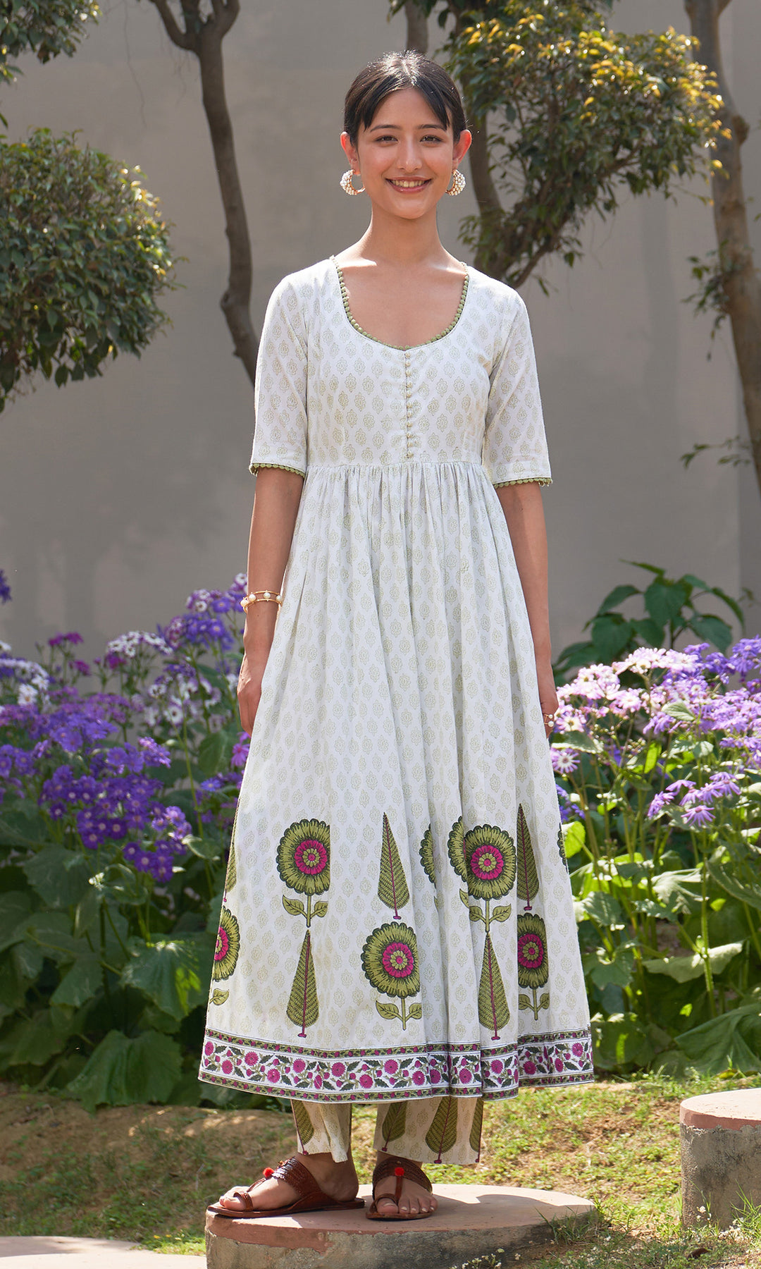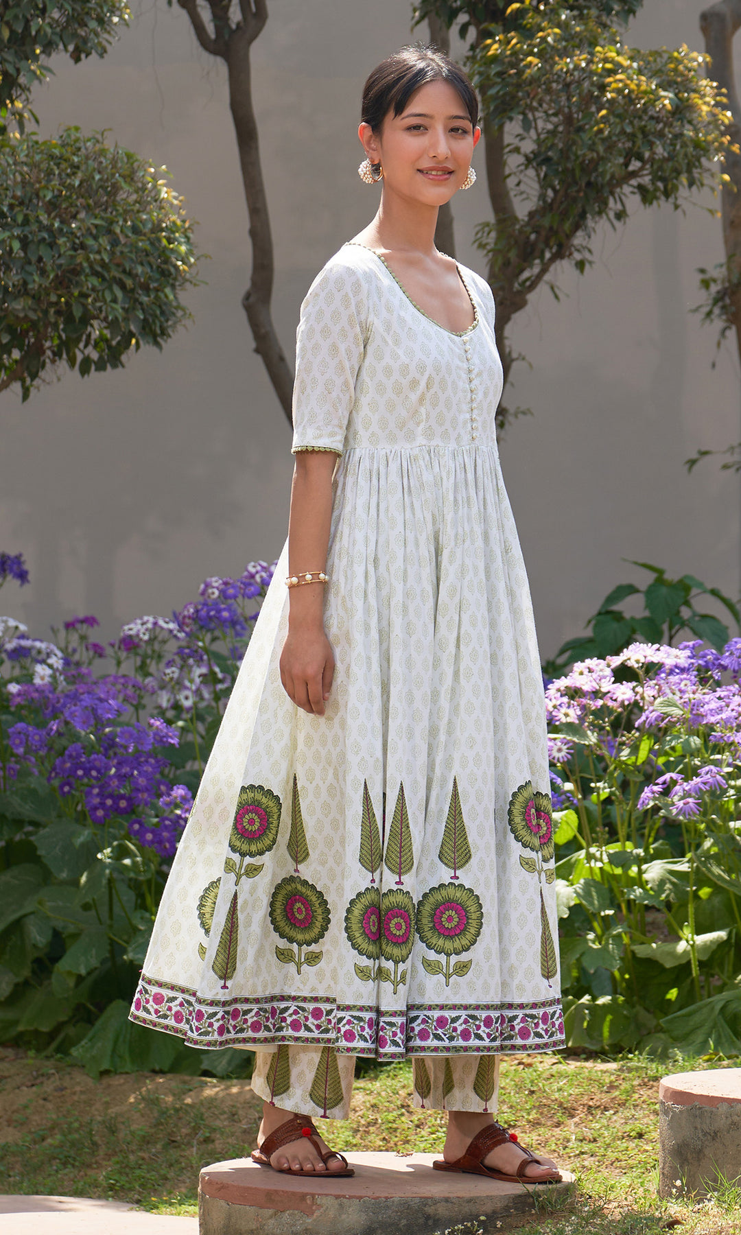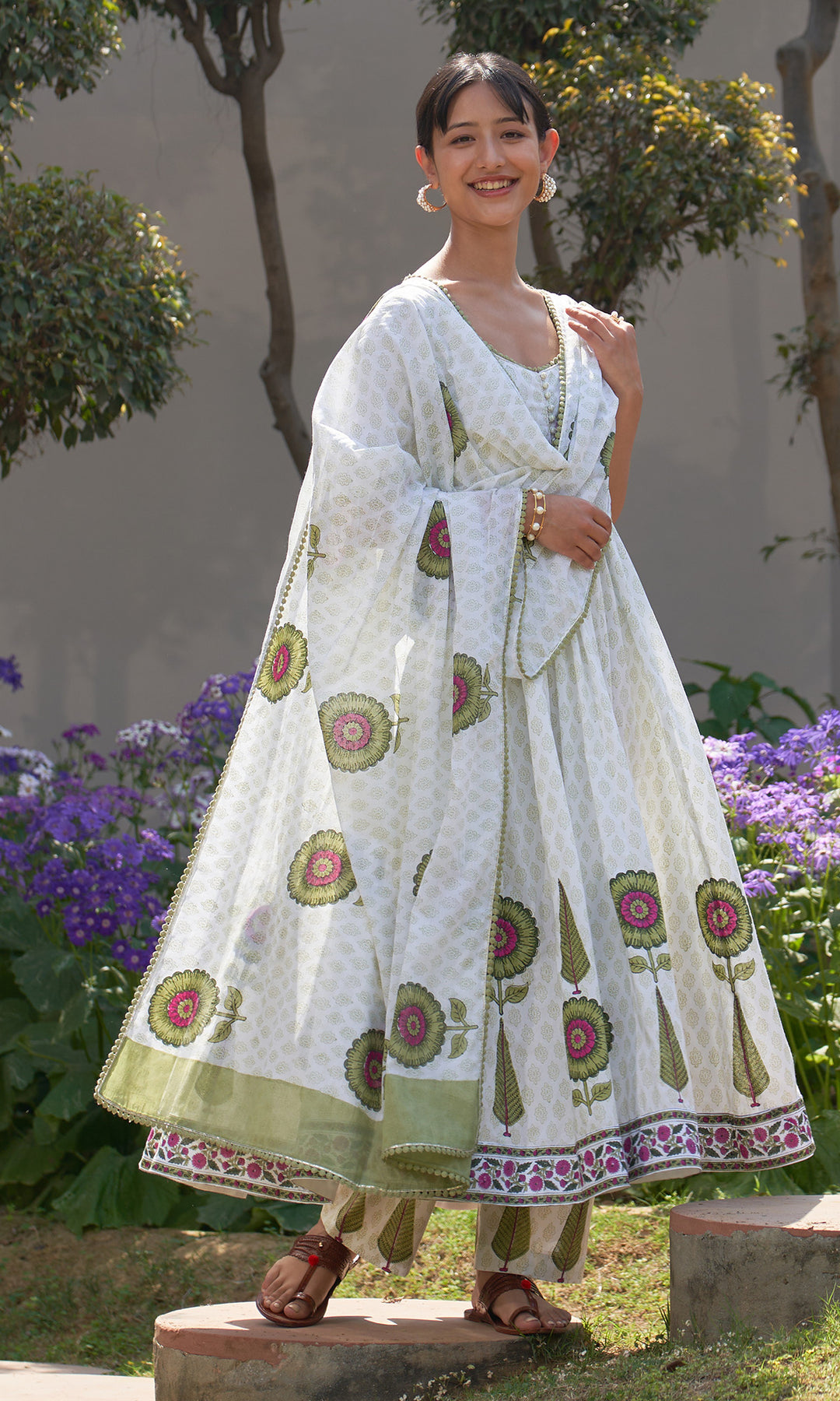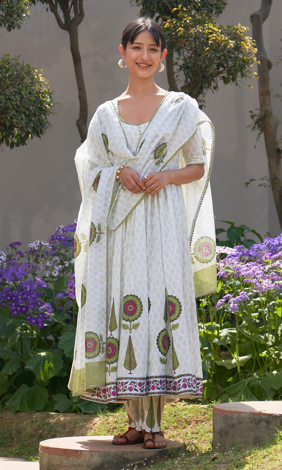 Summer Block Prints Ivory Anarkali With Palazzo And Dupatta (Set Of 3)