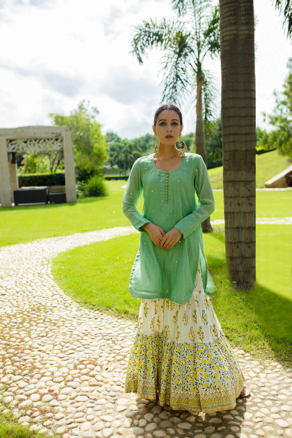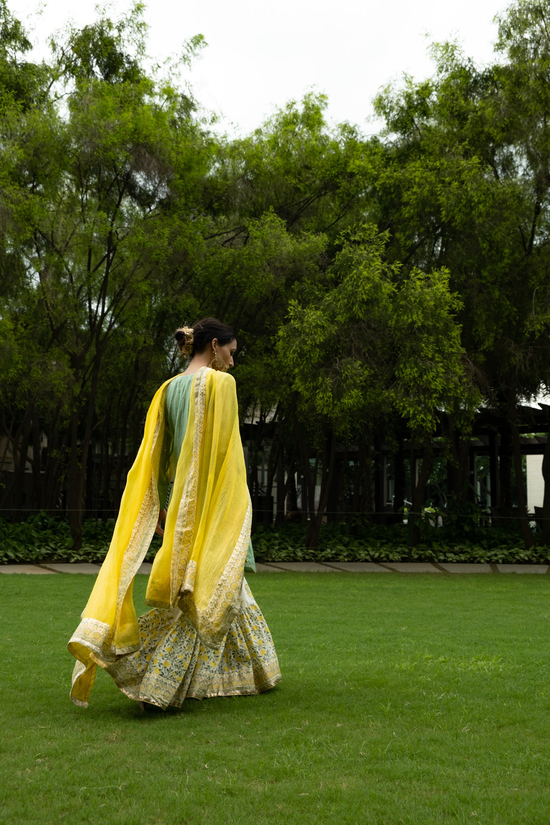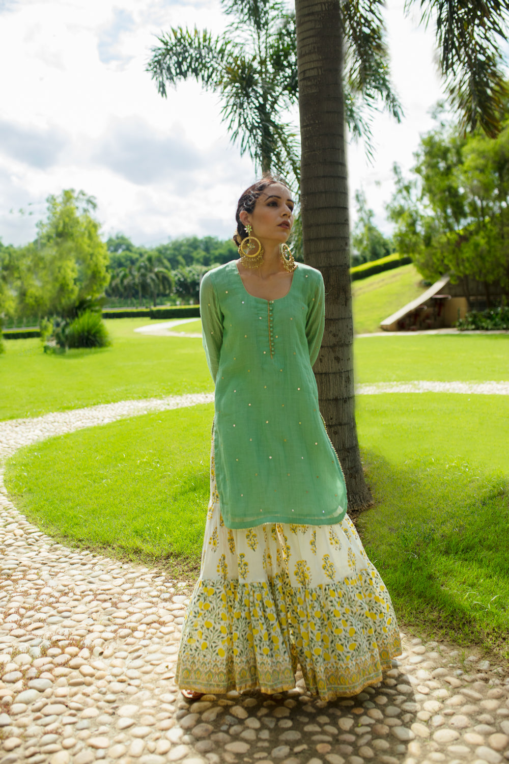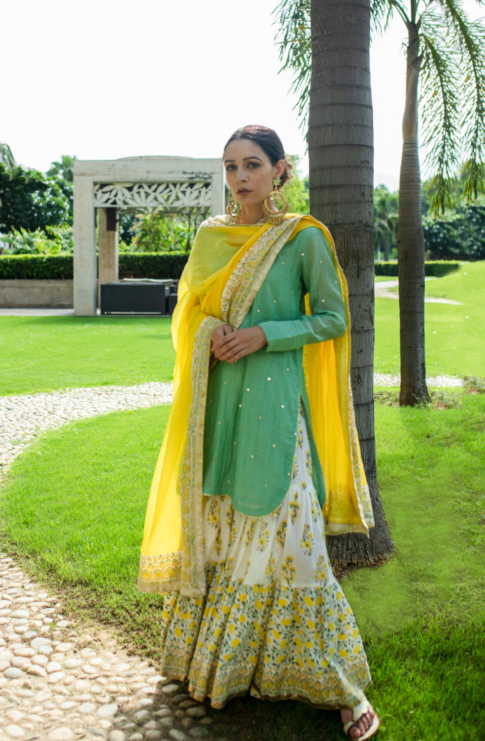 Green chanderi kurta with mirror detailing. Yellow Jaal & Booti Block printed cotton Sharara. Yellow chanderi dupatta with block printed border and gota detailing.