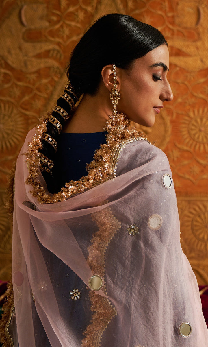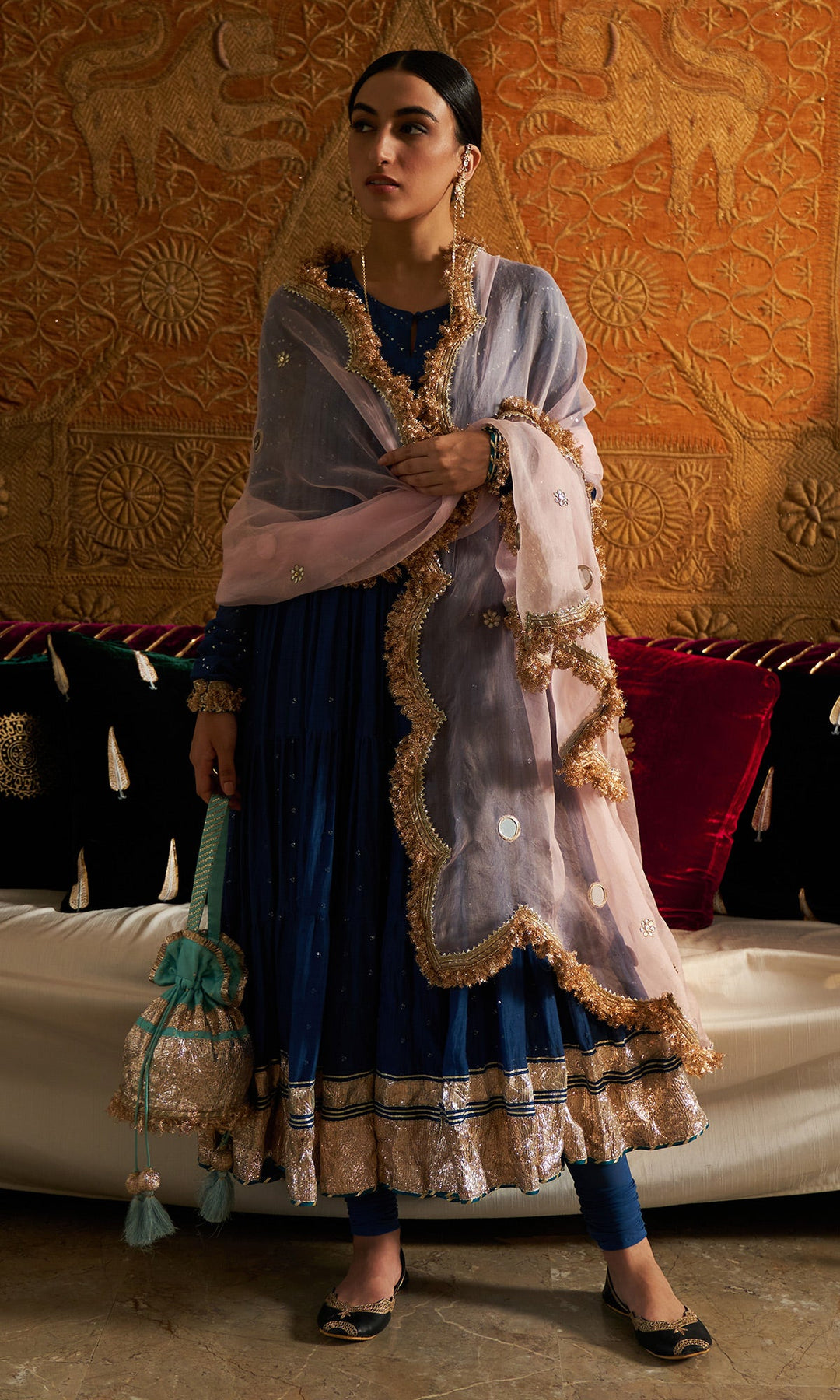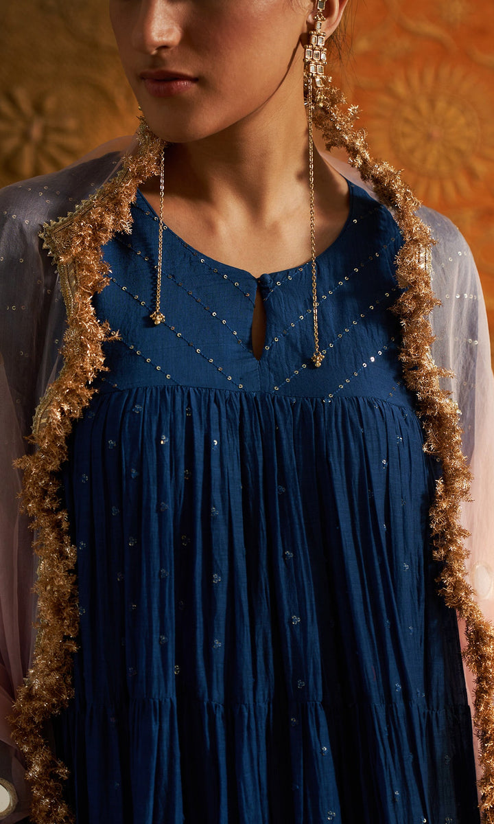 This set includes tiered anarkali, chooridar and dupatta. Anarkali has keyhole at the frontand finished with gota and magzi. Sleeves has gota and jhallar detailing. It comes with chooridar. Dupatta has mirror and gota work and finished with lace.