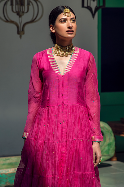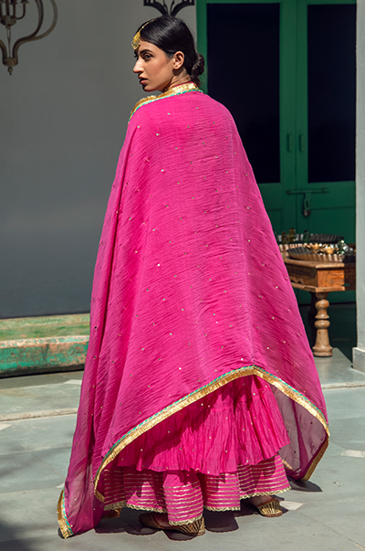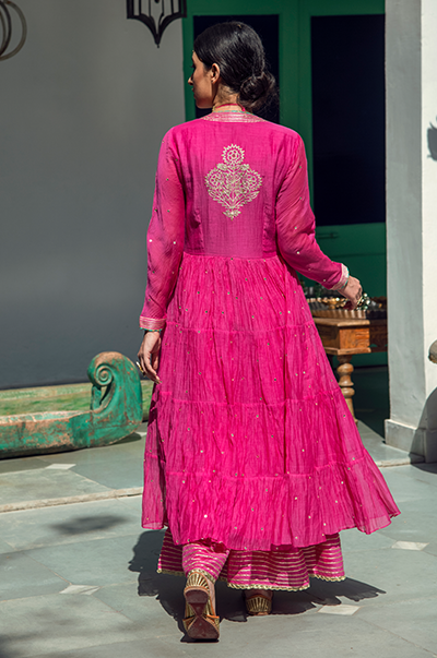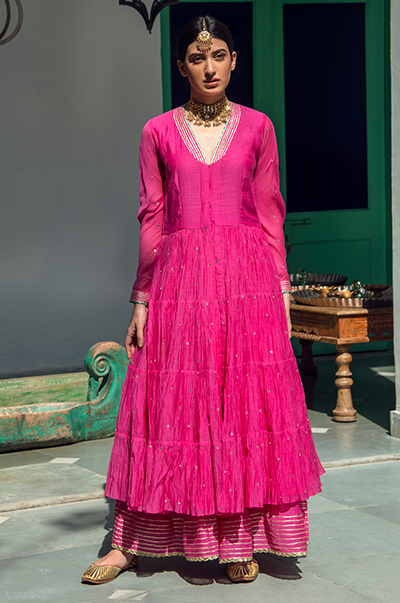 Rani gathered Anarkali with back embroidery detailing. Flared palazzo with gota and lace fininshing. chanderi dupatta with gota and gold fringe lace finishings.