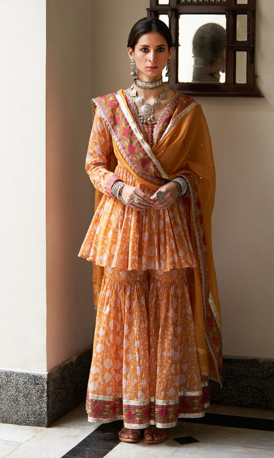 Chandani block printed mustard anarkali with sharara and dupatta (set of 3)