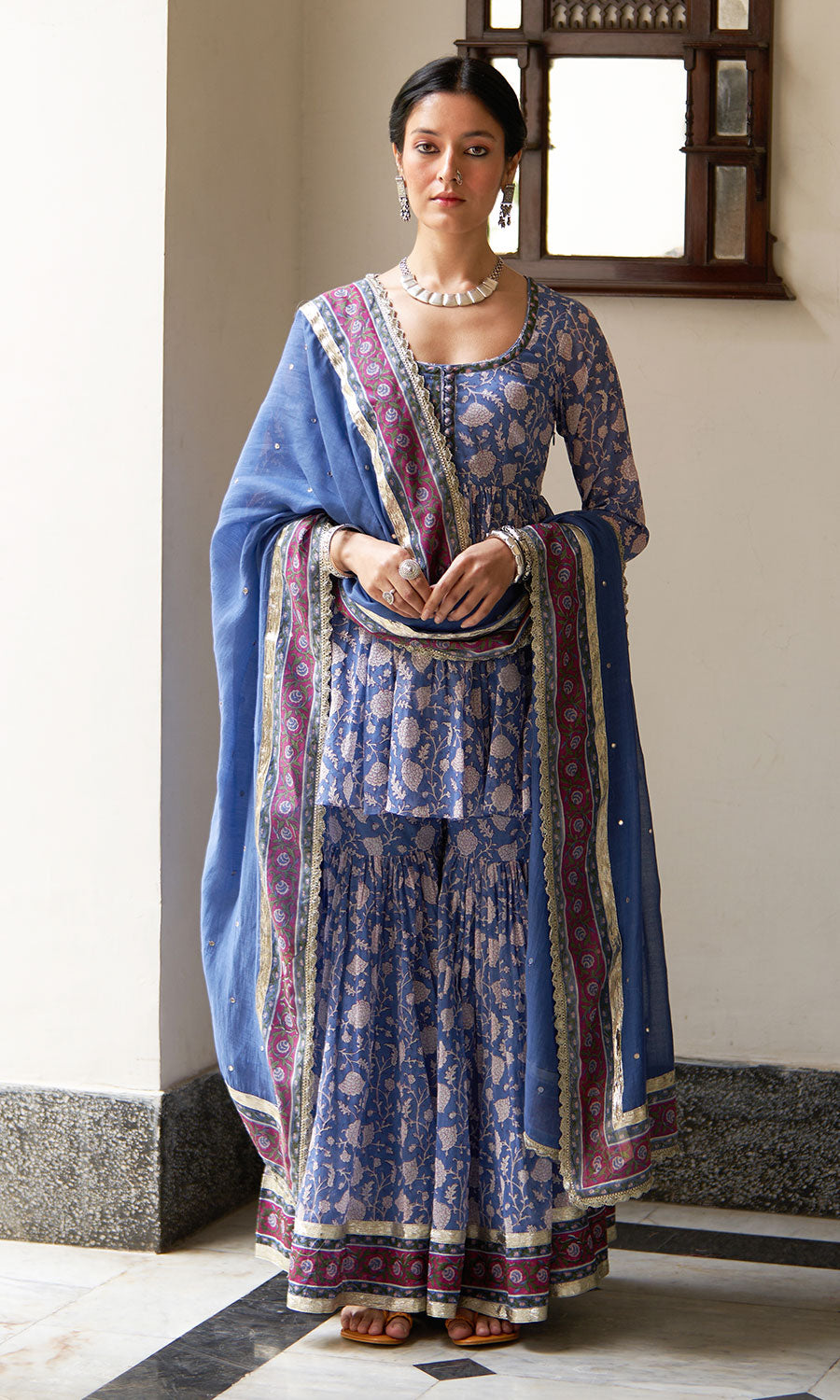 Chandani block printed blue anarkali with sharara and dupatta (set of 3)