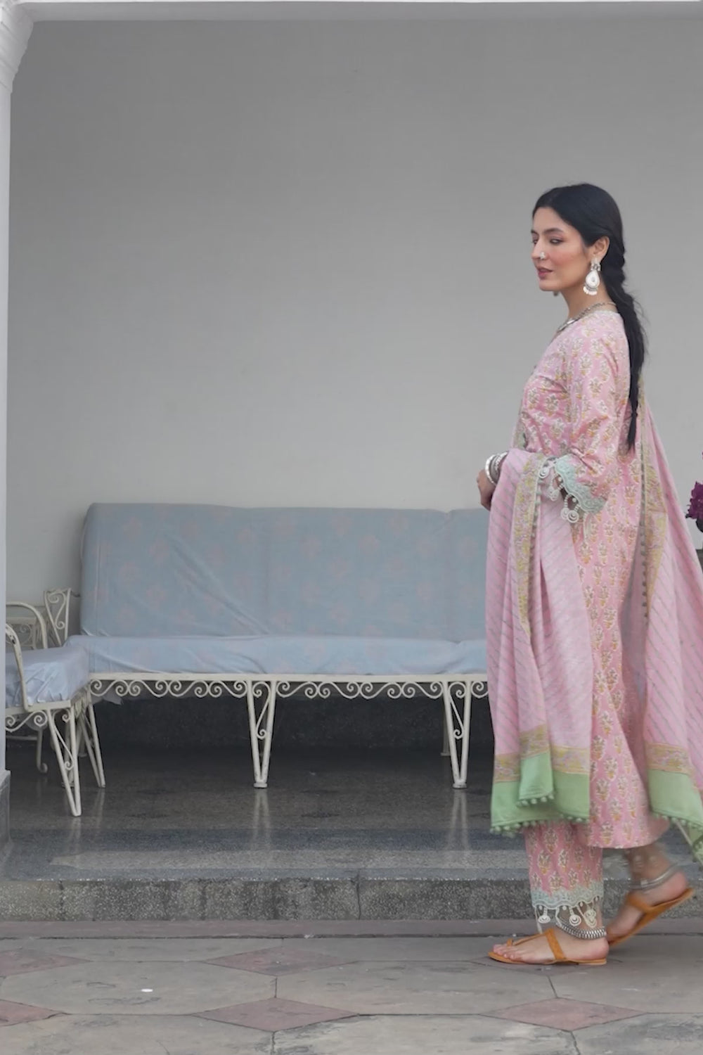 chandani dusty pink block print lace gota kurta with palazzo and dupatta (set of 3)