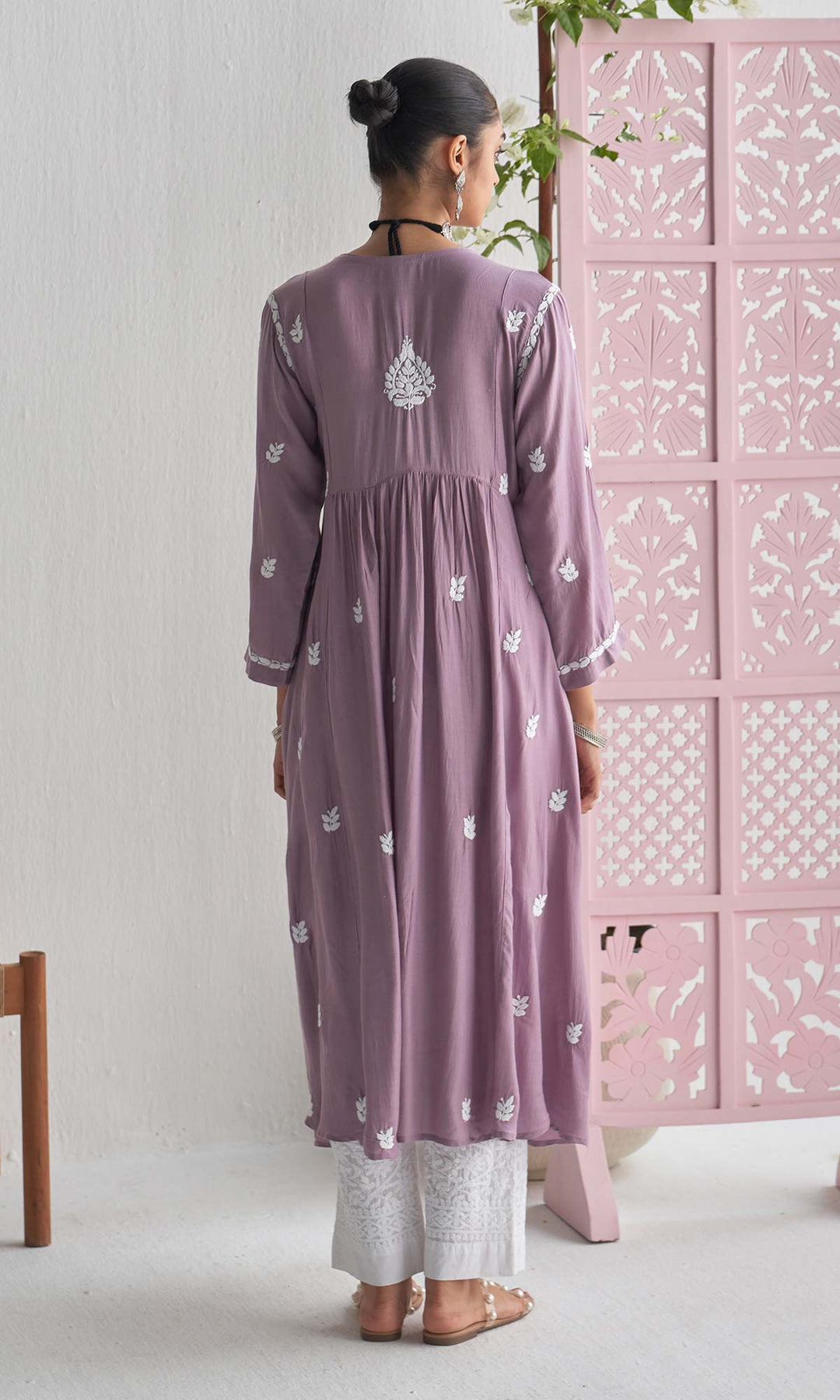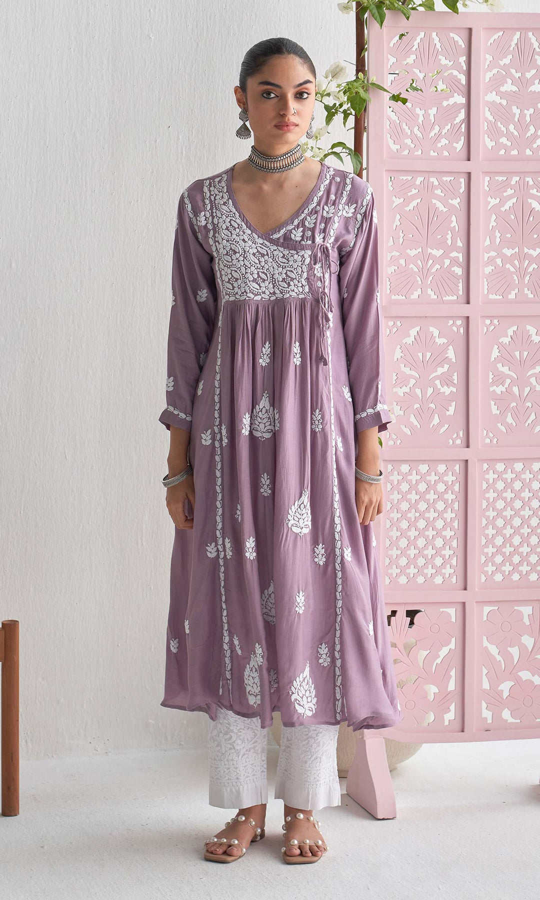 This is a Angrakha Long Kurta with Chikankari hand embroidery