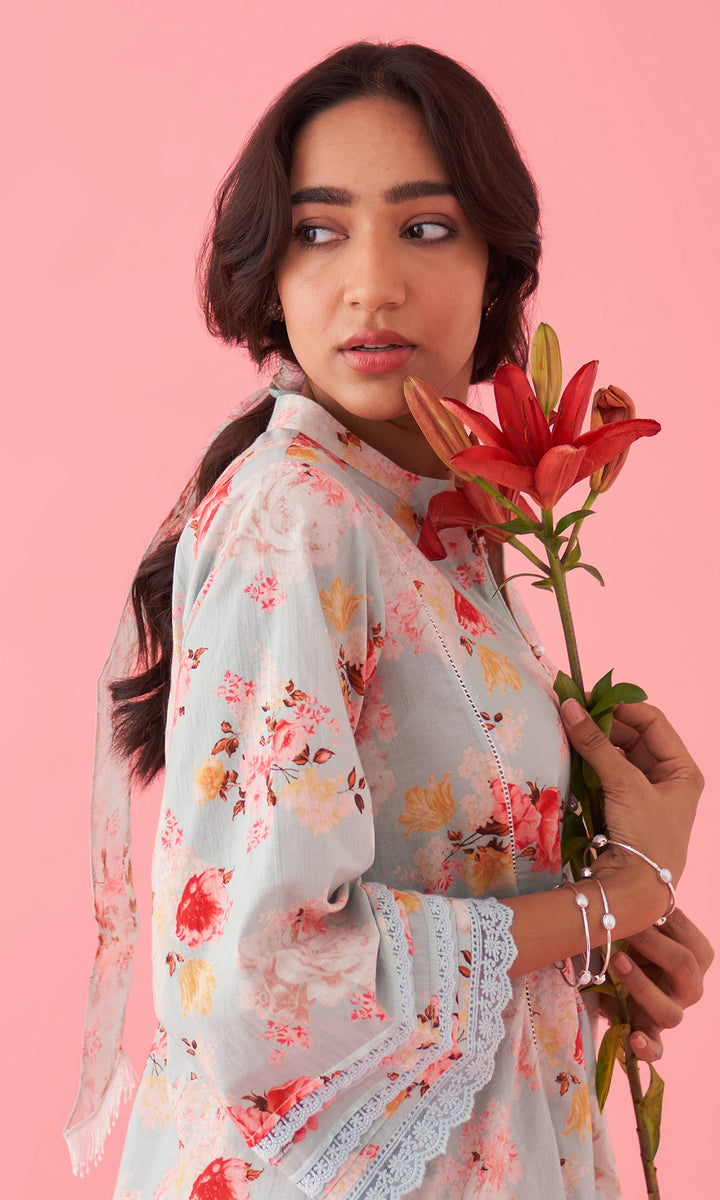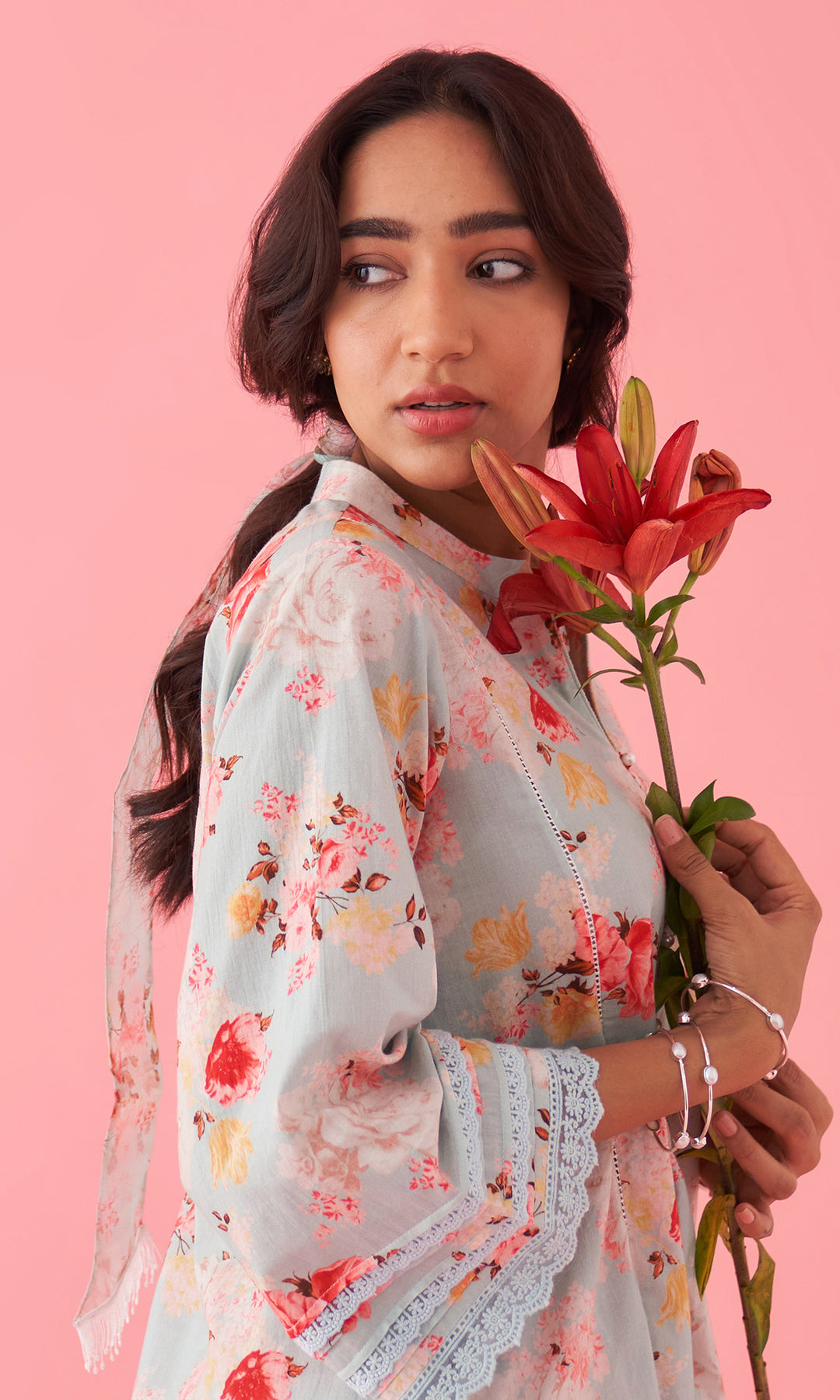 This set includes floral printed a line chinese collar kurta and palazzo. Kurta is embellished with beading lace at princess line, neck is embellished with pearls. Sleeves are accentuated with pleates design adorned with lace. Kurta has pockets. It comes with palazzo with delicate lace at bottom.