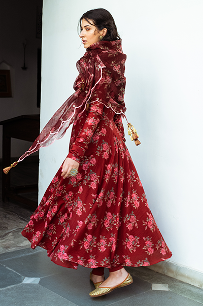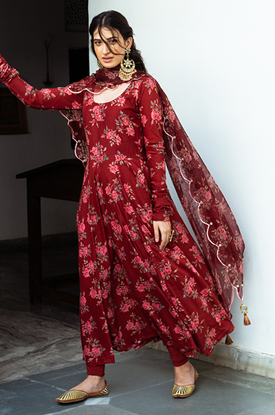 Bhanvara Deep Red printed Anarkali with chooridar and dupatta- set of 3