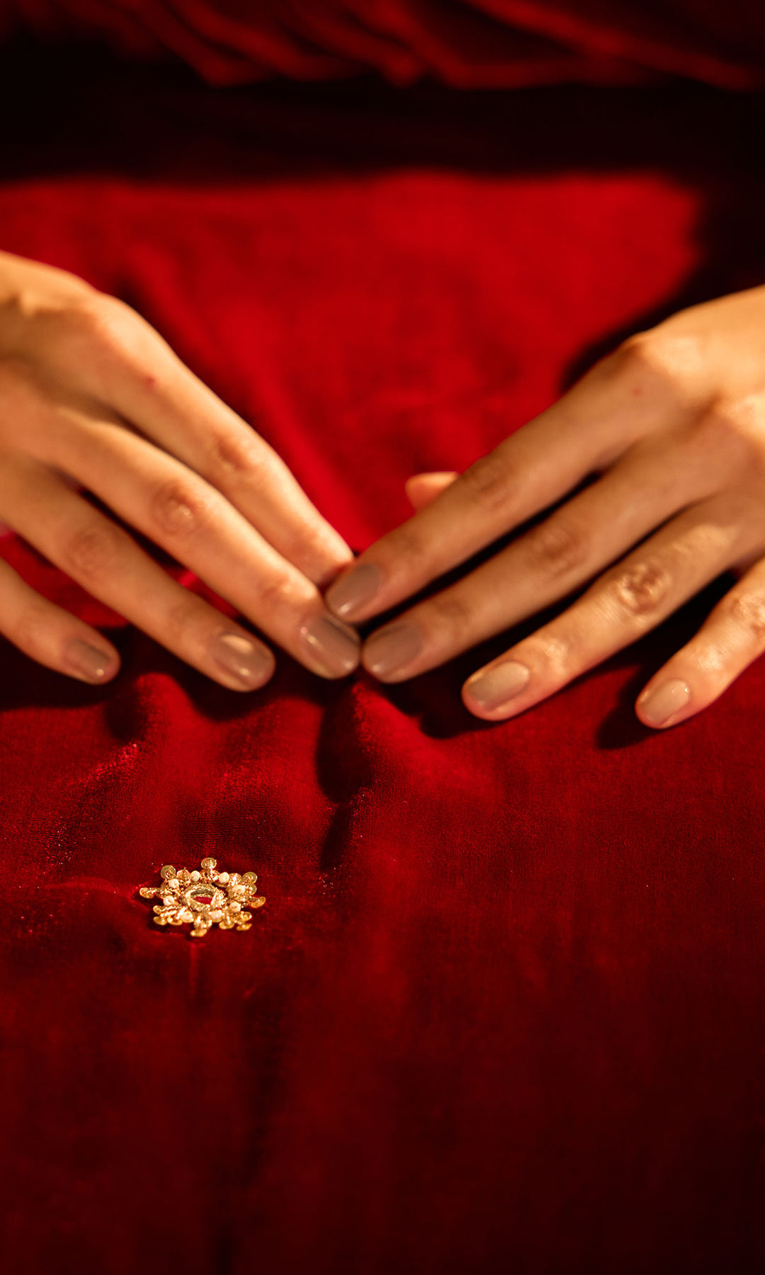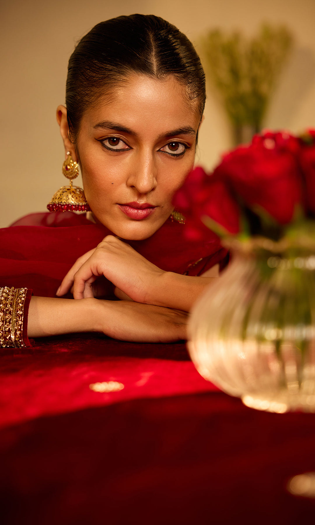 This set includes silk velvet anarkali with silk velvet palazzo and dupatta. The set is detailed with hand embroidery .