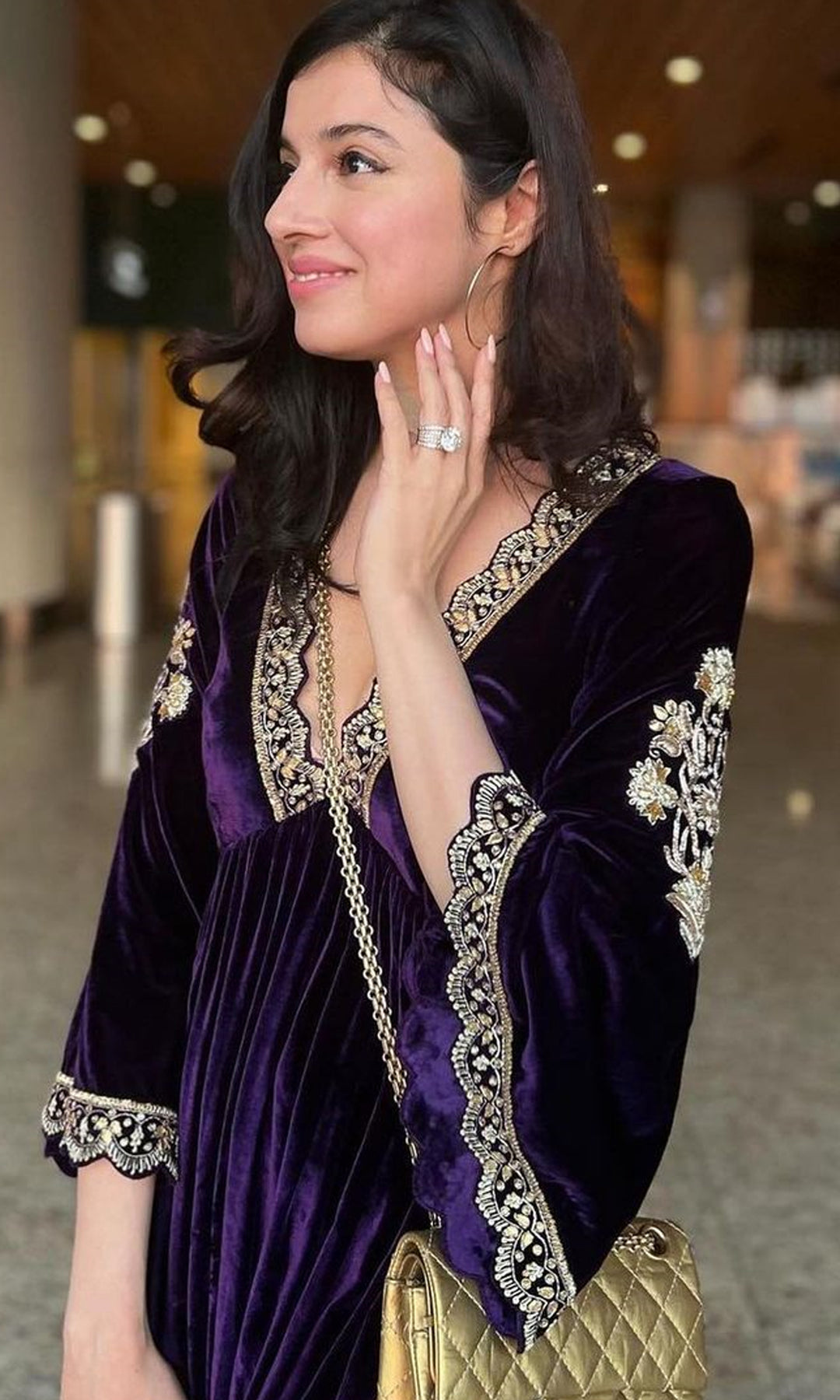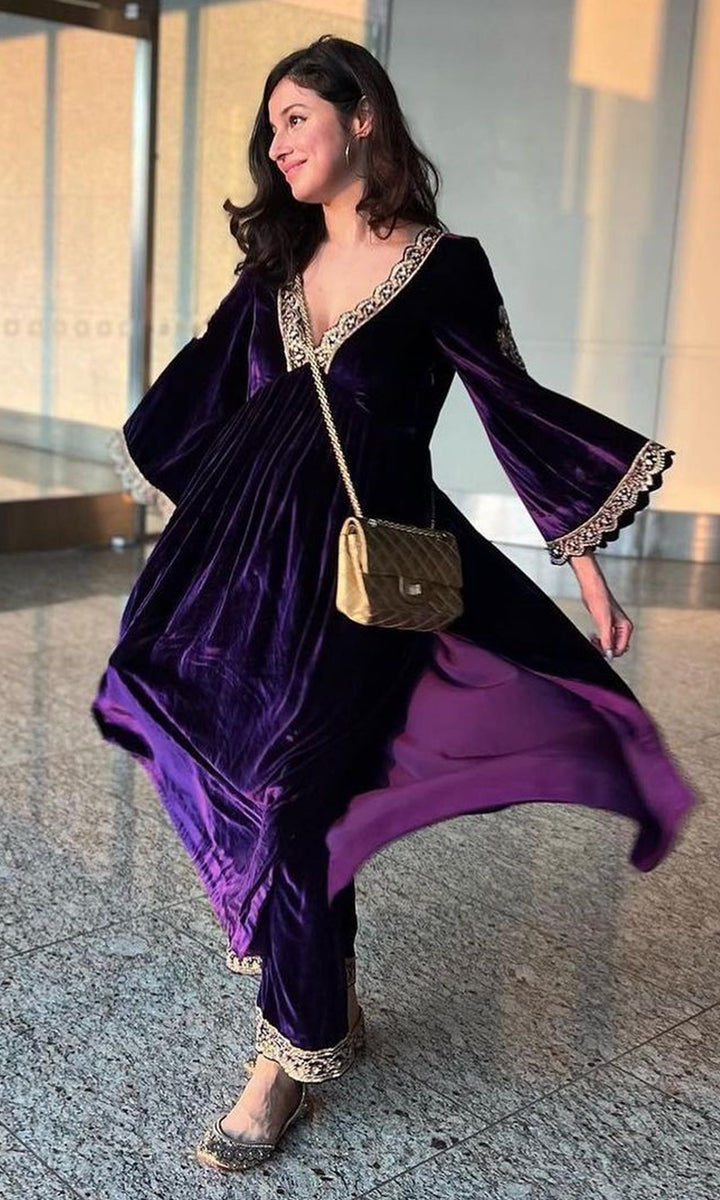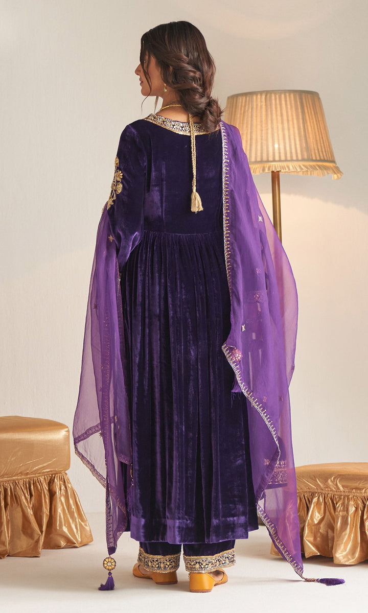 Divya Khosla Kumar in Khizaan Embroidered Purple V Neck velvet Anarkali set with organza dupatta  set of 3