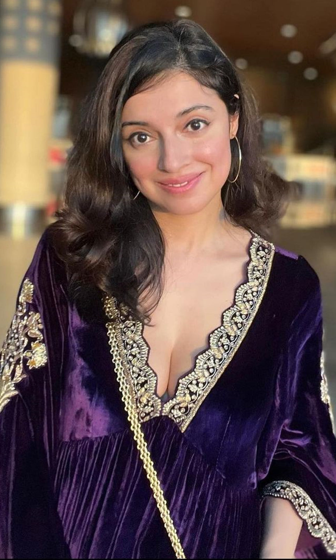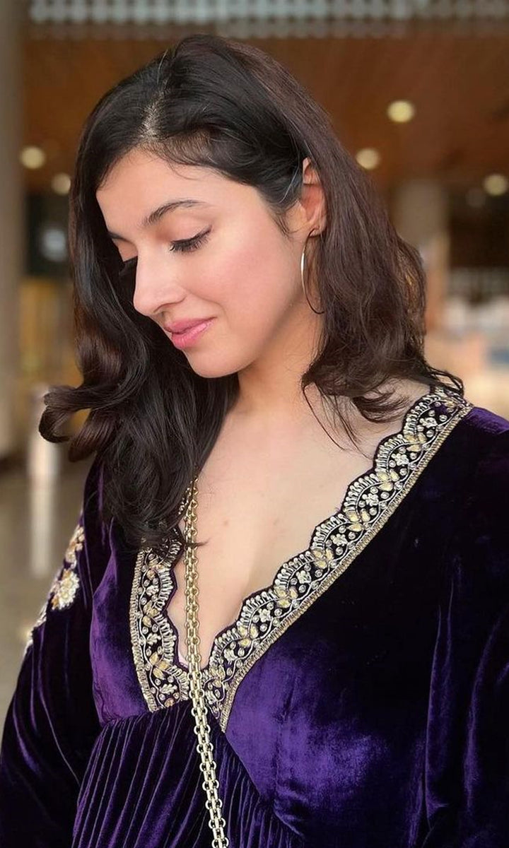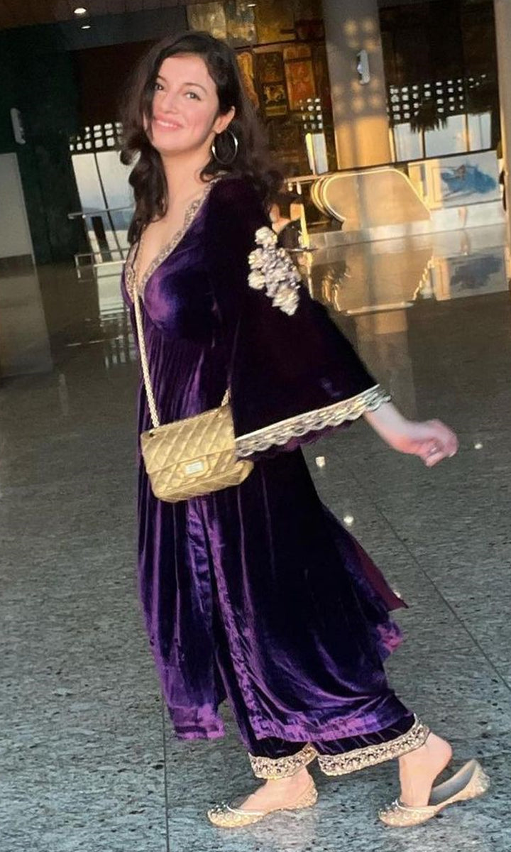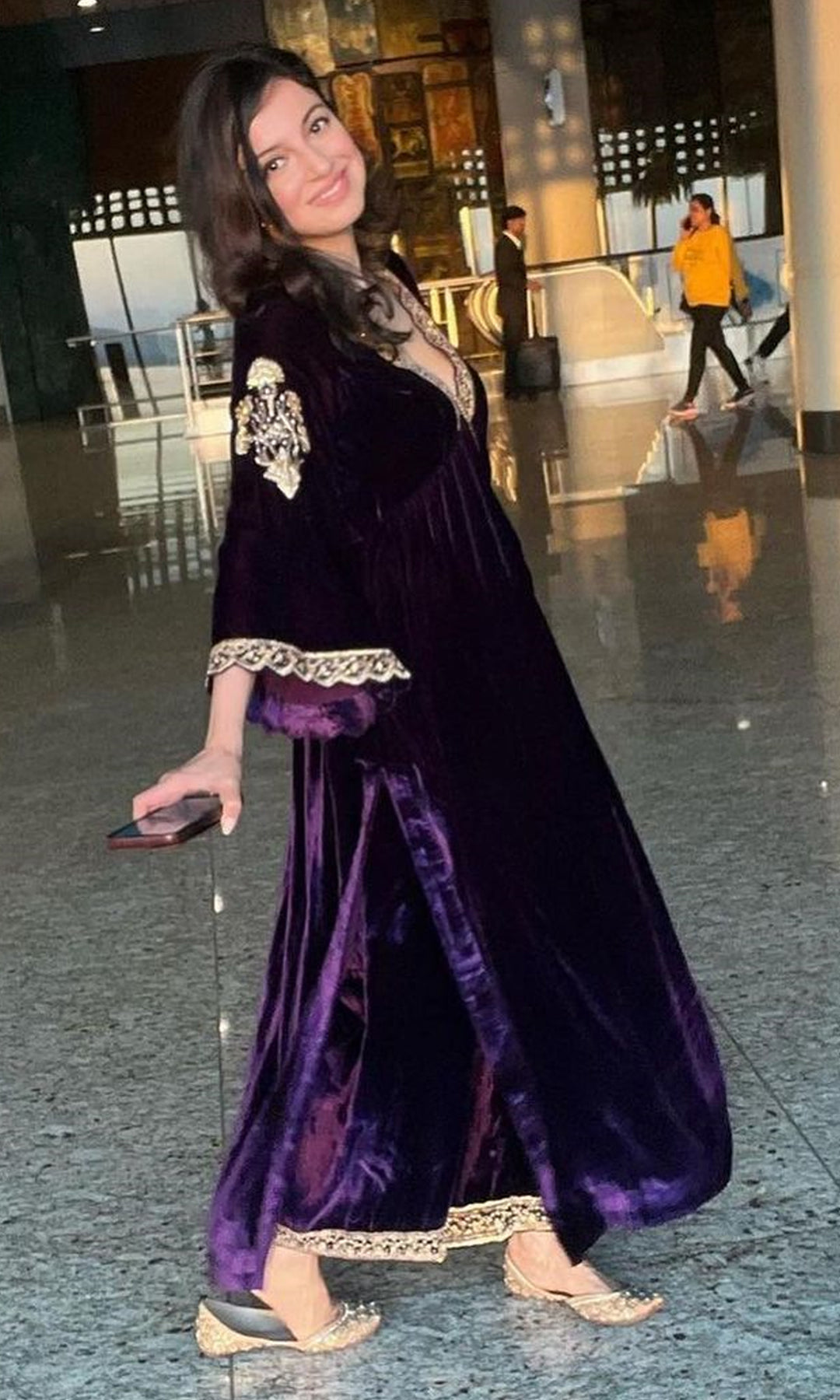 Divya Khosla Kumar in Khizaan Embroidered Purple V Neck velvet Anarkali set with organza dupatta set of 3