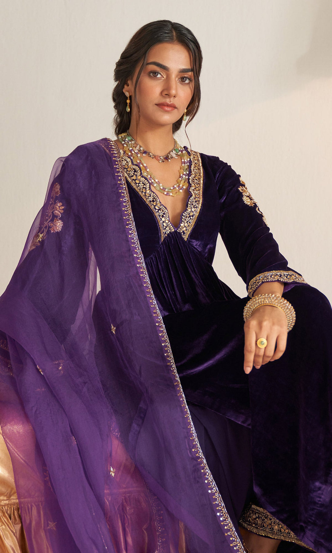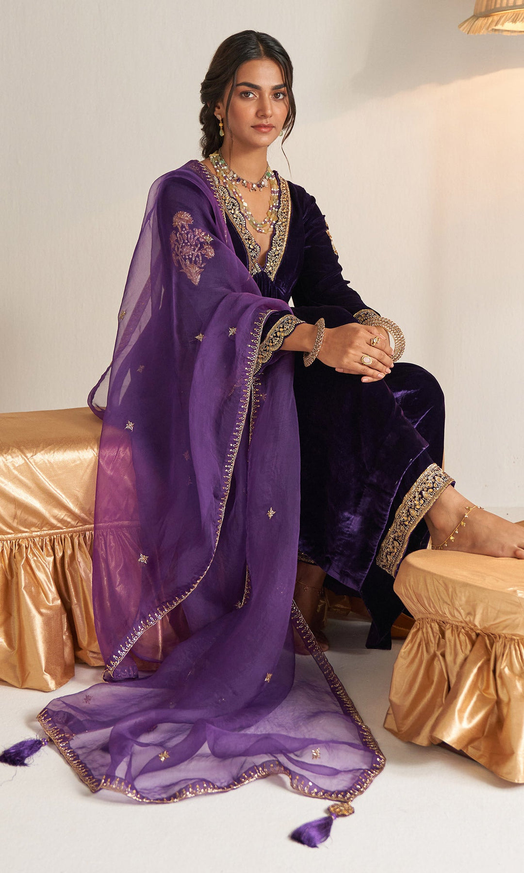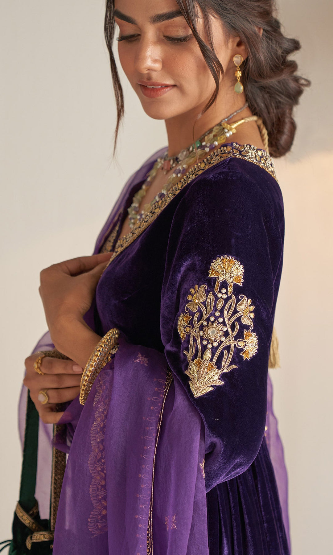 • FABRIC USED: Anarkali- Silk Velvet lined with shantoon , Palazzo - Silk Velvet , Dupatta - Organza Silk
