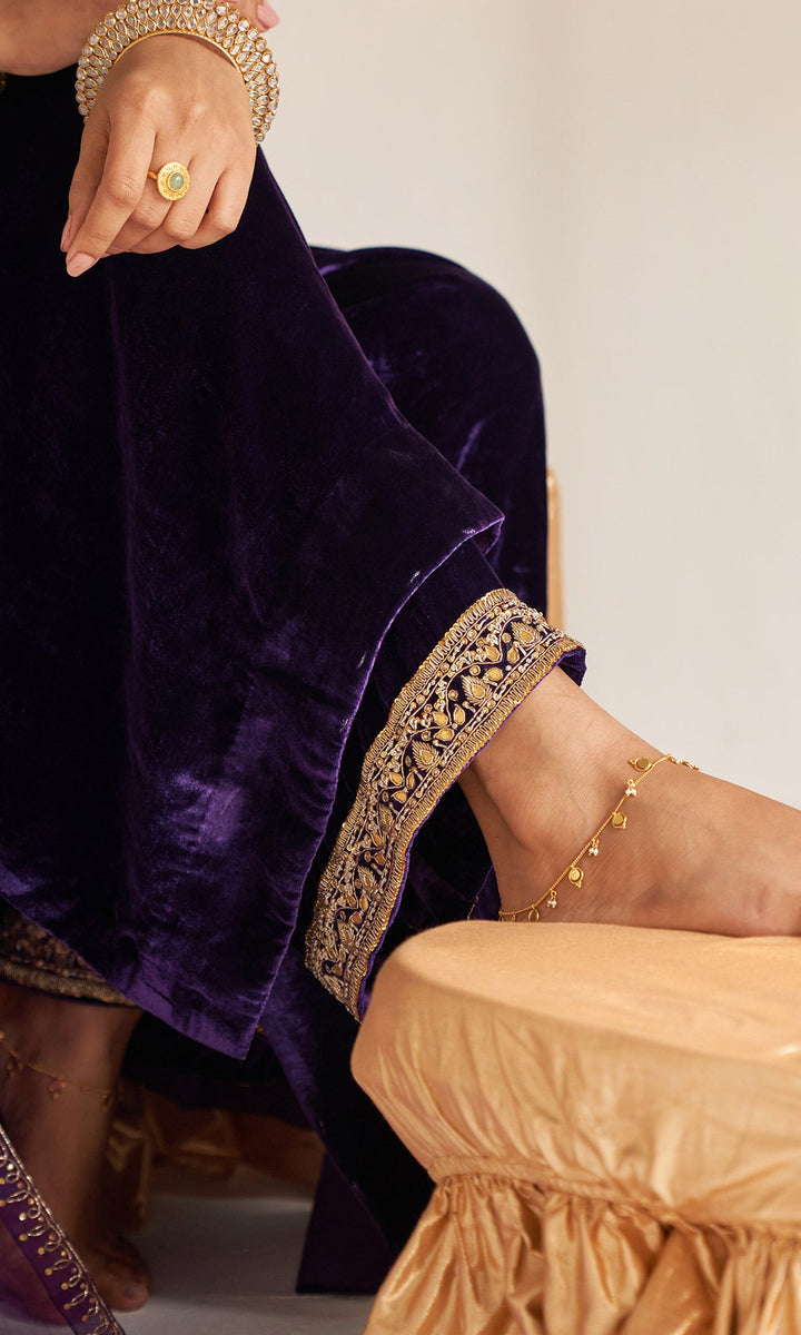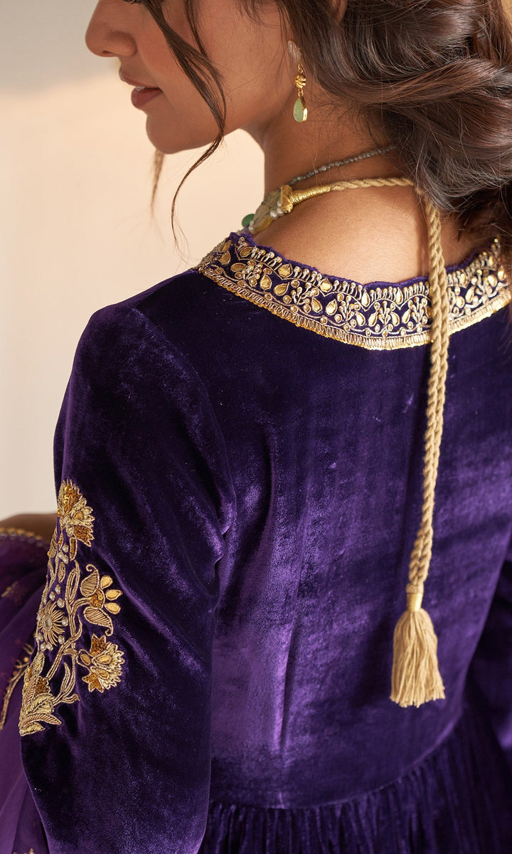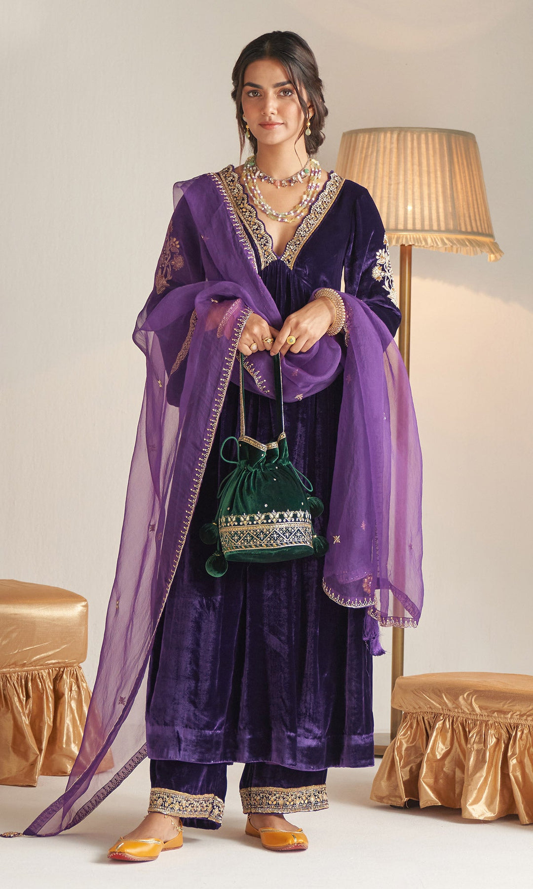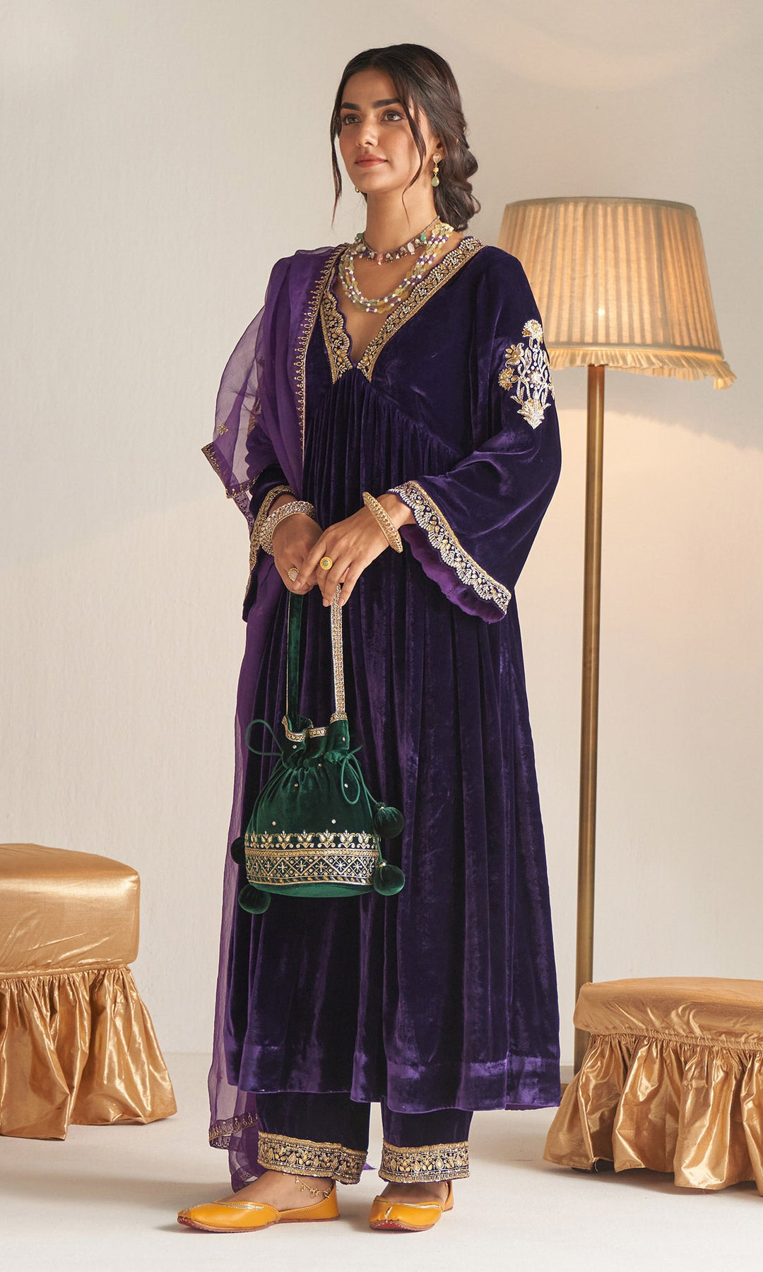 • FABRIC USED: Anarkali- Silk Velvet lined with shantoon , Palazzo - Silk Velvet , Dupatta - Organza Silk